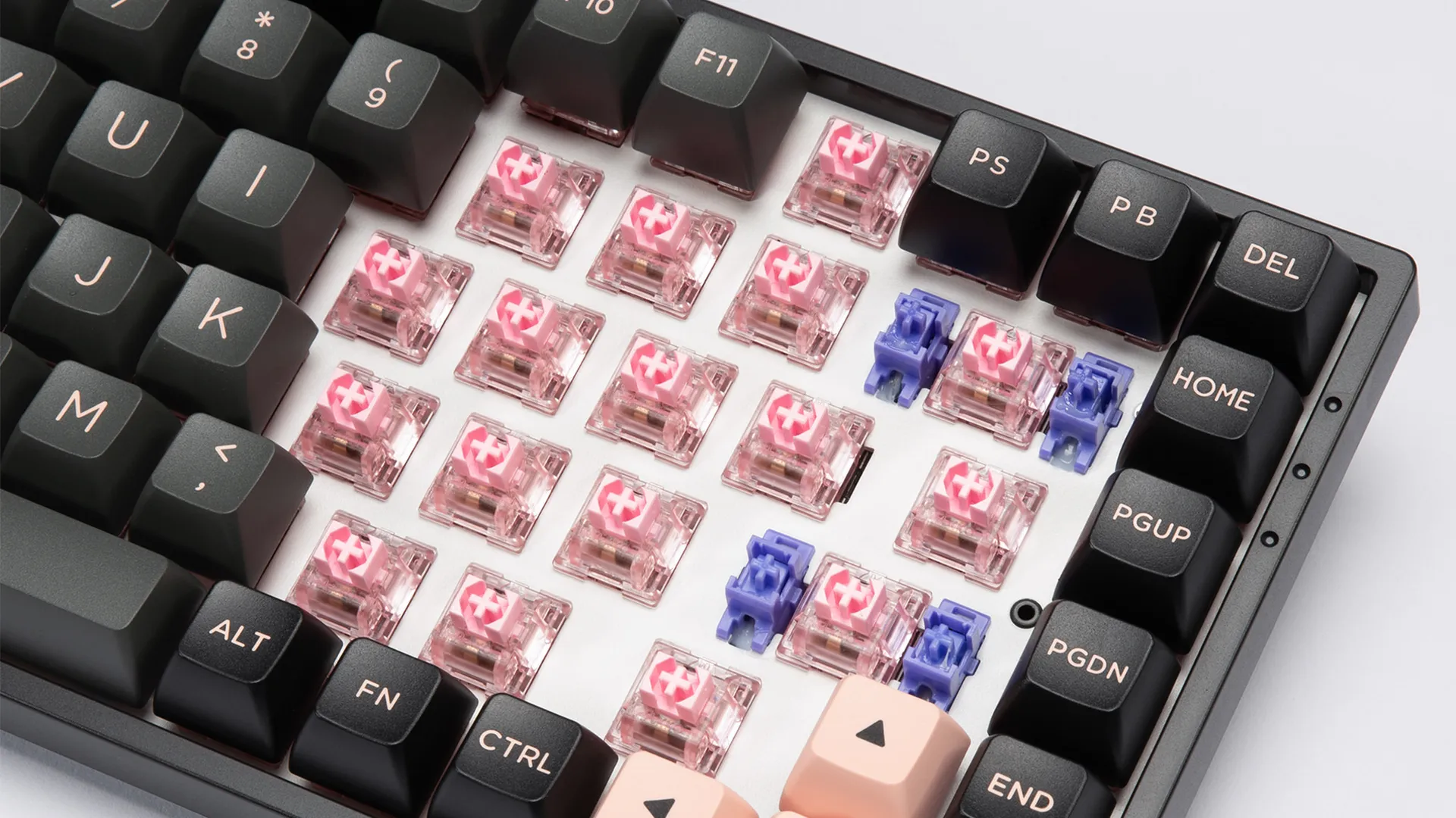 Специальные сокеты позволяют менять переключатели без паяльника. Для этой клавиатуры подходят стандартные Cherry-подобные переключатели.
