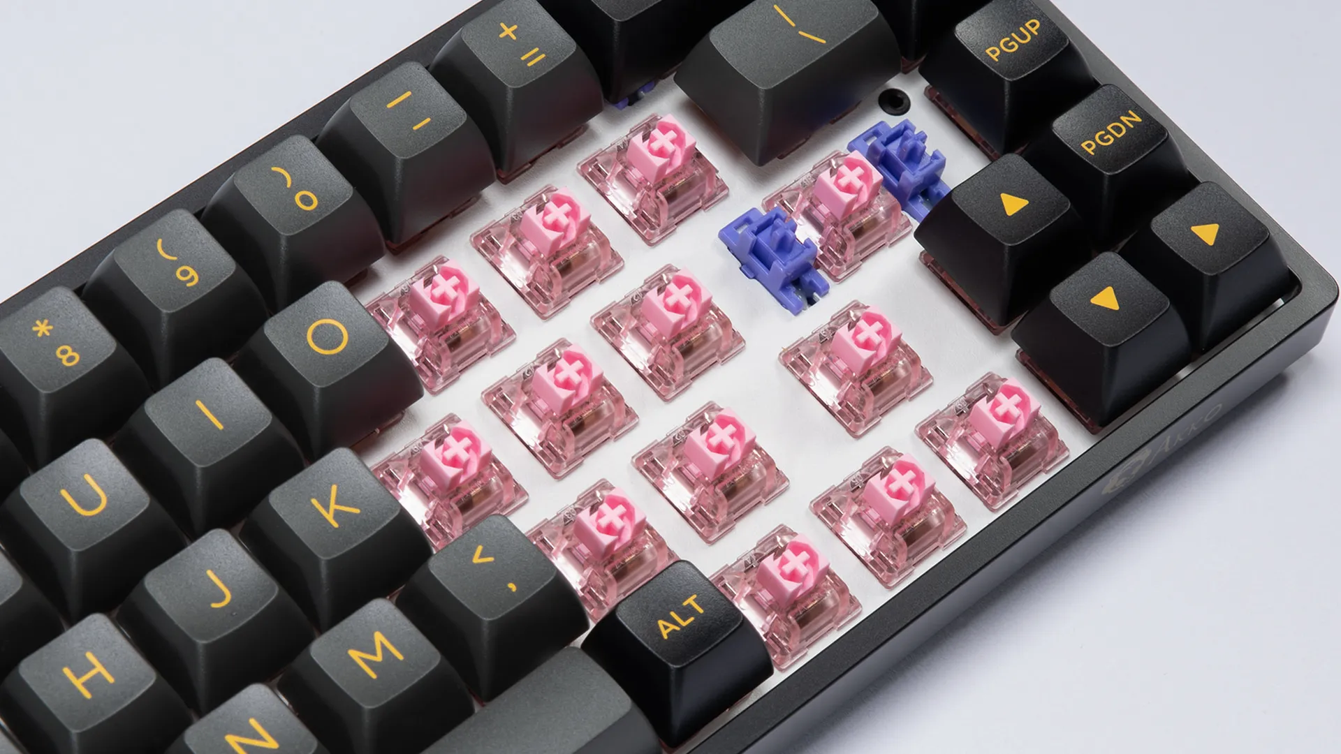 Специальные сокеты позволяют менять переключатели без паяльника. Для этой клавиатуры подходят стандартные Cherry-подобные переключатели.