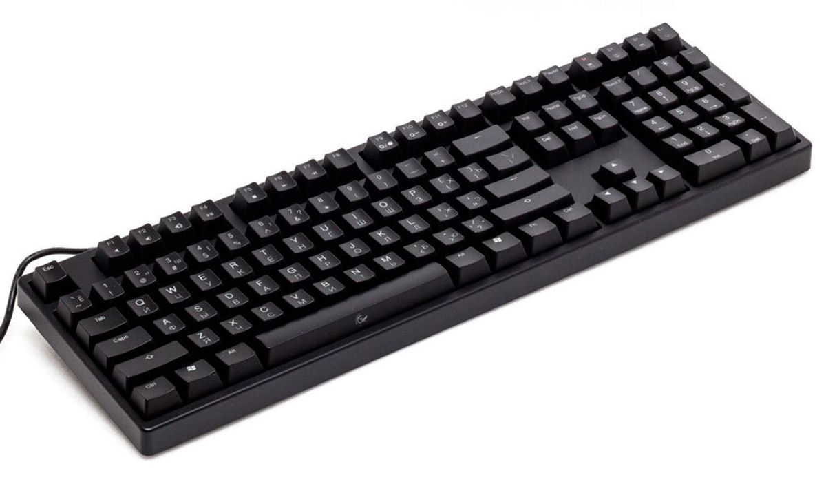 Раскладка ASCII 104 + 4 с русской гравировкой. Имеет 3 режима подсветки.
