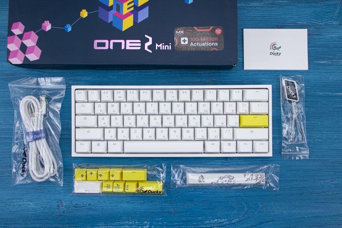 Ducky One 2 Mini RGB White с гравировкой. Попали на барахолку, потому что новые модели уже идут с русскими символами и мы распродаём остатки с гравировкой. Дополнительные клавиши в комплекте случайного цвета.
