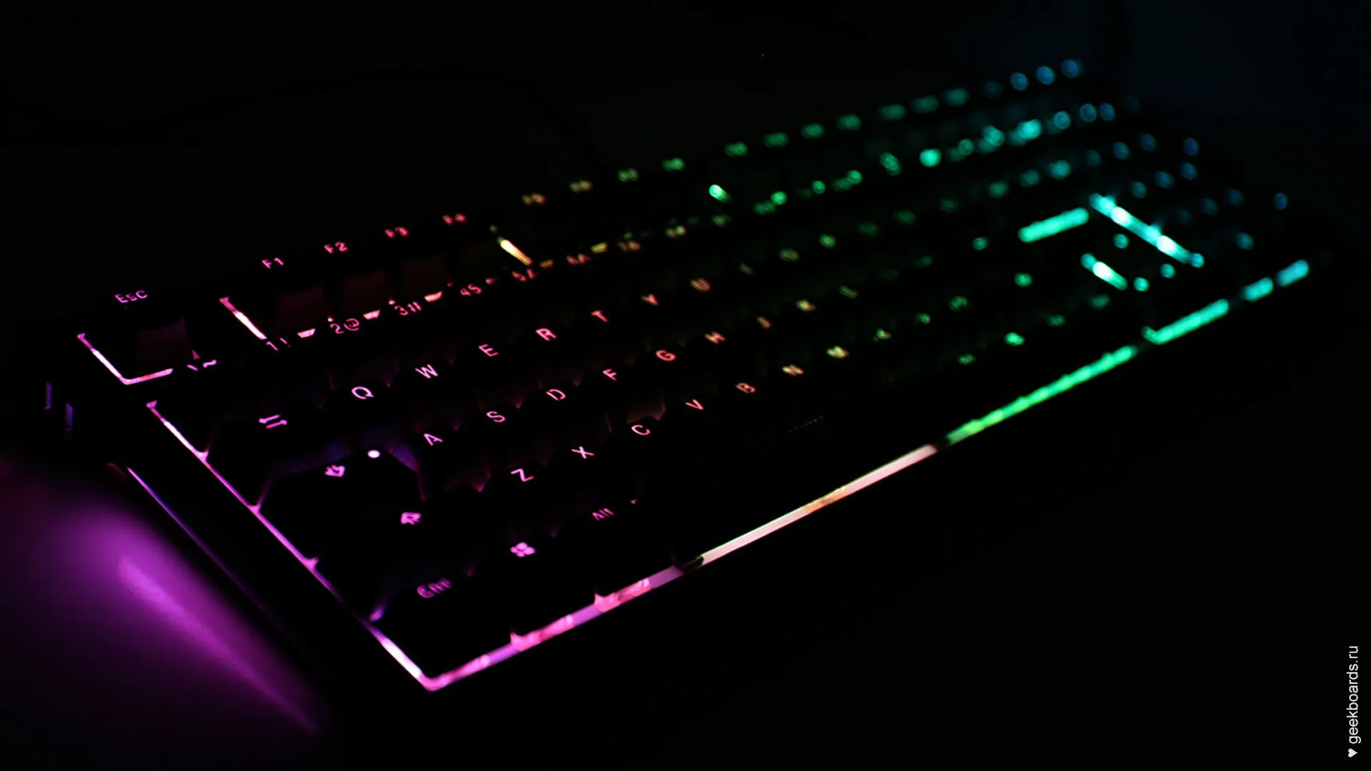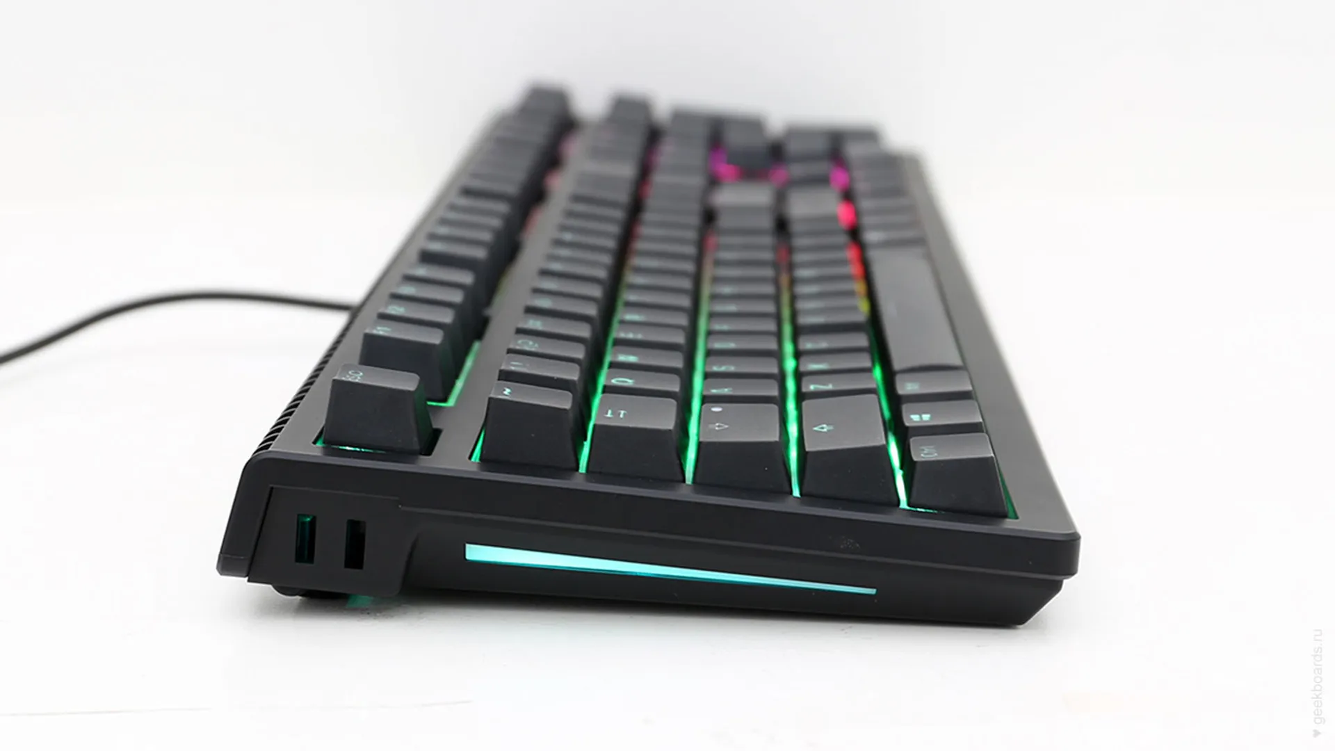 RGB-подсветка. Shine 6 получила новые светодиоды, с повышенным световыми потоком и припаиваемые с обратной стороны платы. Такую подсветку видно и при ярком свете, и это удобно, если учесть, что среди режимов ее работы есть не только декоративные «капли дождя» и пробегающие волны, но и вполне утилитарное окрашивание групп клавиш разными цветами. Внимание! В режиме USB 3.0 подсветка становится ярче, для переключения нажмите правый ALT + пробел при подключении к порту.