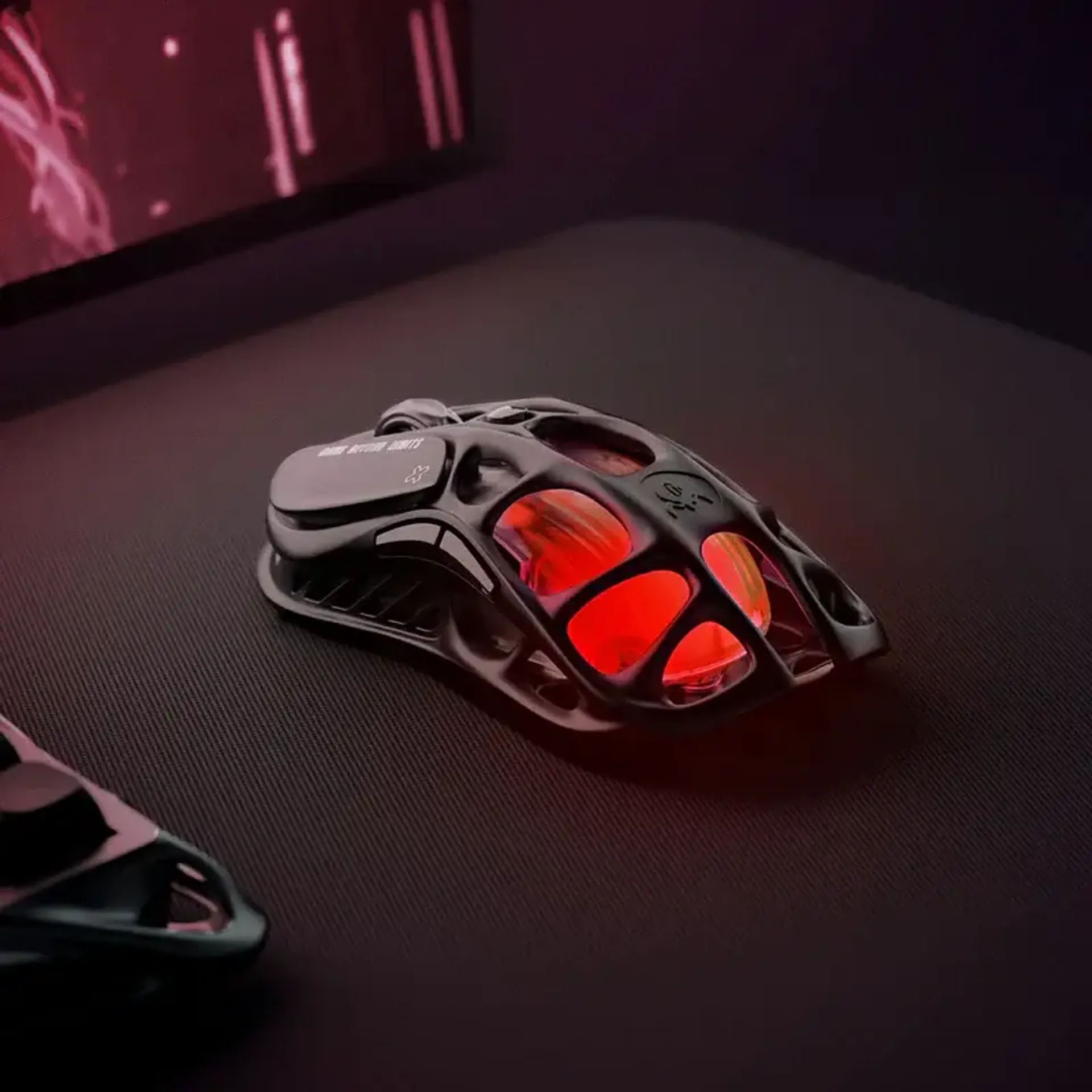 Корпус выполнен из цинк-алюминиевого сплава, что придаёт мыши премиальное ощущение и повышенную прочность при весе всего ≈75 г. Структурная геометрия корпуса напоминает роботизированные элементы — с открытым «каркасным» дизайном, подсветкой и точными линиями.