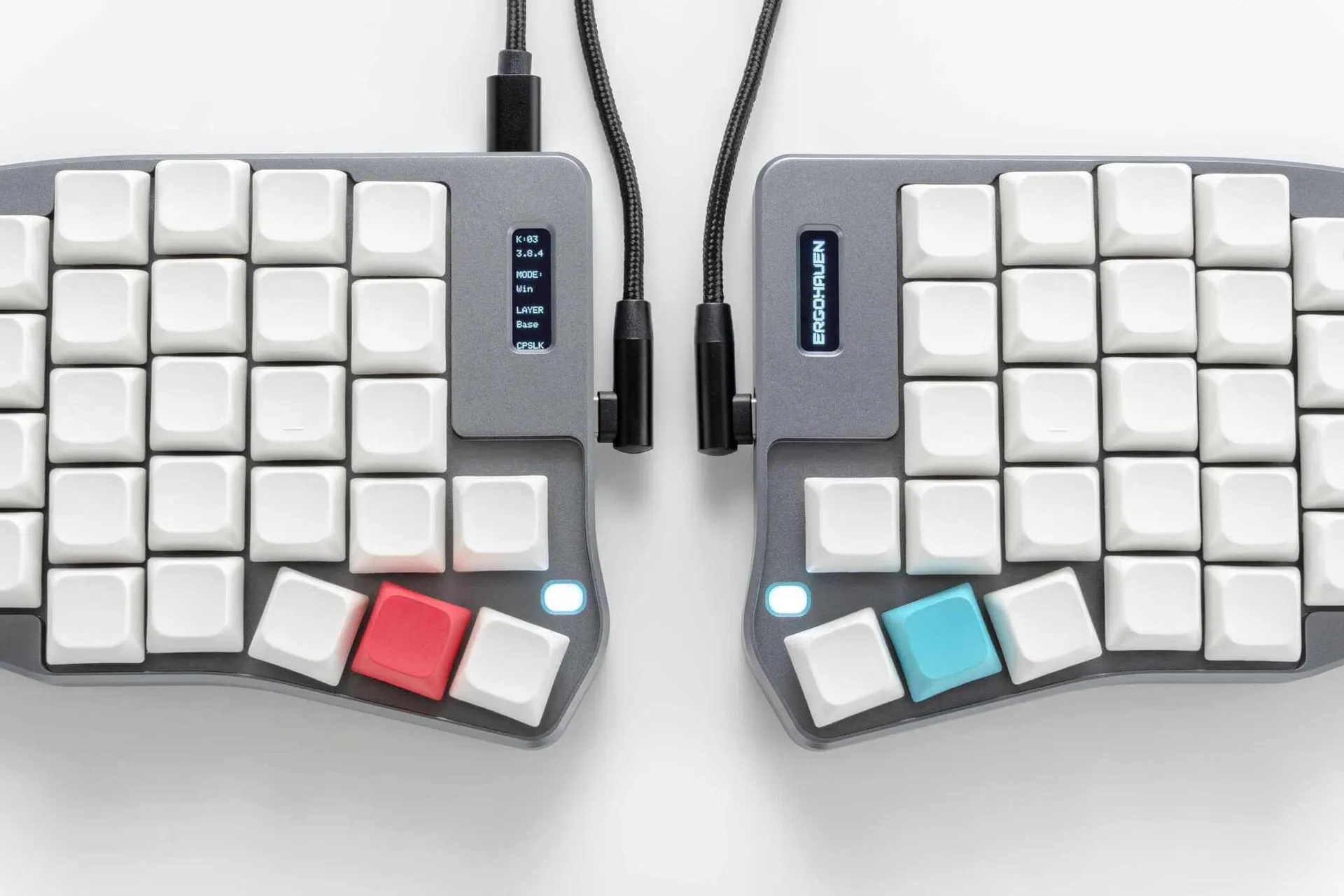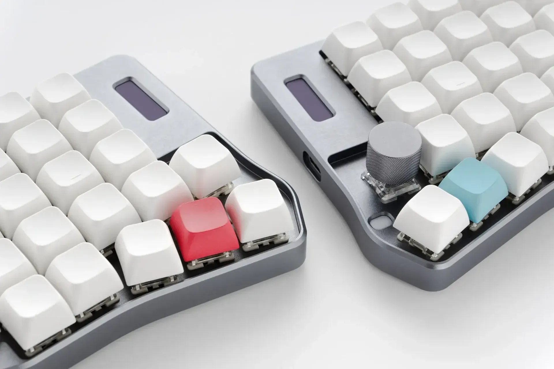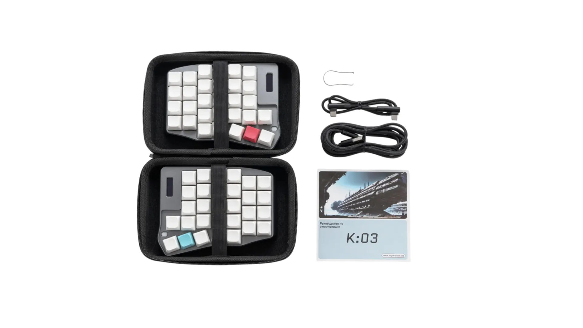 K:03 v3 – это особенная клавиатура, разделённая на две части для максимального комфорта. У каждой половинки есть 5 клавиш под большой палец, а любую из частей можно дополнить энкодерами – их поместится до трёх штук.