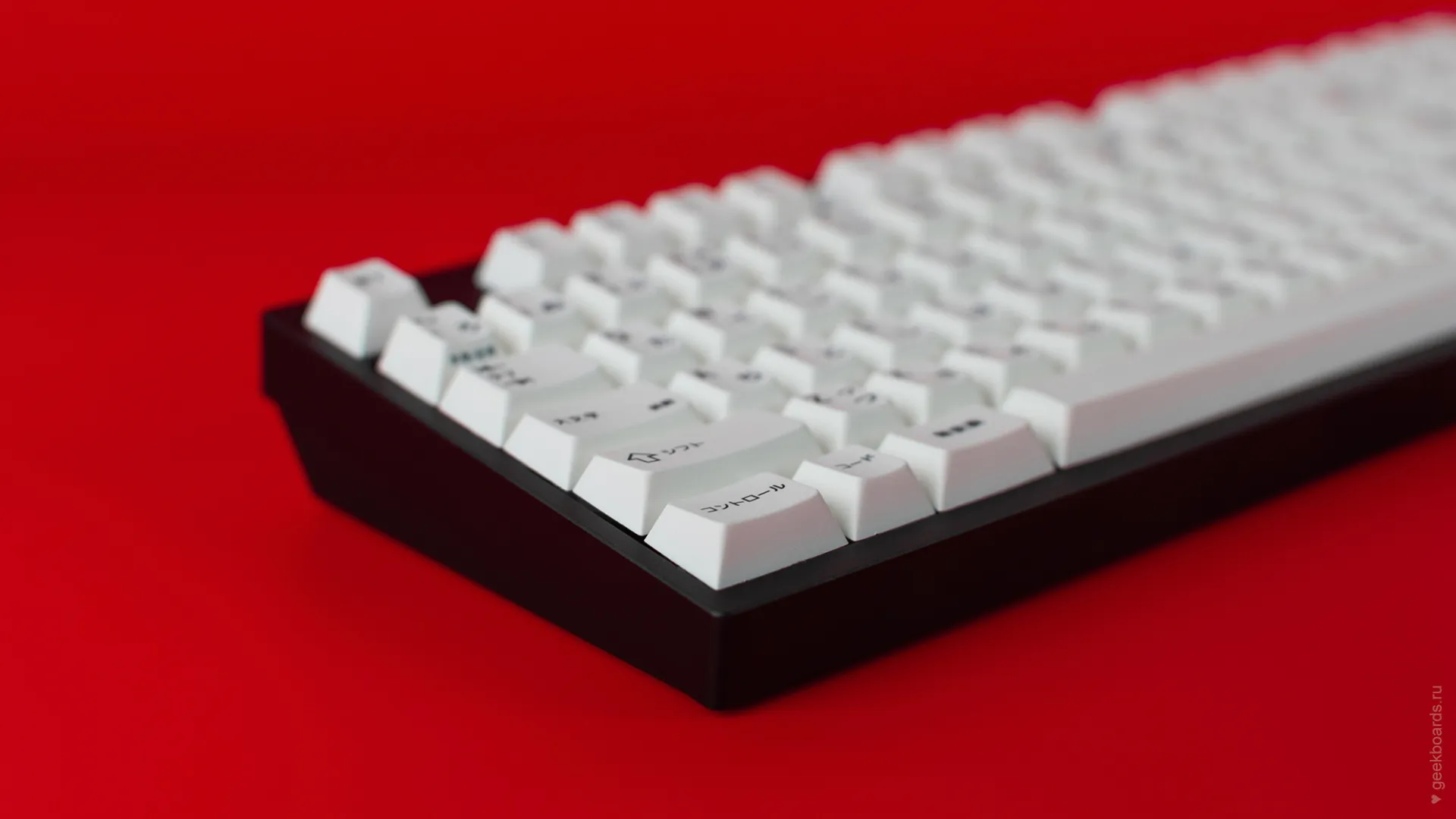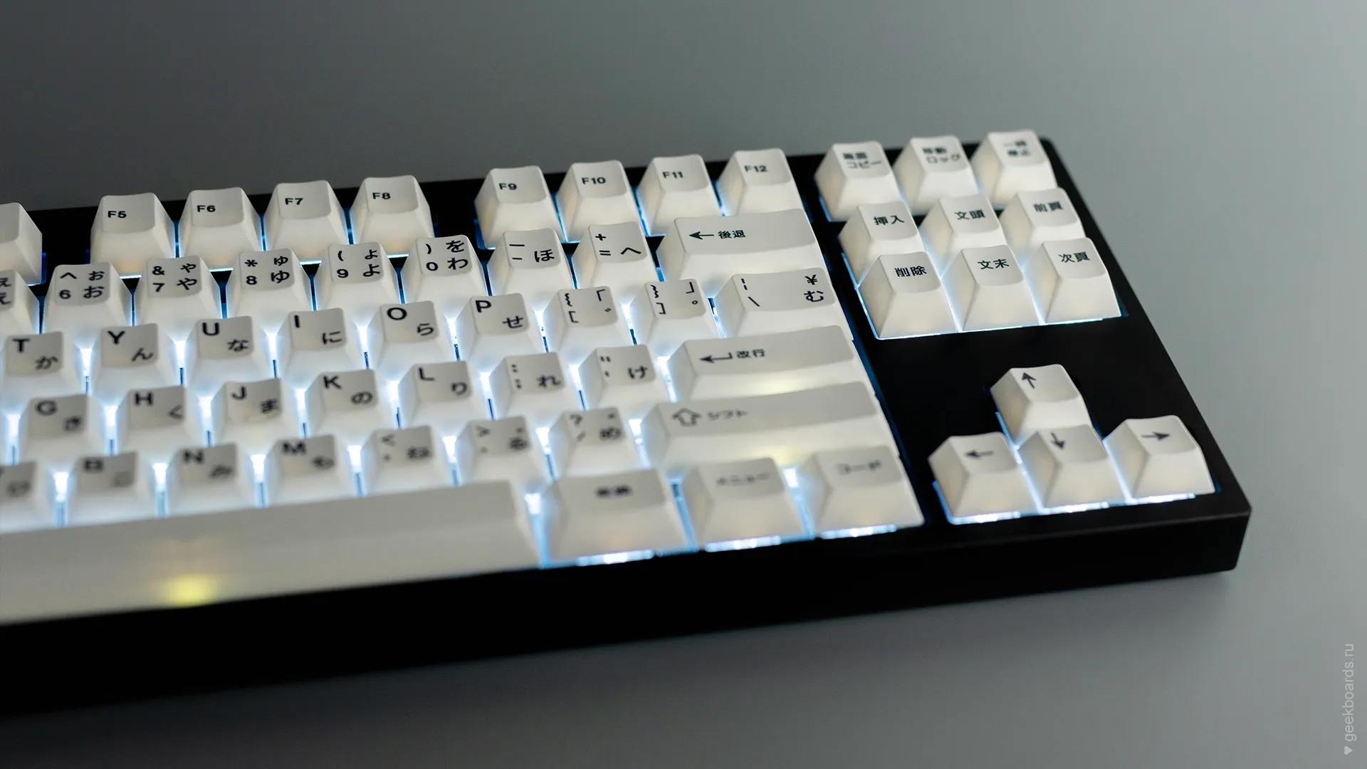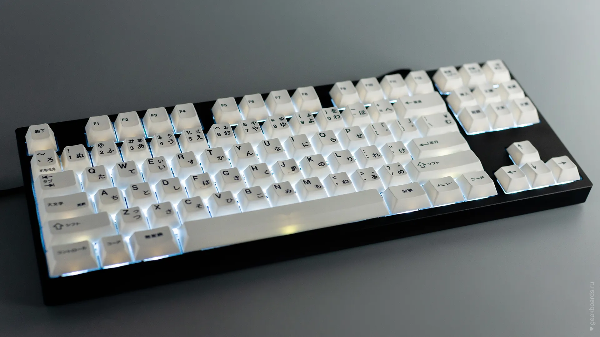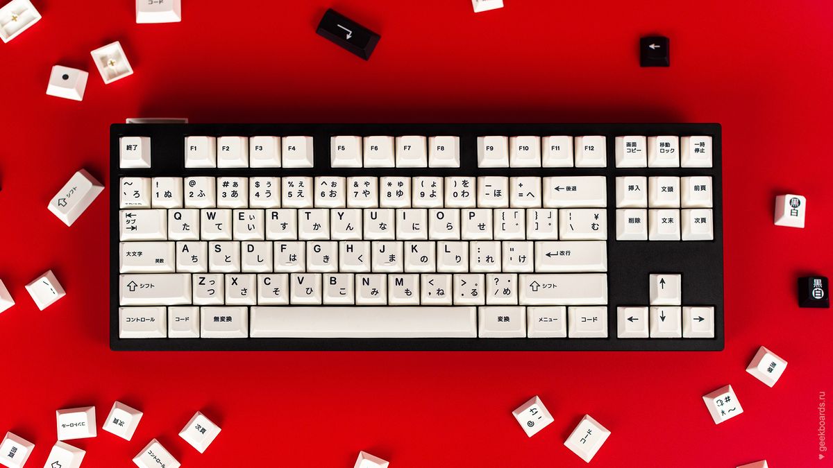 Кастомная клавиатура мечты на переключателях Drop + Invyr Holy Panda. Собрана вручную в секретной лаборатории GeekBoards с заботой и вниманием к каждой мелочи. На клавиатуре установлена белая подсветка и крышесносно стильный кейкап сет EPBT x GOK Kuro Base Kit из PBT пластика с dye-sub нанесением, профиль клавиш — Cherry. Корпус + плата — KBD8X MKII с прошивкой QMK. Плата управляется через VIA и имеет нижнюю RGB подсветку для использования в прозрачном корпусе. Проложена шумоизоляция из вспененного полиэтилена. Для смазки переключателей мы использовали Krytox GPL 205, а стабилизаторы GMK Screw-In смазали Permatex.
