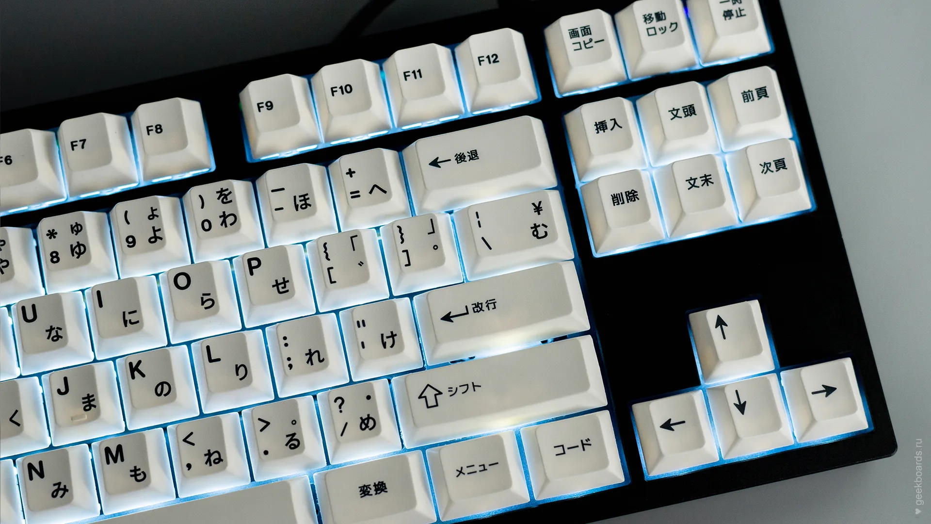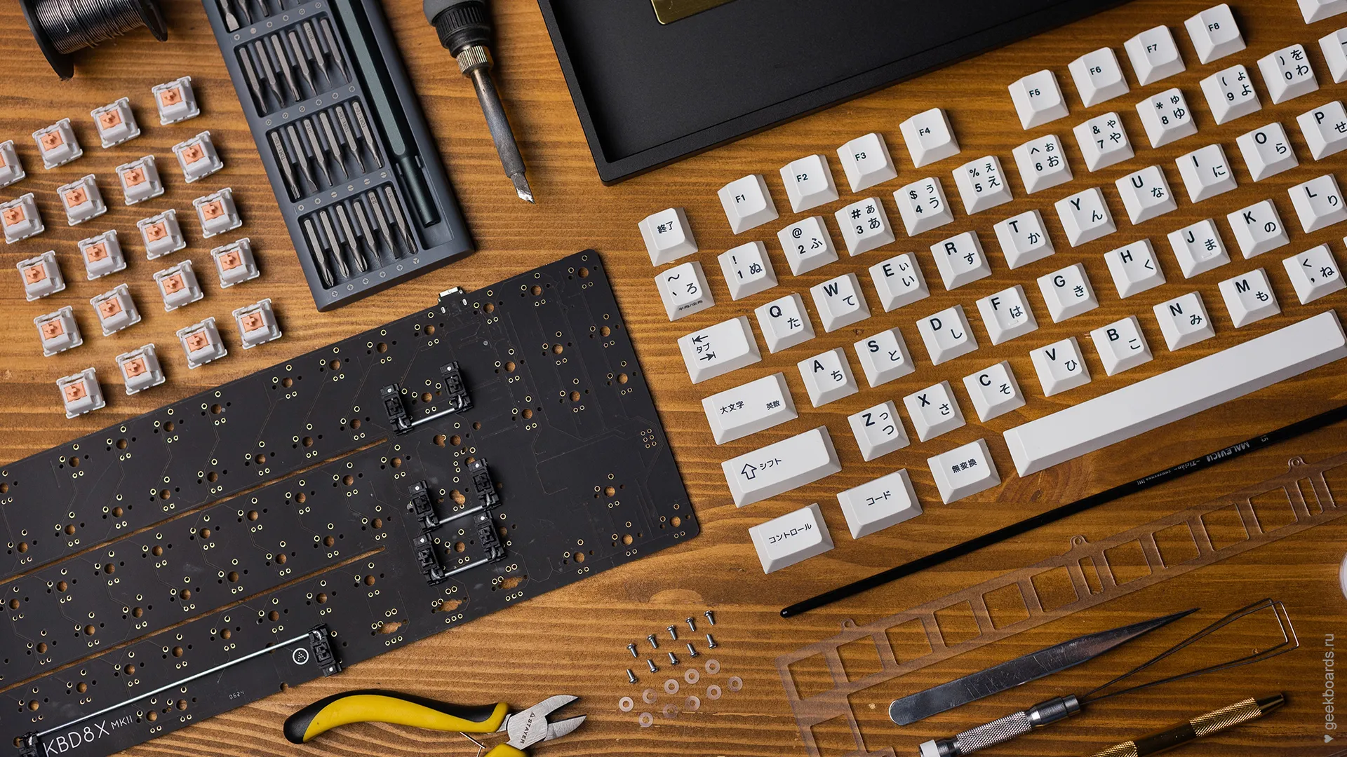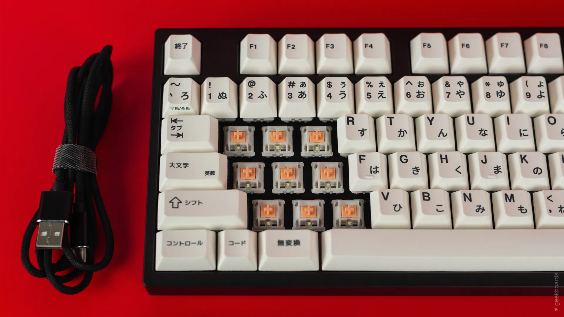 Кастомная клавиатура мечты на переключателях Drop + Invyr Holy Panda. Собрана вручную в секретной лаборатории GeekBoards с заботой и вниманием к каждой мелочи. На клавиатуре установлена белая подсветка и крышесносно стильный кейкап сет EPBT x GOK Kuro Base Kit из PBT пластика с dye-sub нанесением, профиль клавиш — Cherry. Корпус + плата — KBD8X MKII с прошивкой QMK. Плата управляется через VIA и имеет нижнюю RGB подсветку для использования в прозрачном корпусе. Проложена шумоизоляция из вспененного полиэтилена. Для смазки переключателей мы использовали Krytox GPL 205, а стабилизаторы GMK Screw-In смазали Permatex.
