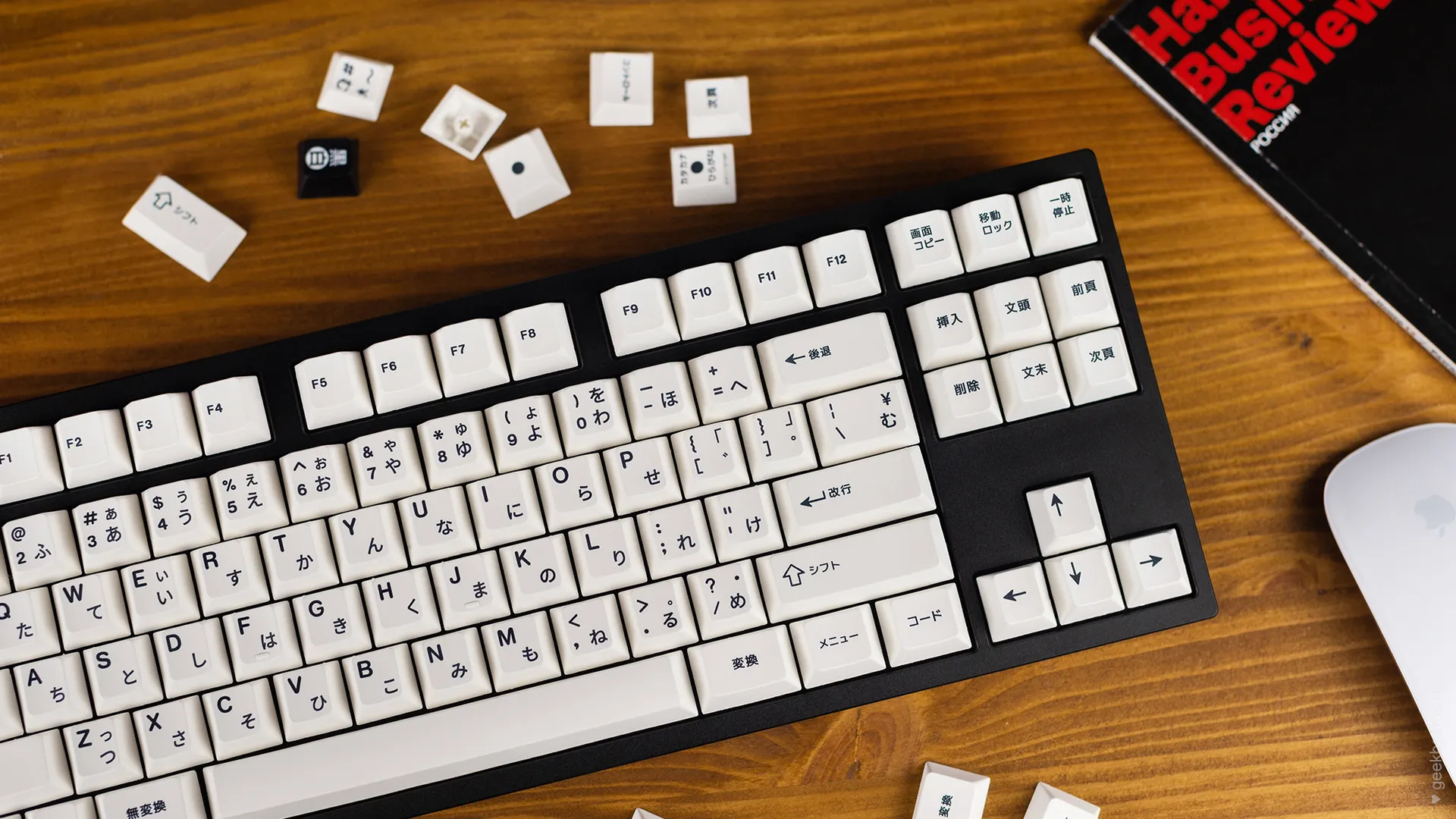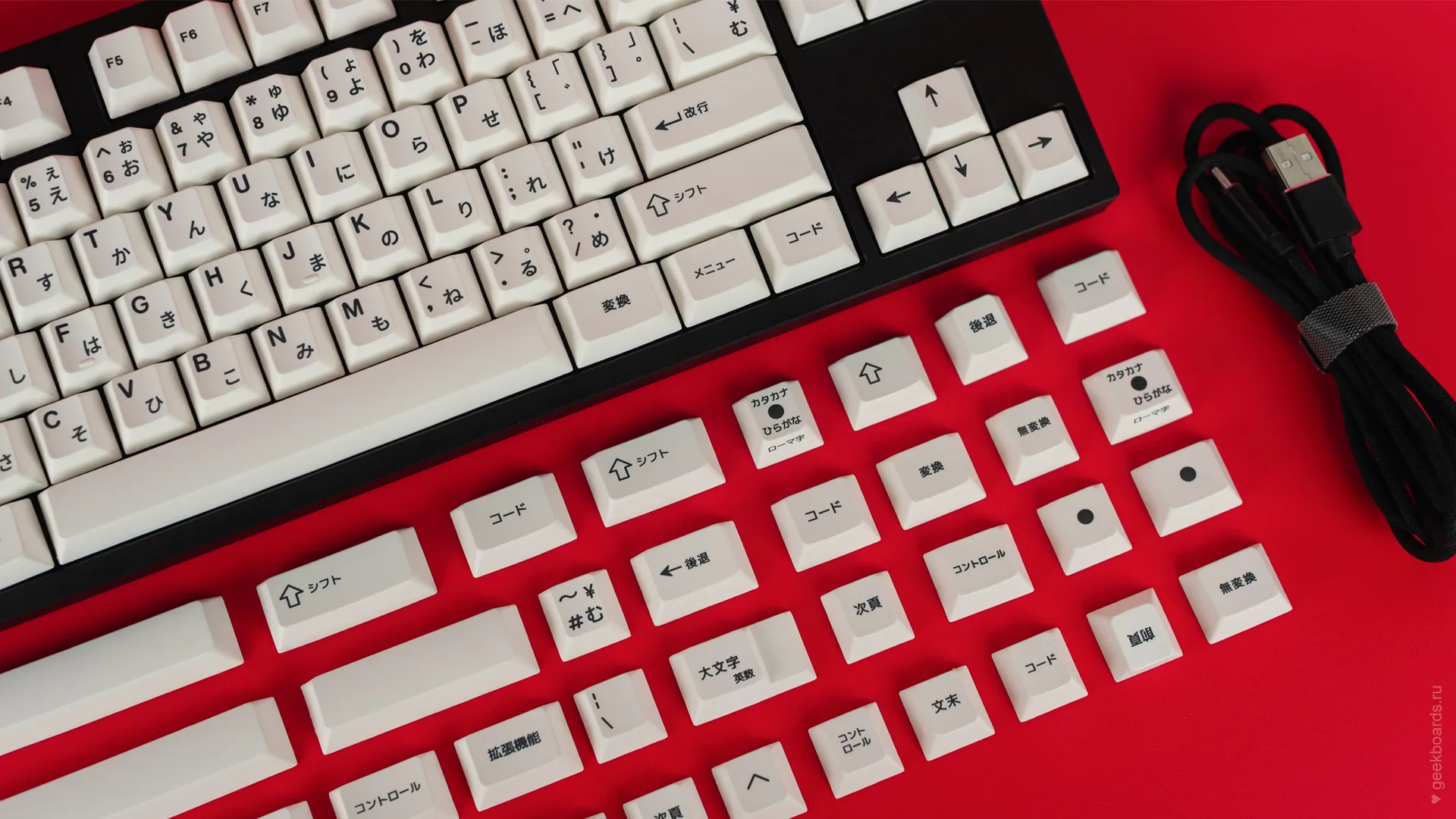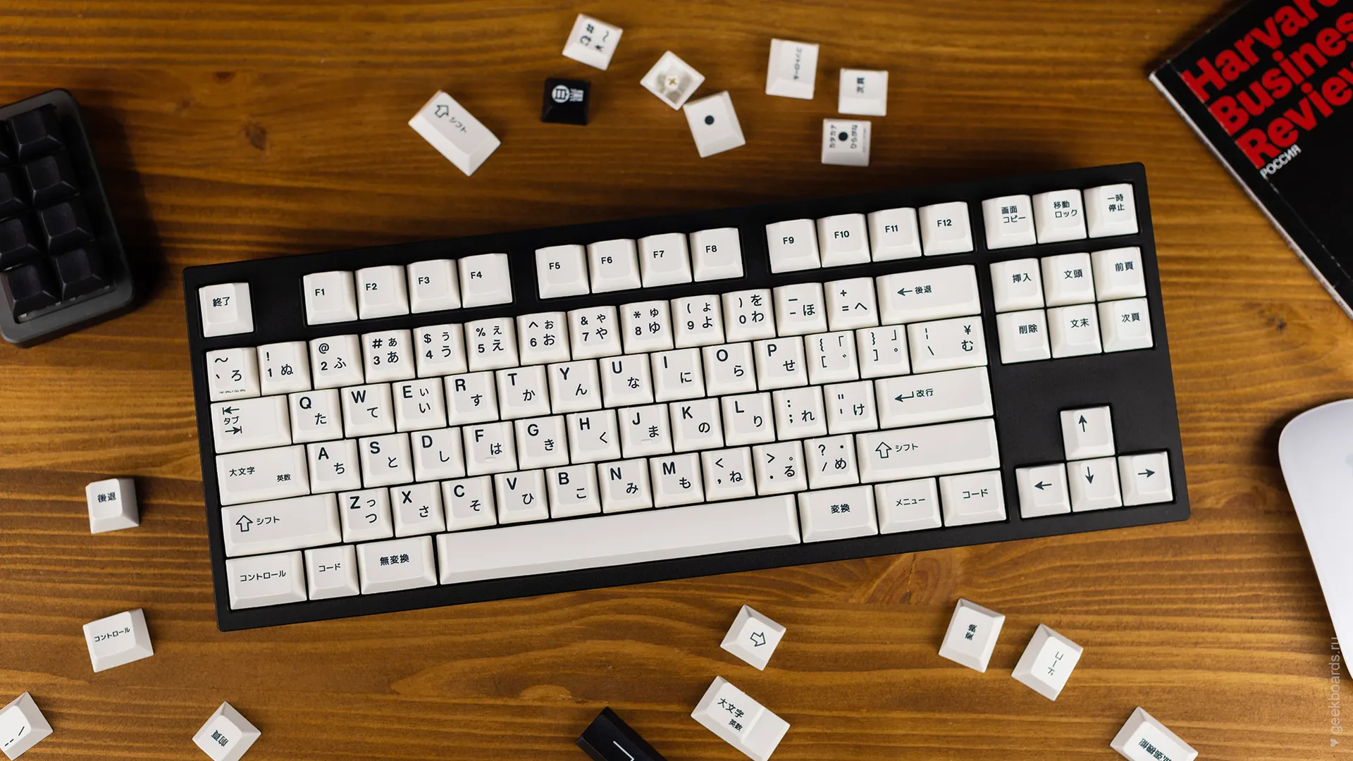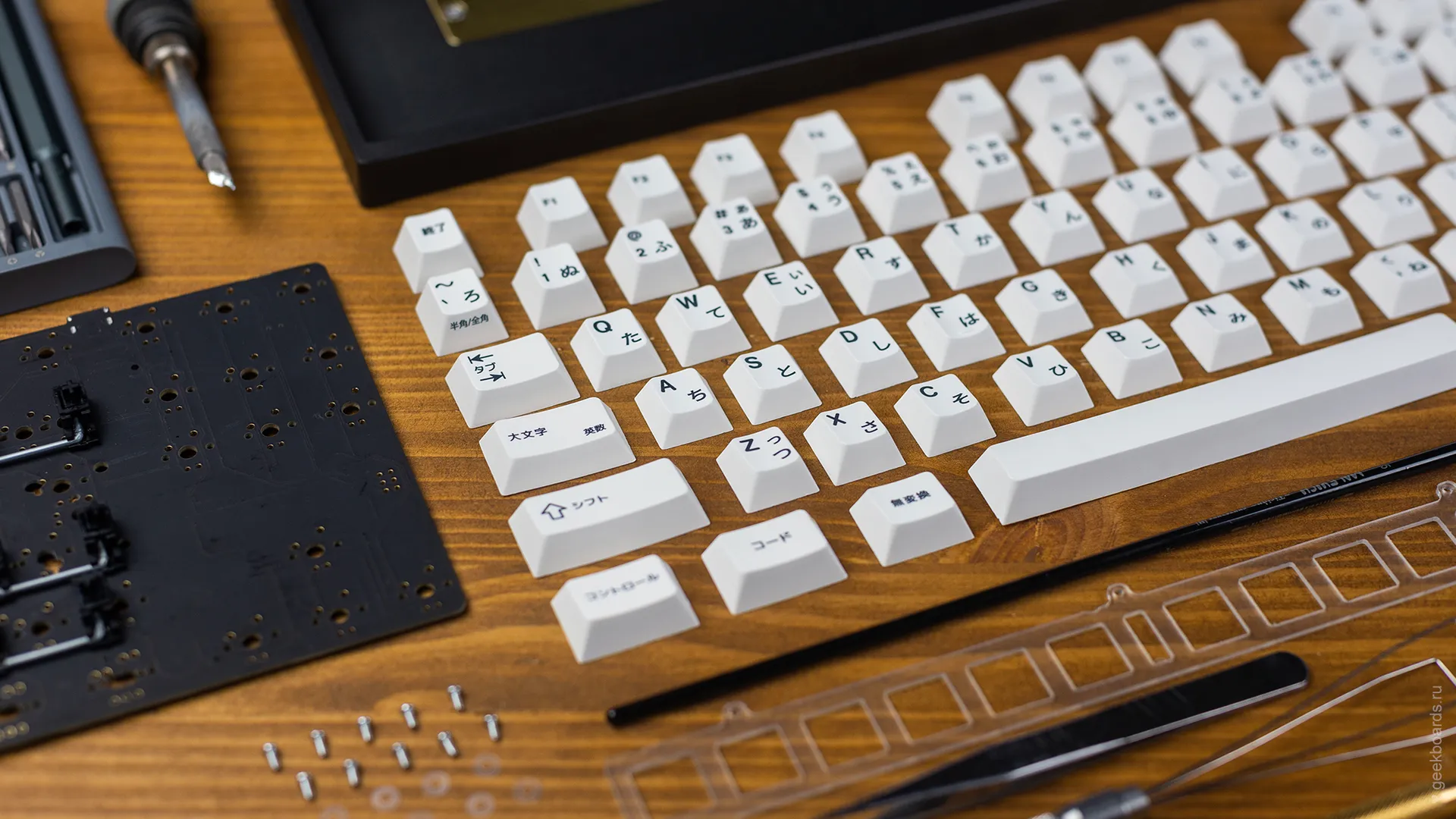 Кастомная клавиатура мечты на переключателях Drop + Invyr Holy Panda. Собрана вручную в секретной лаборатории GeekBoards с заботой и вниманием к каждой мелочи. На клавиатуре установлена белая подсветка и крышесносно стильный кейкап сет EPBT x GOK Kuro Base Kit из PBT пластика с dye-sub нанесением, профиль клавиш — Cherry. Корпус + плата — KBD8X MKII с прошивкой QMK. Плата управляется через VIA и имеет нижнюю RGB подсветку для использования в прозрачном корпусе. Проложена шумоизоляция из вспененного полиэтилена. Для смазки переключателей мы использовали Krytox GPL 205, а стабилизаторы GMK Screw-In смазали Permatex.