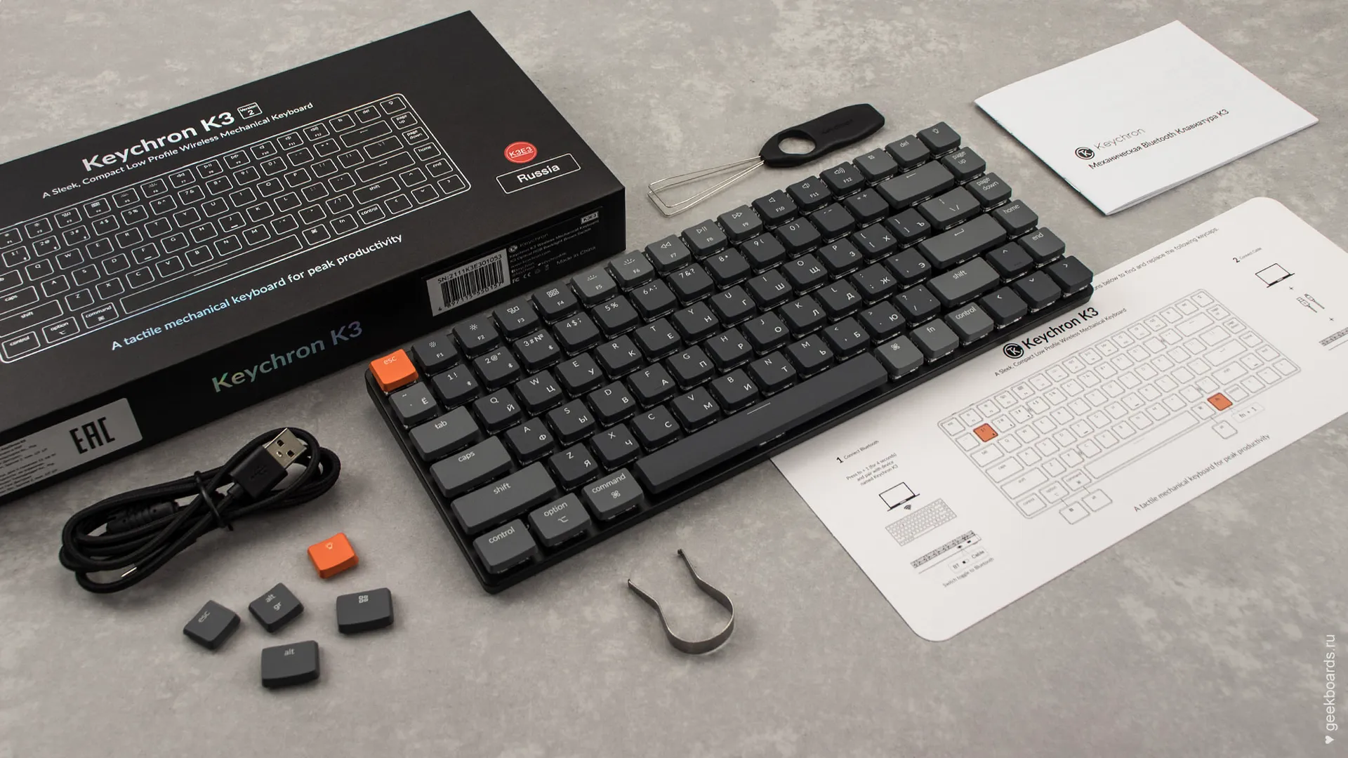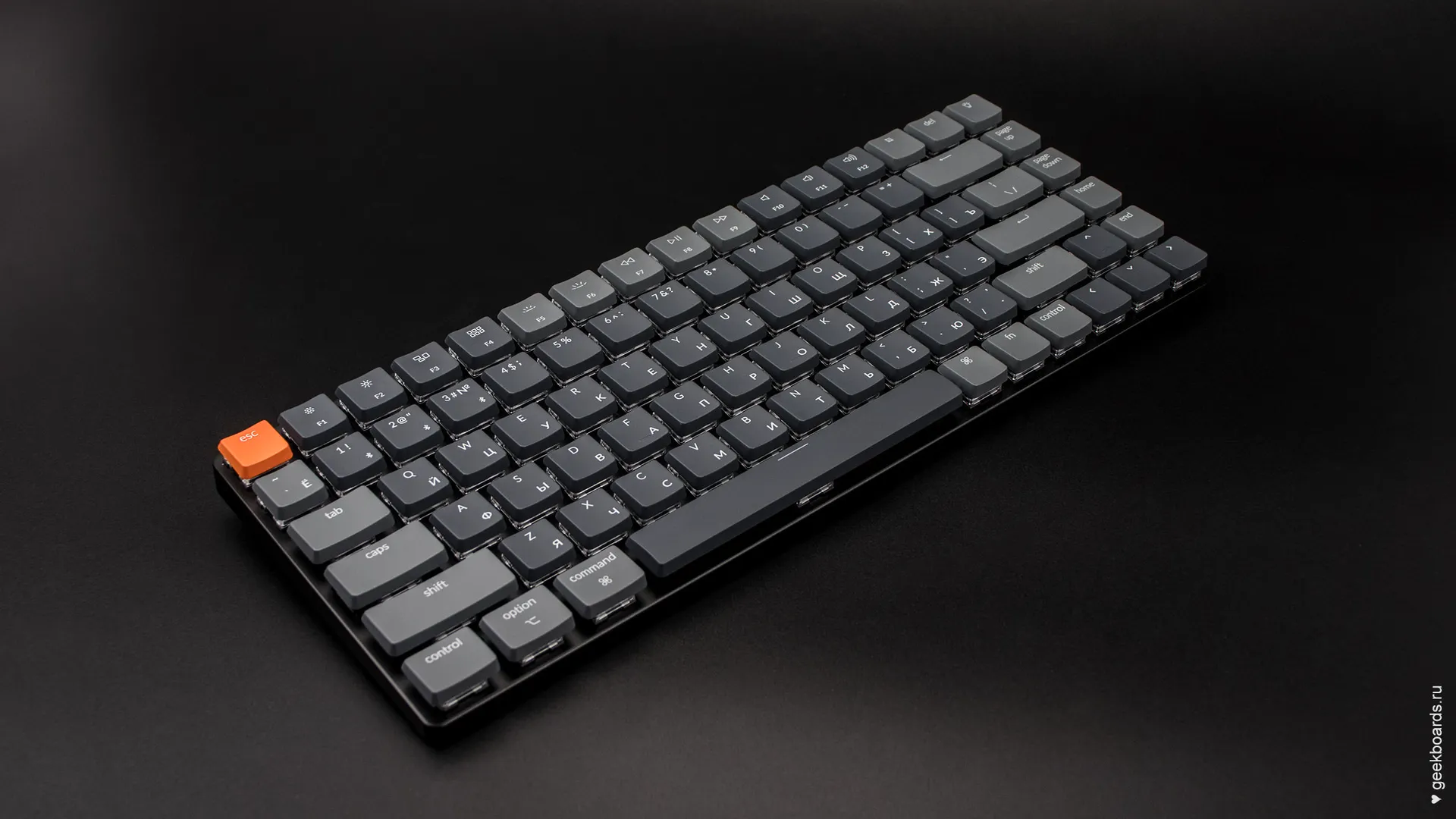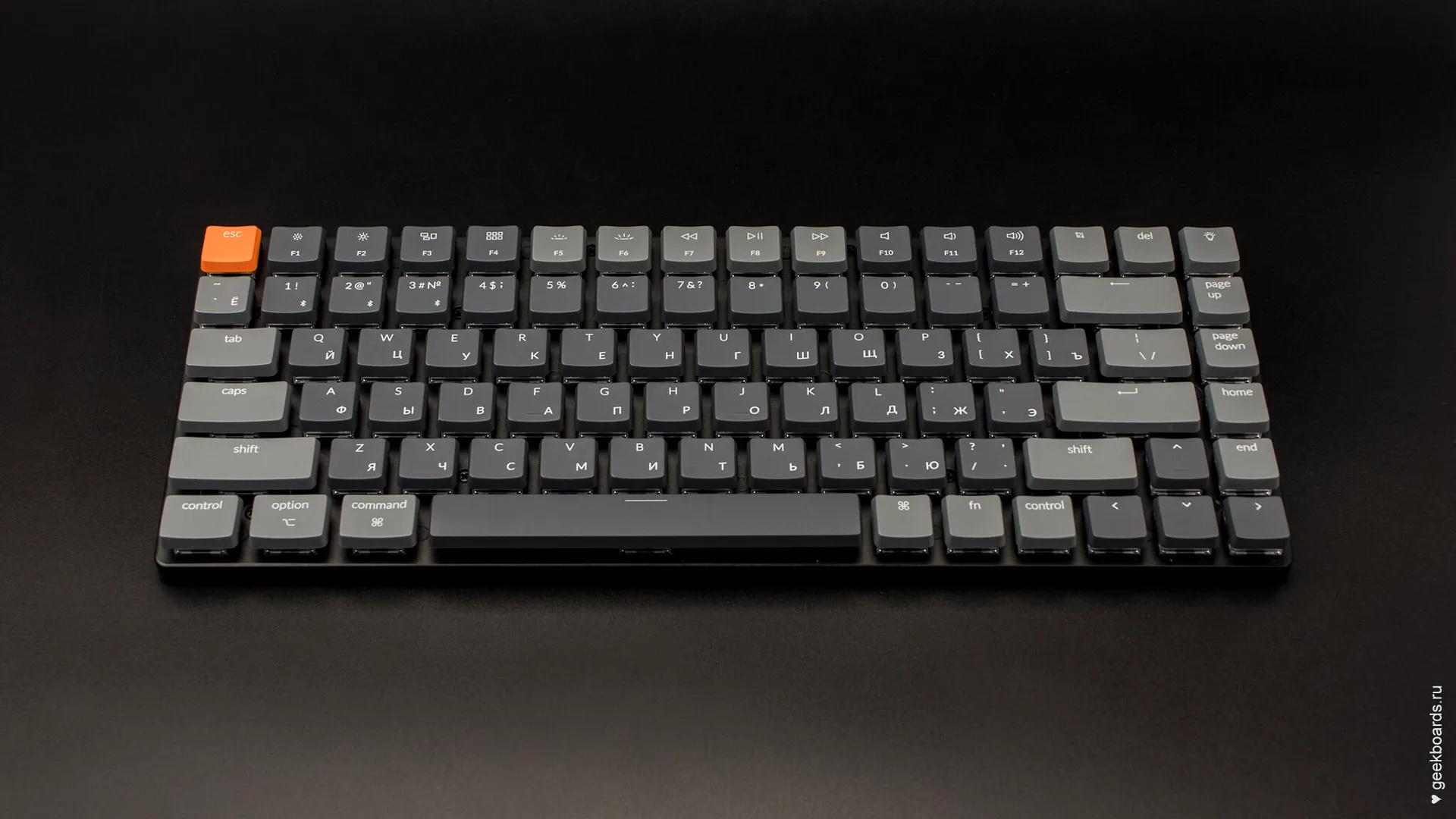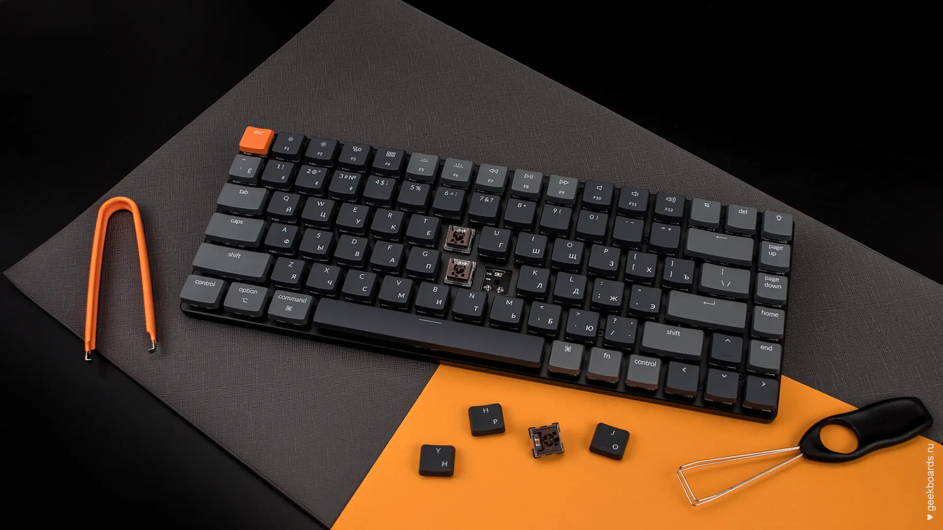 В комплекте есть сменные клавиши Win и Alt для использования на windows, а также дополнительная клавиша “подсветка” оранжевого цвета и серый Esc — можно сделать клавиатуру монотонной или добавить яркий акцент.
