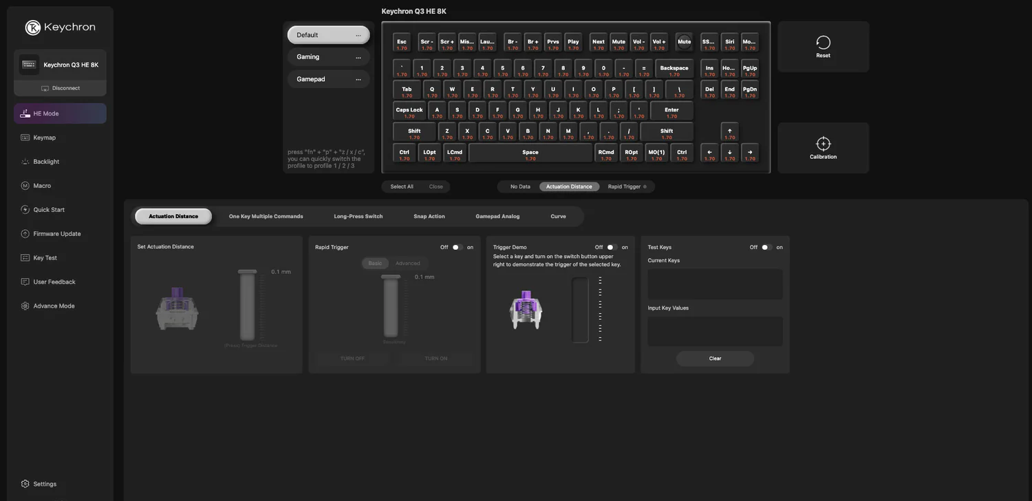 В основе — бесконтактные магнитные свитчи, считывающие глубину нажатия с высокой точностью. Можно настраивать точку срабатывания под себя — от сверхчувствительной до более глубокой и контролируемой. Нажатия ощущаются плавно, без характерного «песка» и износа контактов.