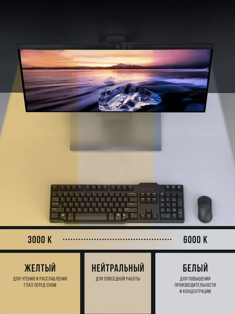 Лампа для монитора — стильное и функциональное решение для комфортной работы за компьютером дома или в офисе. Светильник устанавливается прямо на верхнюю кромку монитора и обеспечивает равномерное освещение рабочего пространства без бликов на экране, снижая нагрузку на глаза при длительной работе или учёбе.