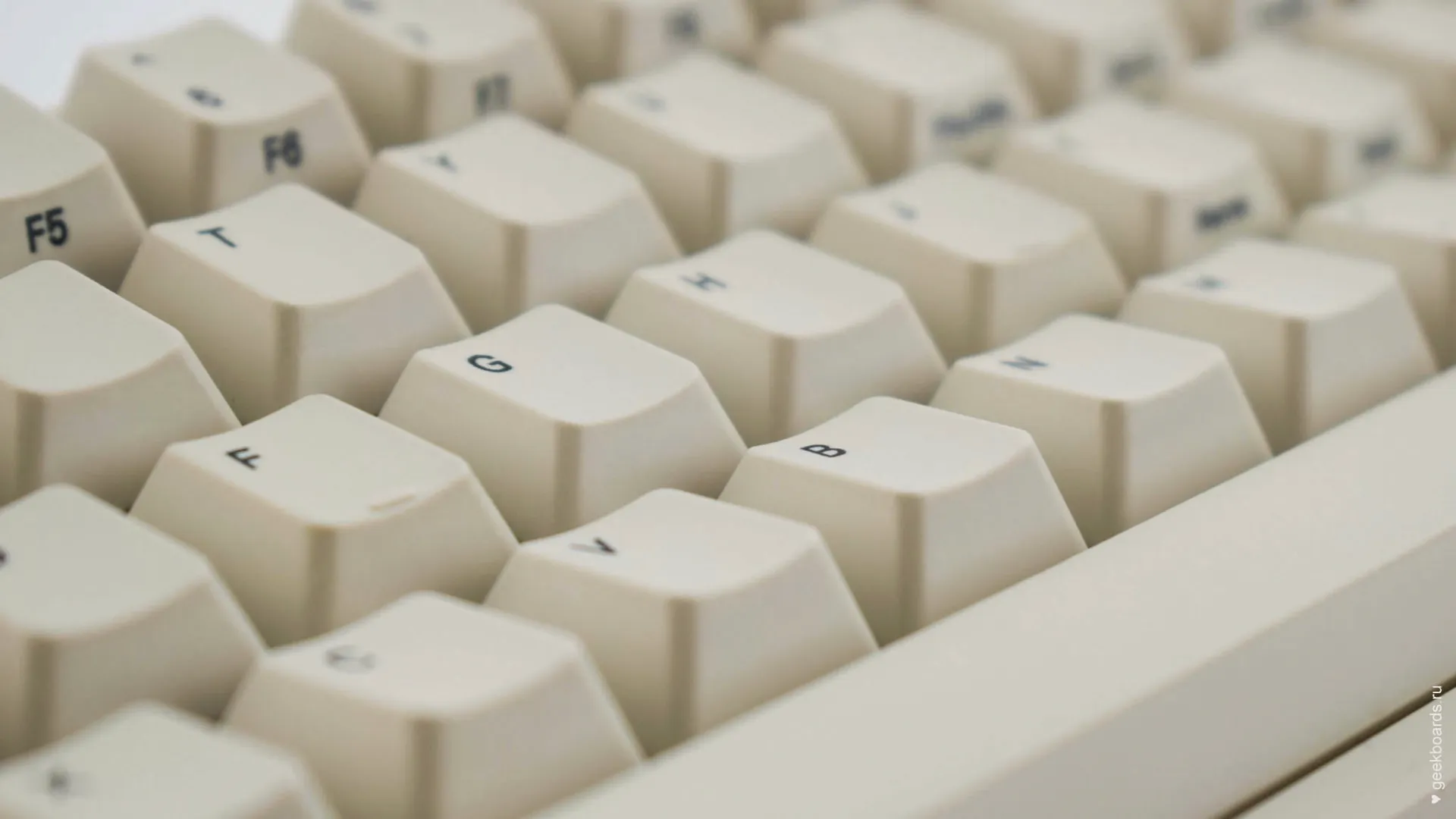 Данная модель имеет кремово-белую расцветку с серыми клавишами-модификаторами в духе классических клавиатур 90-х, собрана добротно и монолитно, а сочетание высококачественных PBT клавиш с переключателями Cherry MX и звукопоглощающей подложки позволяет сделать печать на клавиатуре максимально тихой (насколько это возможно для механики). Mini-USB порт вынесен на верхний правый торец клавиатуры, поэтому если вы часто носите клавиатуру с собой, подключение и отключение клавиатуры будет мгновенным и без лишней возни.