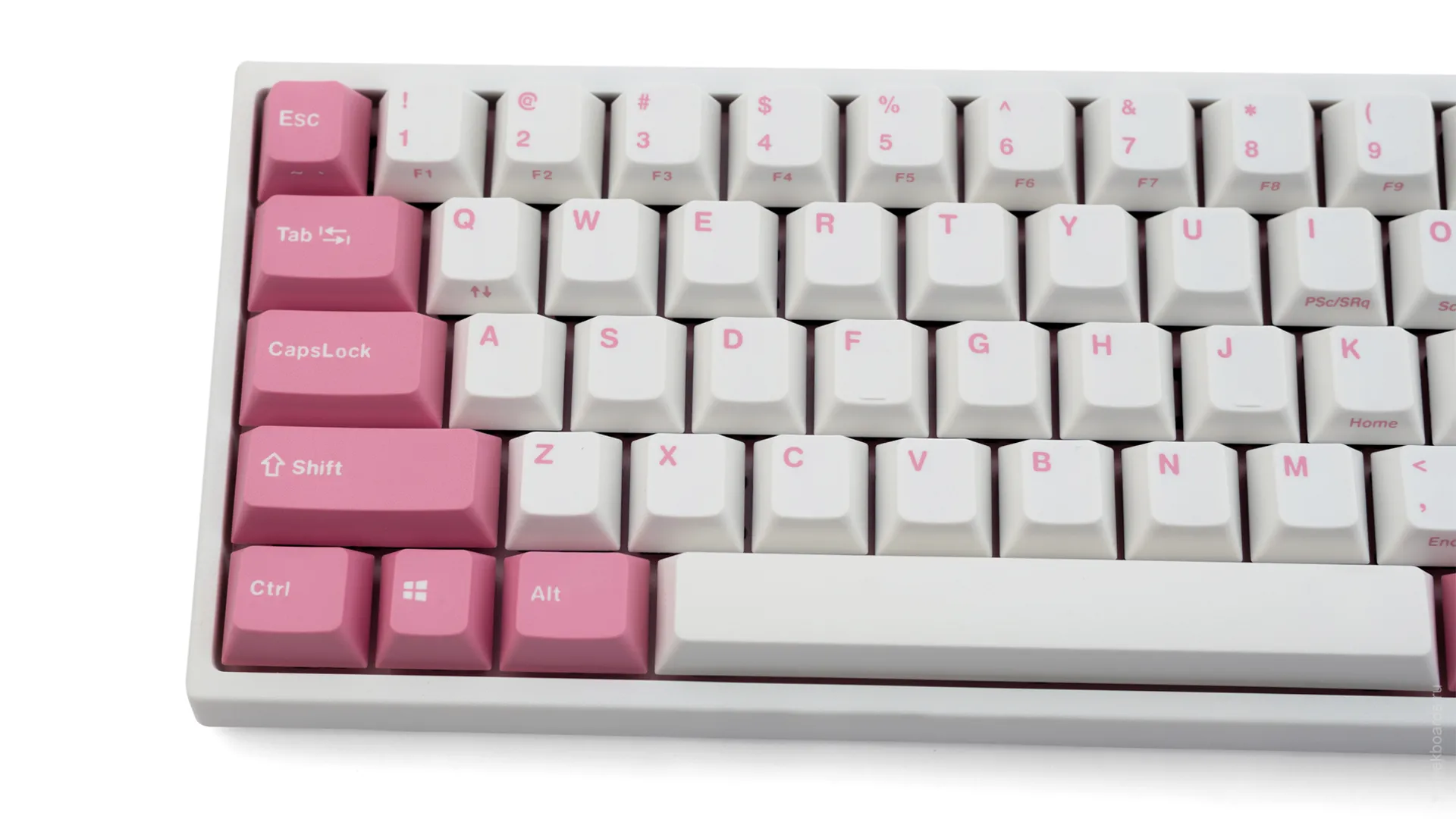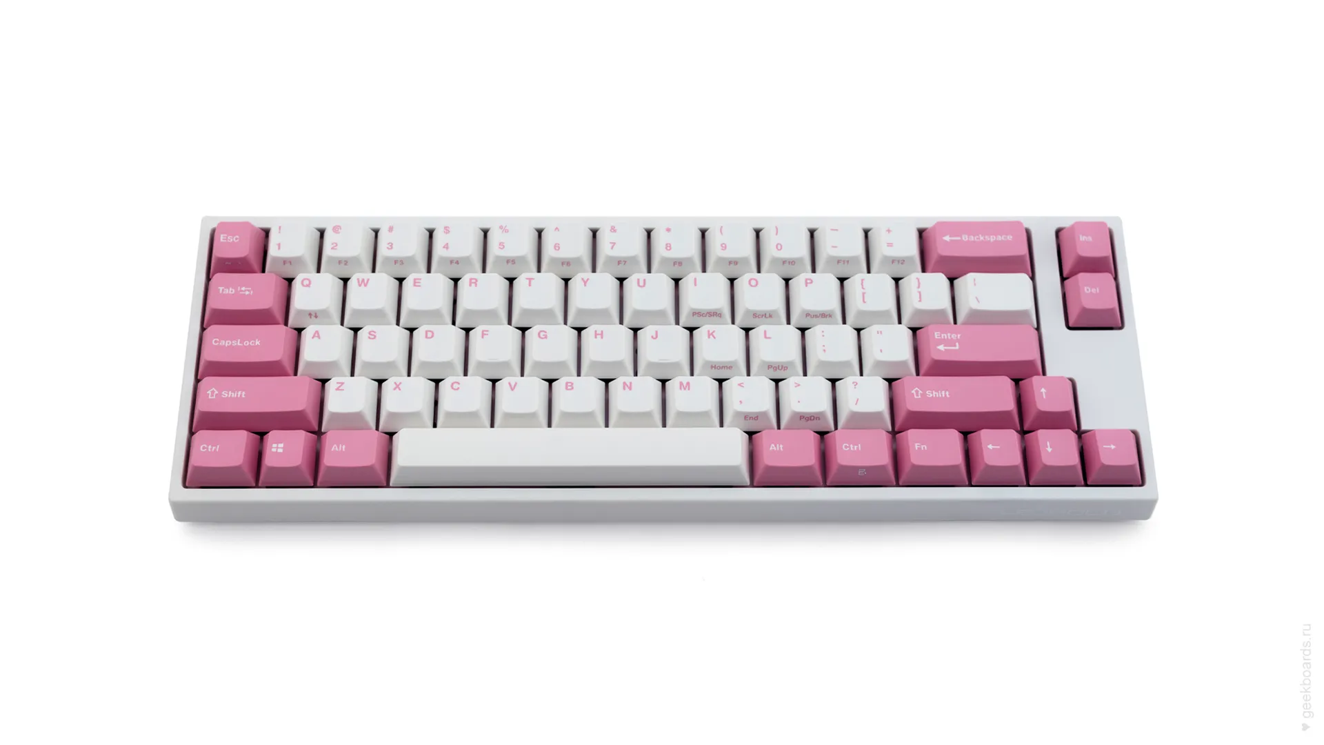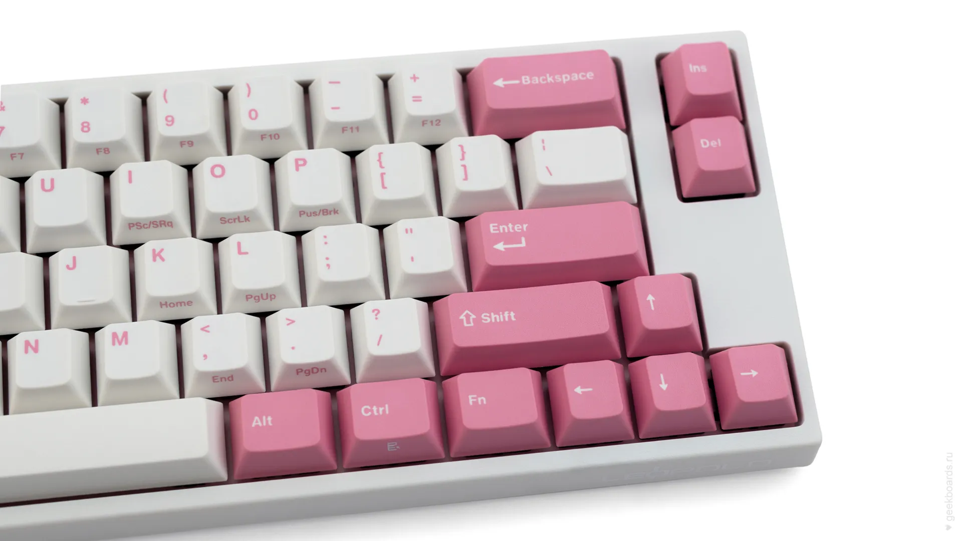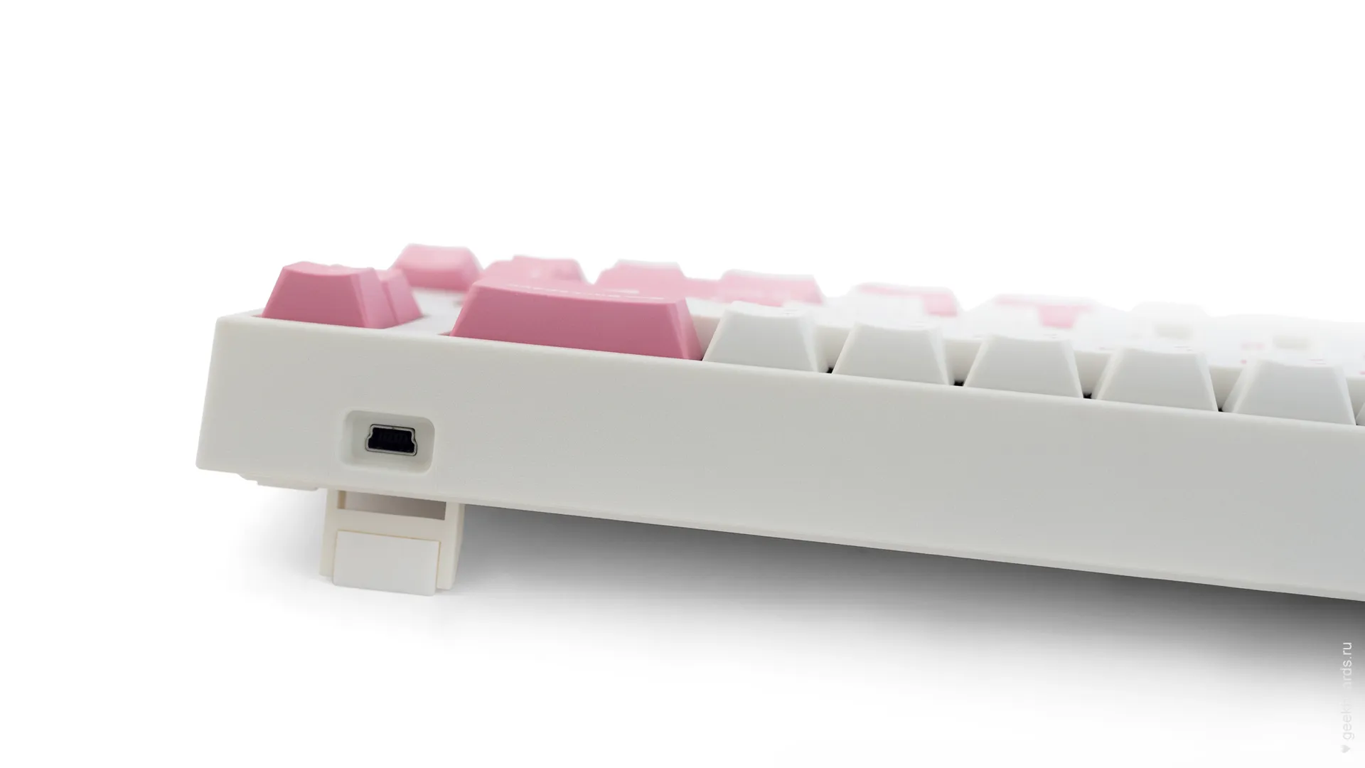 Данная модель имеет няшную бело-розовую расцветку, прямо как у Hello Kitty. Собрана клавиатура добротно и монолитно, а сочетание высококачественных double-shot PBT клавиш с переключателями Cherry MX и звукопоглощающей подложки позволяет сделать печать на клавиатуре максимально тихой (насколько это возможно для механики). Mini-USB порт вынесен на верхний правый торец клавиатуры, поэтому если вы часто носите клавиатуру с собой, подключение и отключение клавиатуры будет мгновенным и без лишней возни.
