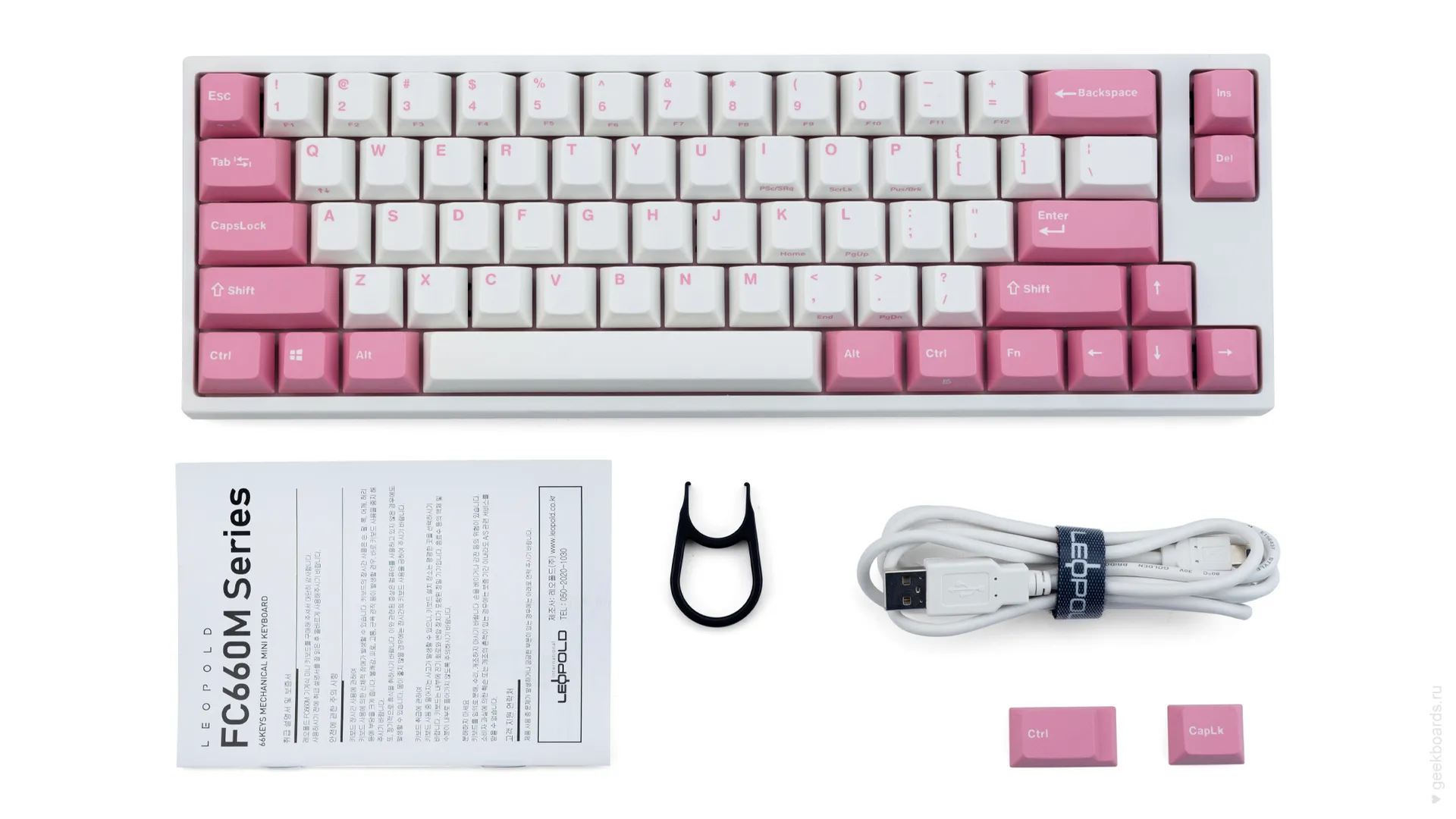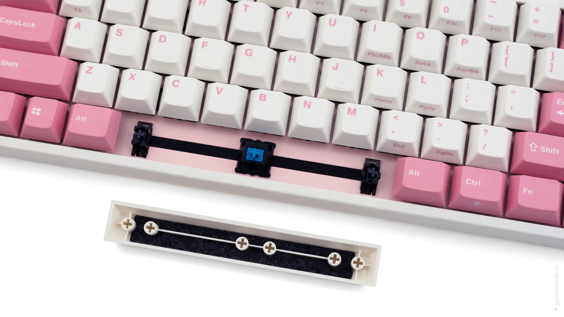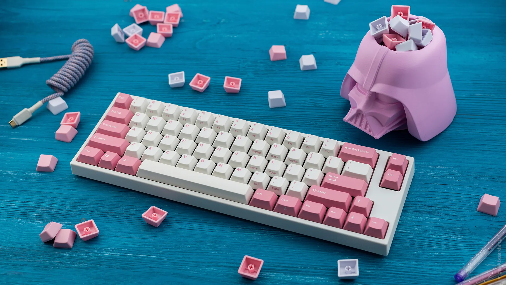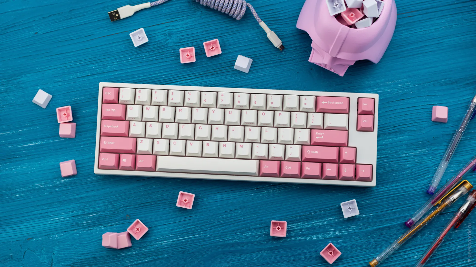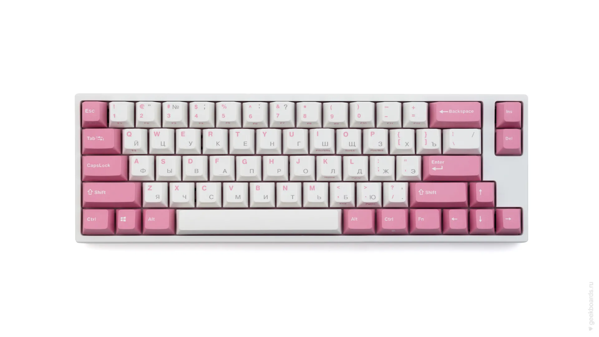 Данная модель имеет няшную бело-розовую расцветку, прямо как у Hello Kitty. Собрана клавиатура добротно и монолитно, а сочетание высококачественных double-shot PBT клавиш с переключателями Cherry MX и звукопоглощающей подложки позволяет сделать печать на клавиатуре максимально тихой (насколько это возможно для механики). Mini-USB порт вынесен на верхний правый торец клавиатуры, поэтому если вы часто носите клавиатуру с собой, подключение и отключение клавиатуры будет мгновенным и без лишней возни.