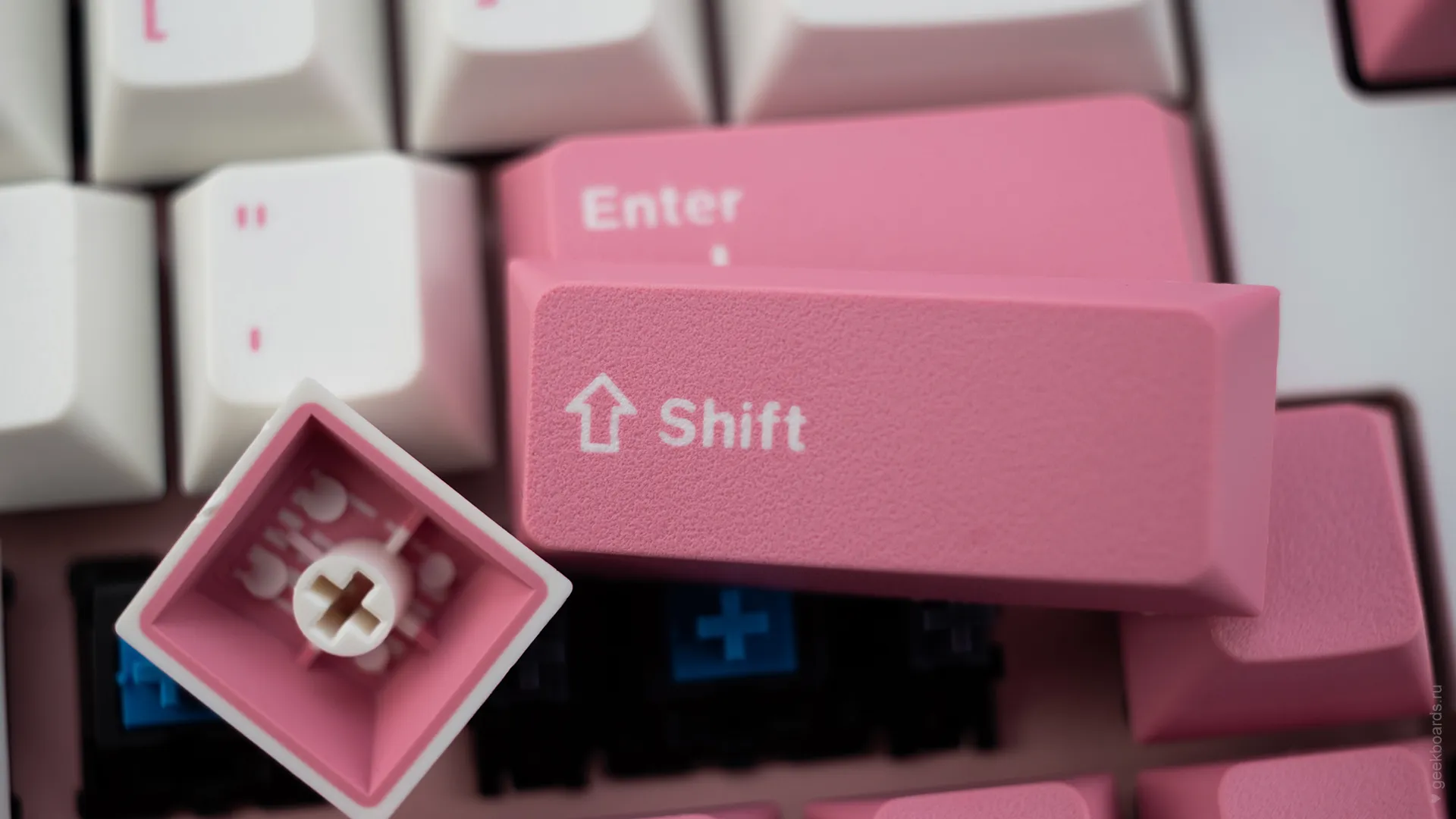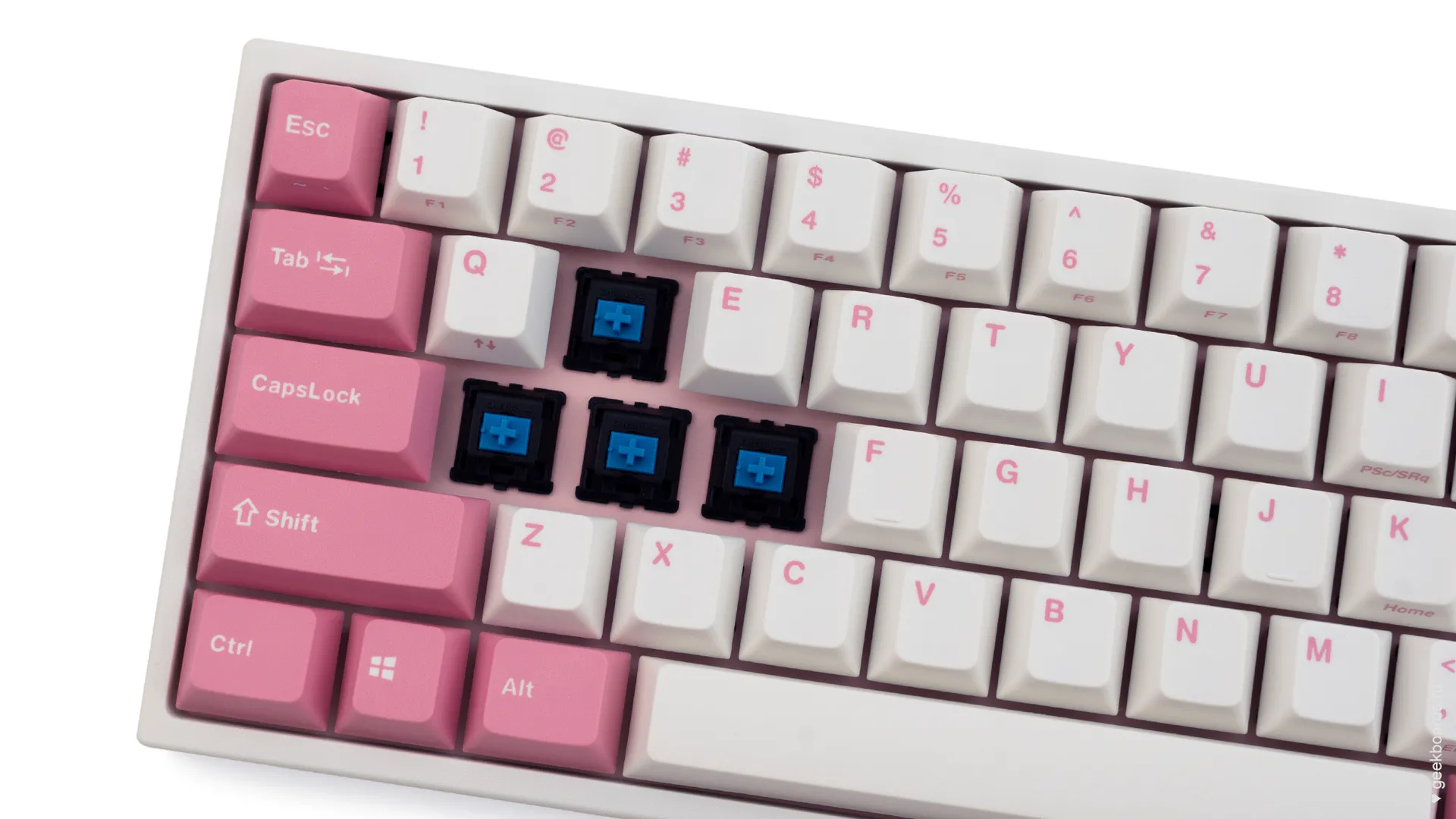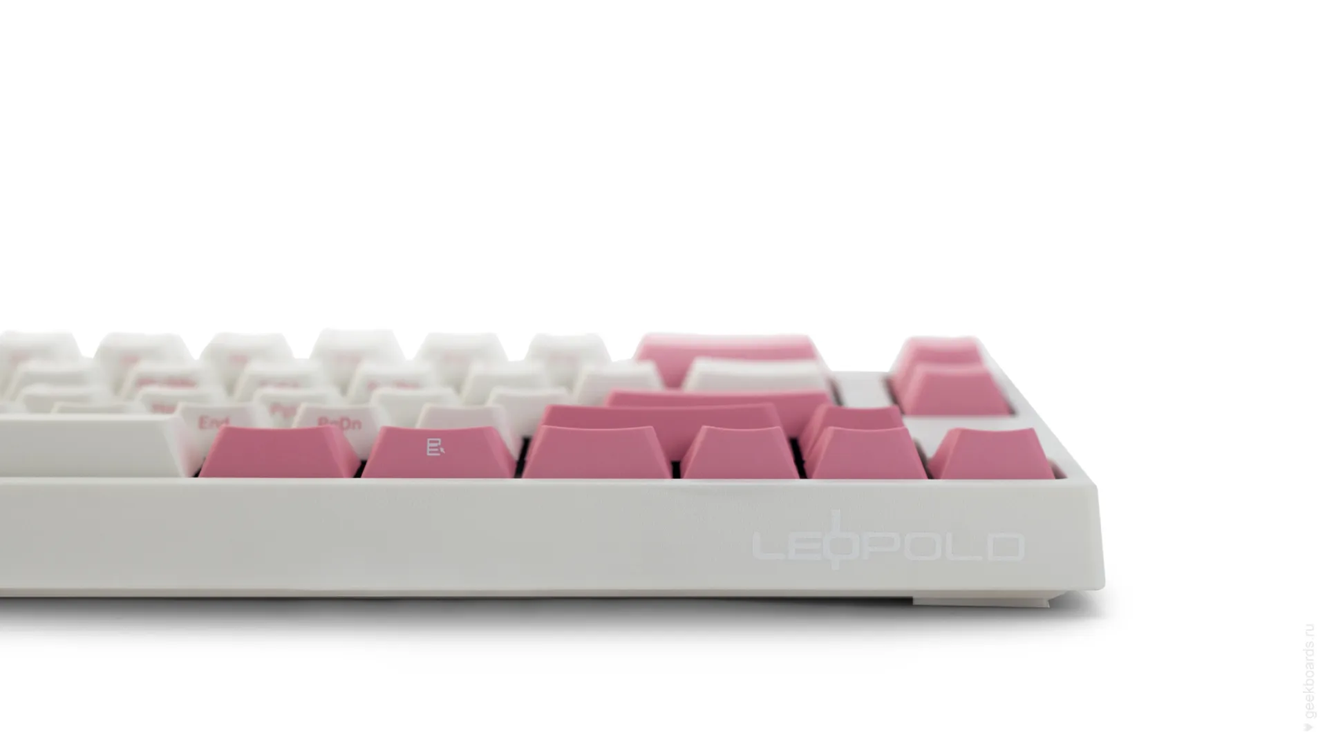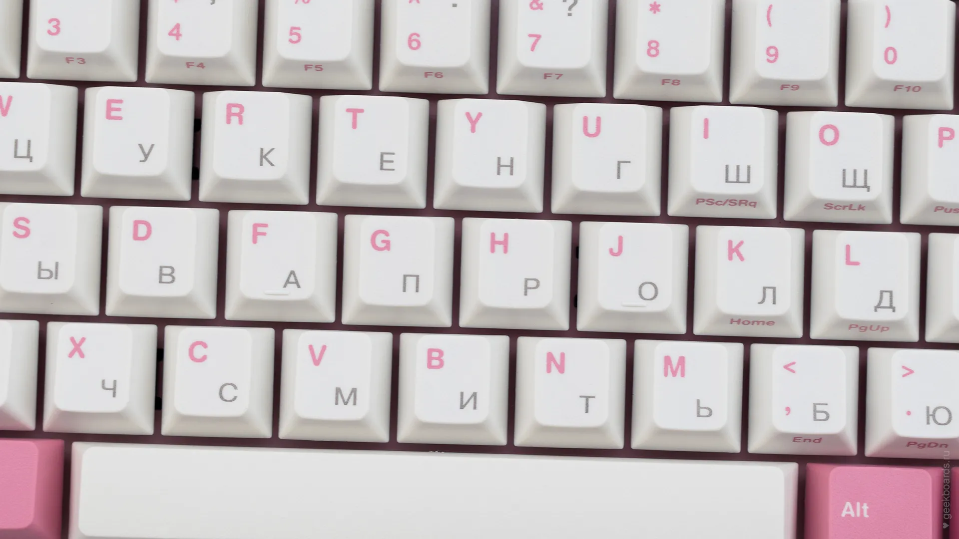 Данная модель имеет няшную бело-розовую расцветку, прямо как у Hello Kitty. Собрана клавиатура добротно и монолитно, а сочетание высококачественных double-shot PBT клавиш с переключателями Cherry MX и звукопоглощающей подложки позволяет сделать печать на клавиатуре максимально тихой (насколько это возможно для механики). Mini-USB порт вынесен на верхний правый торец клавиатуры, поэтому если вы часто носите клавиатуру с собой, подключение и отключение клавиатуры будет мгновенным и без лишней возни.