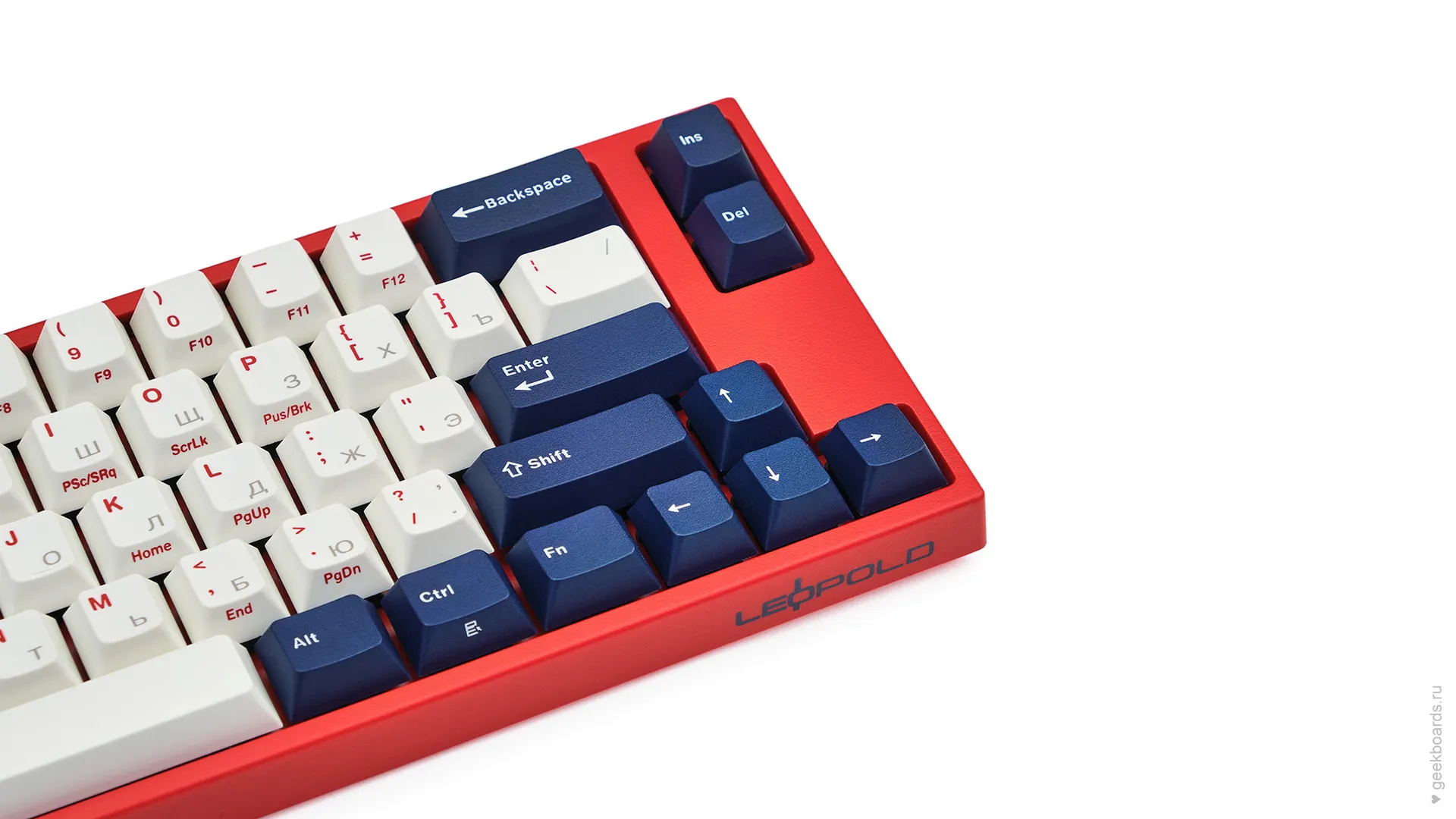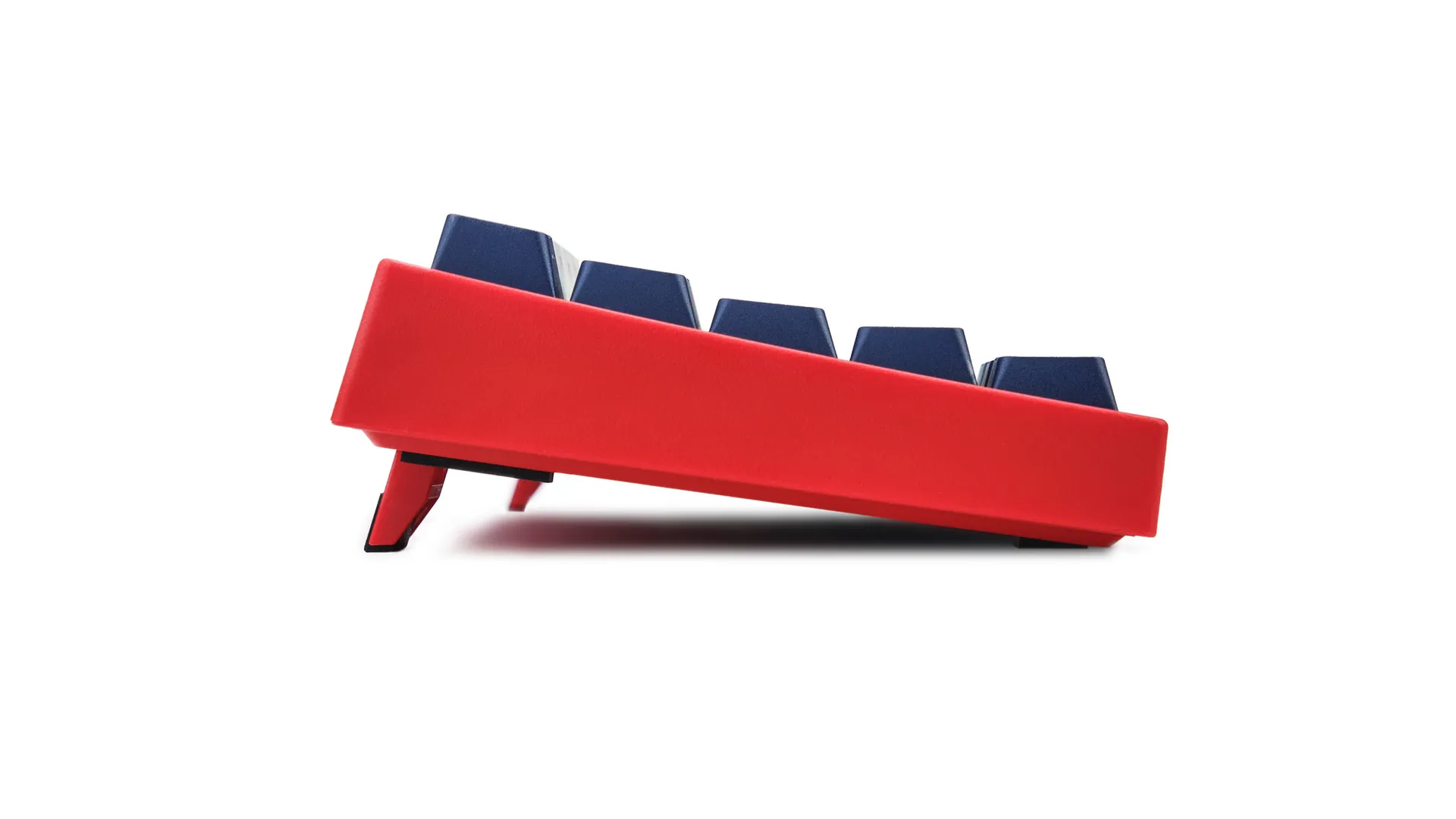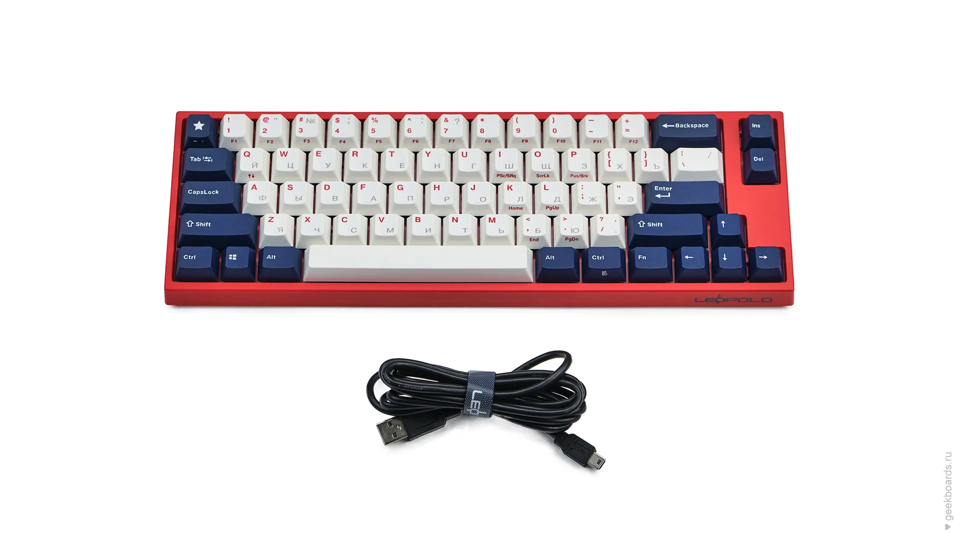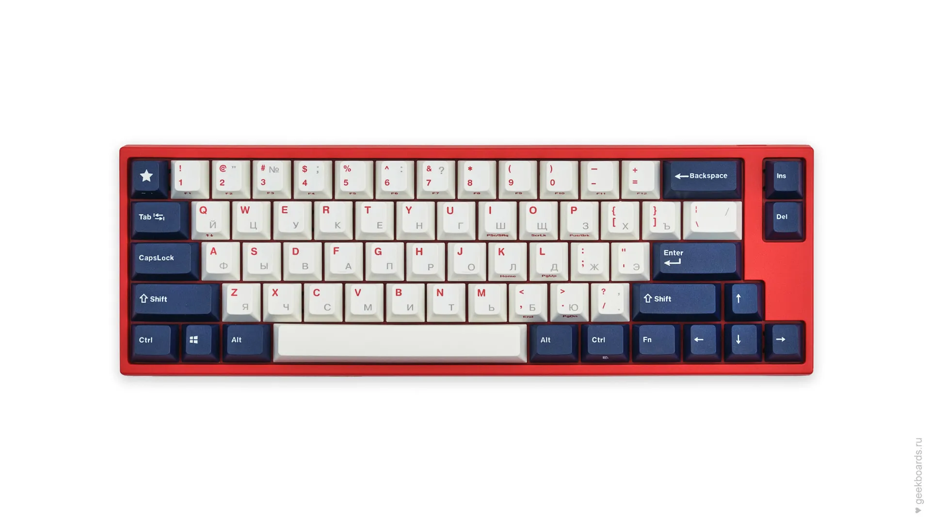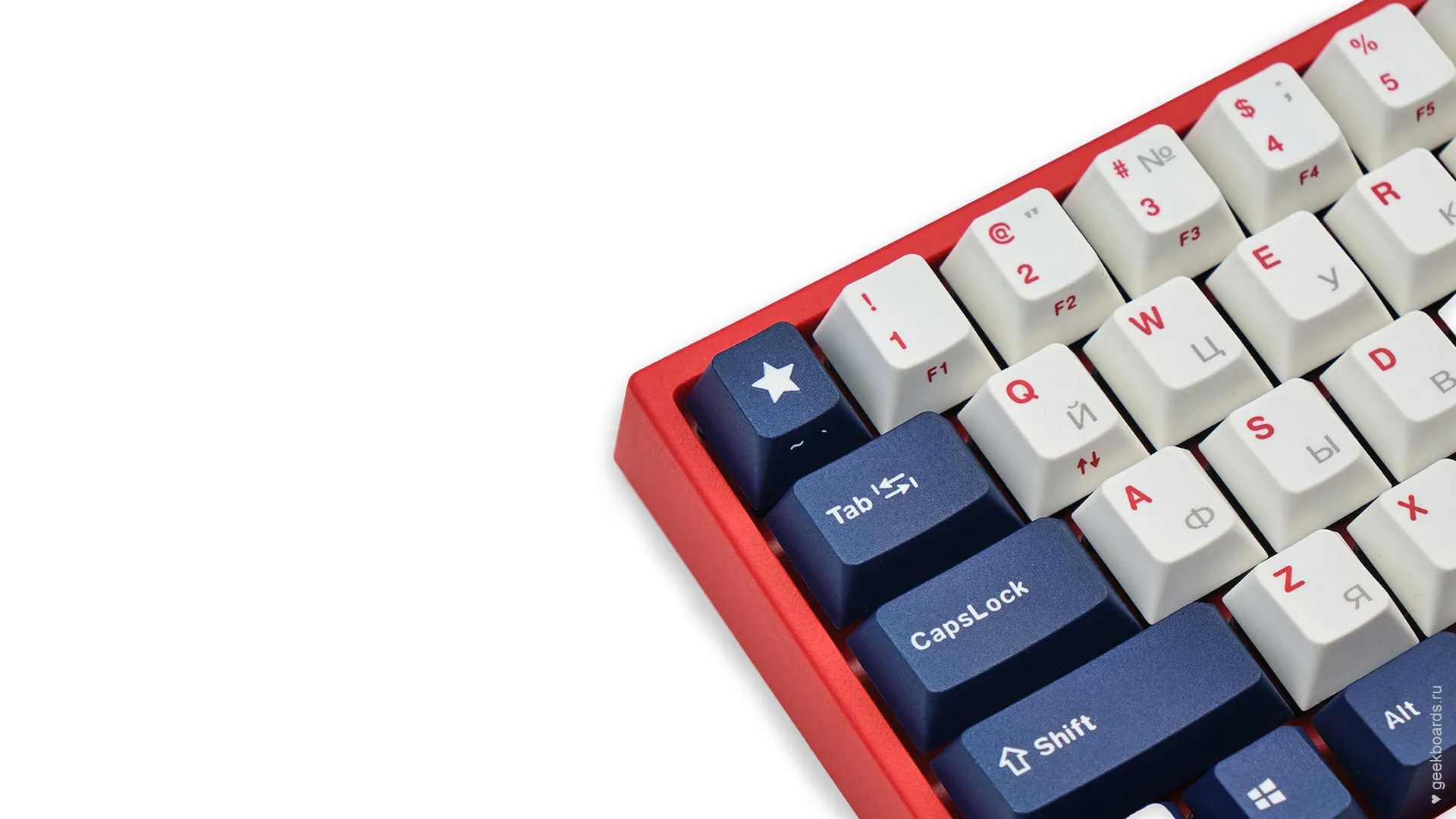 Данная модель имеет красно-белую расцветку с тёмно-синими клавишами-модификаторами — очень смелое и яркое цветовое решение. Собрана клавиатура добротно и монолитно, а сочетание высококачественных double-shot PBT клавиш с переключателями Cherry MX и звукопоглощающей подложки позволяет сделать печать на клавиатуре максимально тихой (насколько это возможно для механики). Mini-USB порт вынесен на верхний правый торец клавиатуры, поэтому если вы часто носите клавиатуру с собой, подключение и отключение клавиатуры будет мгновенным и без лишней возни.