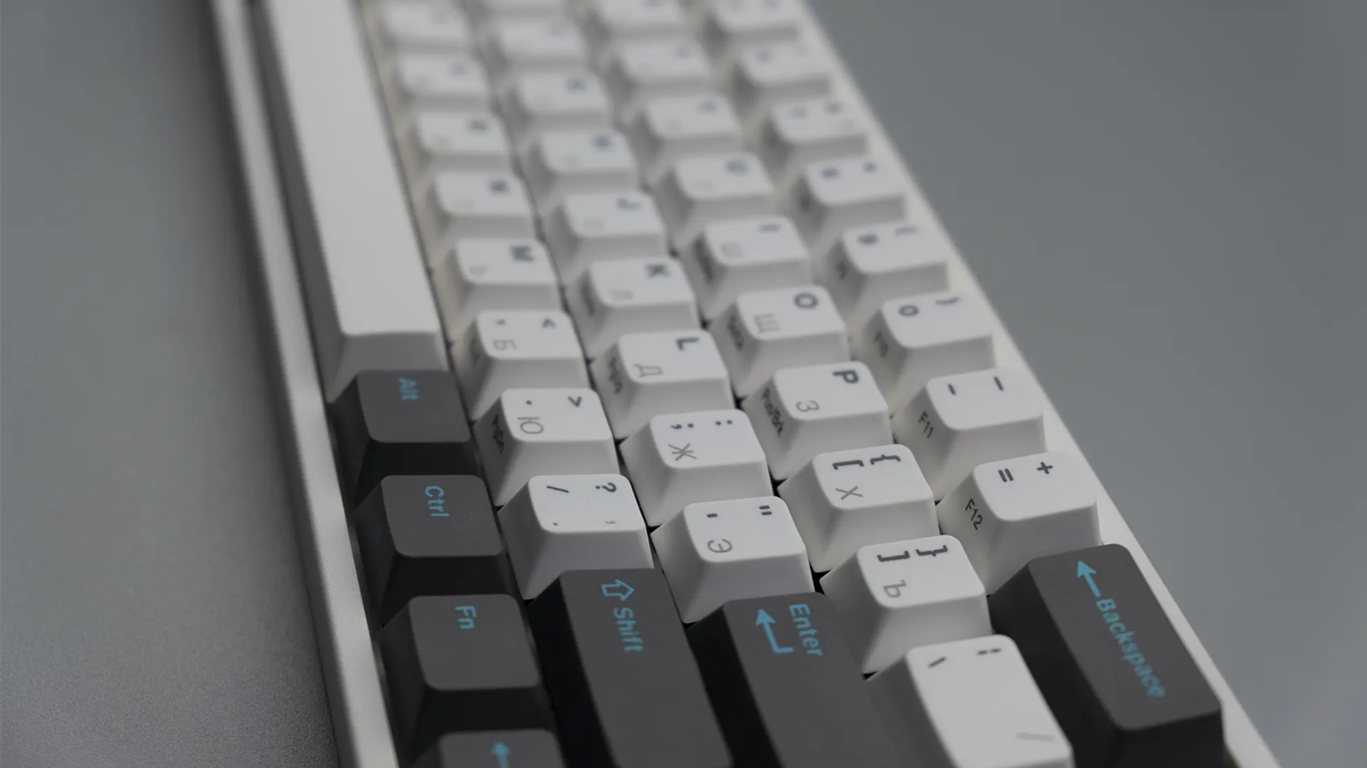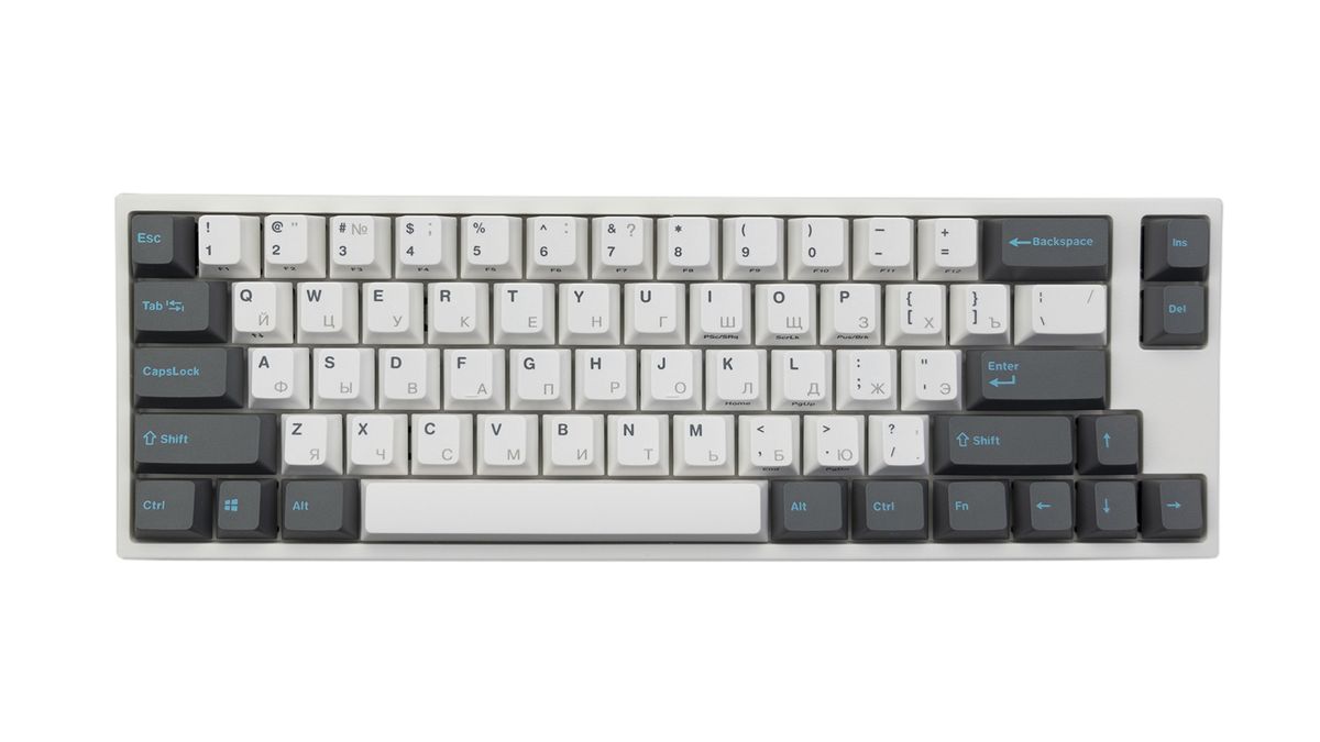 Данная модель имеет светло-серую расцветку с темно-серыми клавишами-модификаторам в духе классических клавиатур 90-х, собрана добротно и монолитно, а сочетание высококачественных double-shot PBT клавиш с переключателями Cherry MX и звукопоглощающей подложкой позволяет сделать печать на клавиатуре максимально тихой (насколько это возможно для механики). Mini-USB порт вынесен на верхний правый торец клавиатуры, поэтому если вы часто носите клавиатуру с собой, подключение и отключение клавиатуры будет мгновенным и без лишней возни.