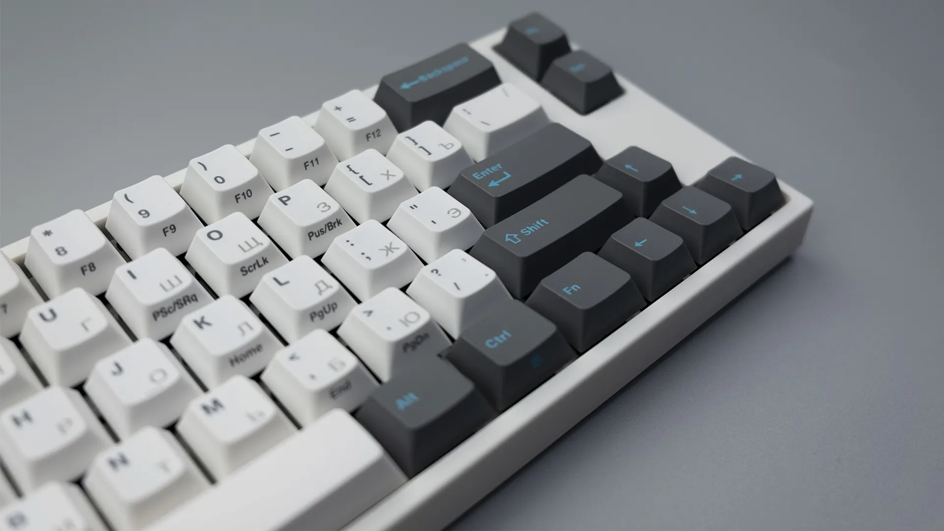 Колпачки изготовлены из высокопрочного пластика PBT с применением double-shot технологии, что гарантирует их долговечность и надежность в эксплуатации, клавиши приятны на ощупь, а при нажатии издают мягкий глухой звук.