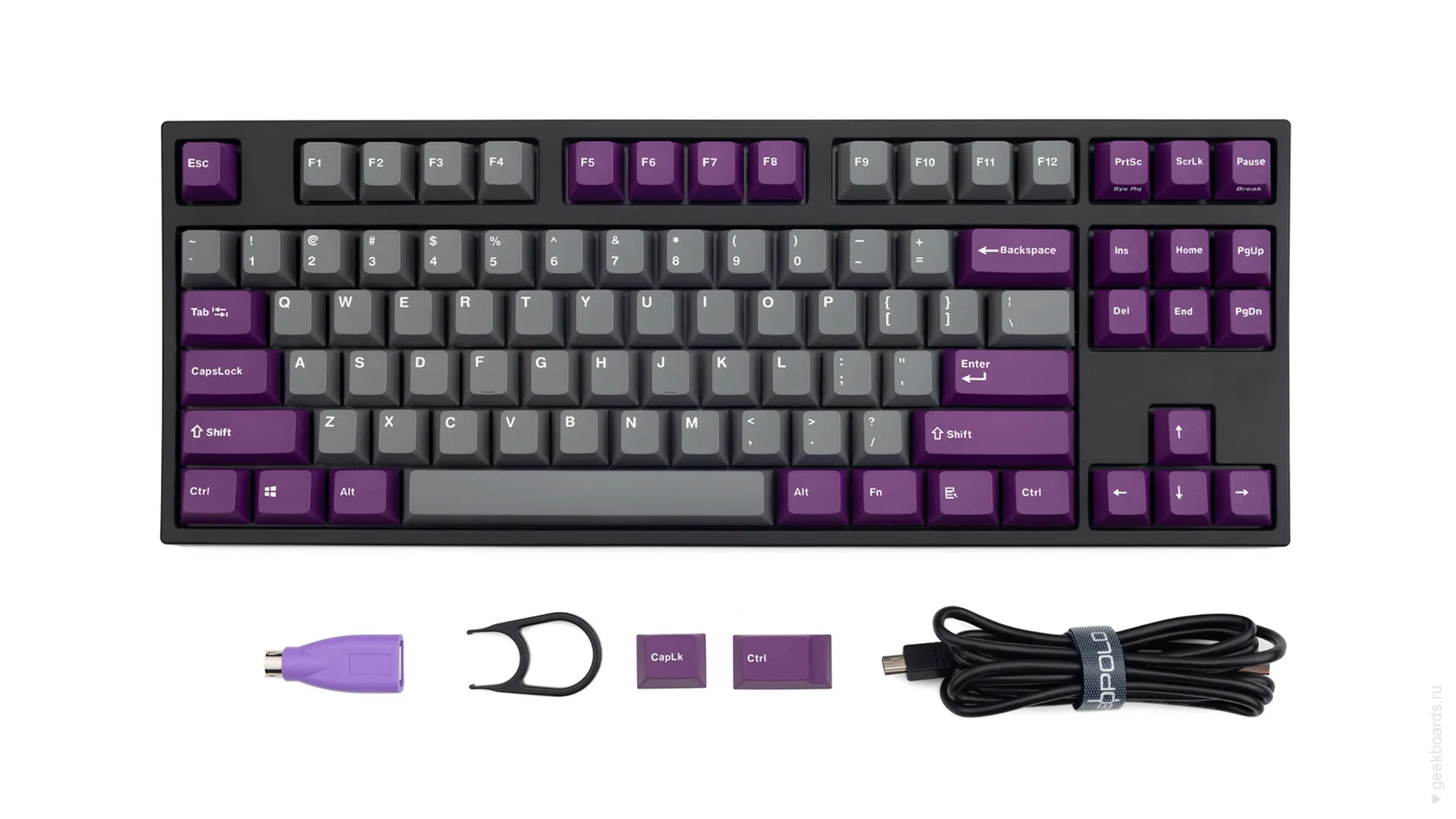 В комплекте есть 2 сменные клавиши для переназначенных клавиш Ctrl и Caps Lock.