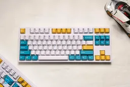 Leopold FC750R BT White-Turquoise-Yellow — беспроводная клавиатура 80% формата с низкопрофильными double-shot PBT кейкапами и заводской шумоизоляцией.