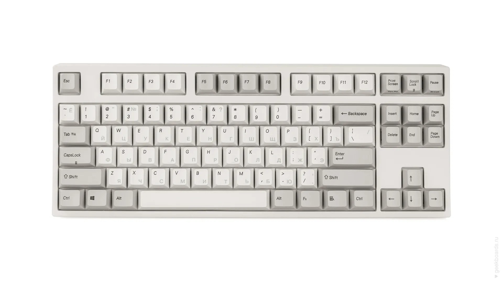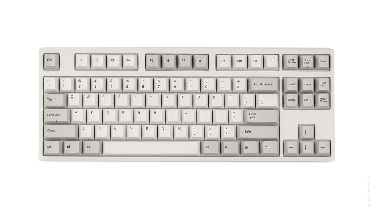 Данная модель имеет белую расцветку с серыми клавишами-модификаторам в духе классических клавиатур 90-х, собрана добротно и монолитно, а сочетание высококачественных dye-sub PBT клавиш с переключателями Cherry MX и звукопоглощающей подложкой позволяет сделать печать на клавиатуре максимально тихой (насколько это возможно для механики). Mini-USB порт спрятан в центре под корпусом, а на самой клавиатуре имеются центральная и две боковые канавки под кабель.