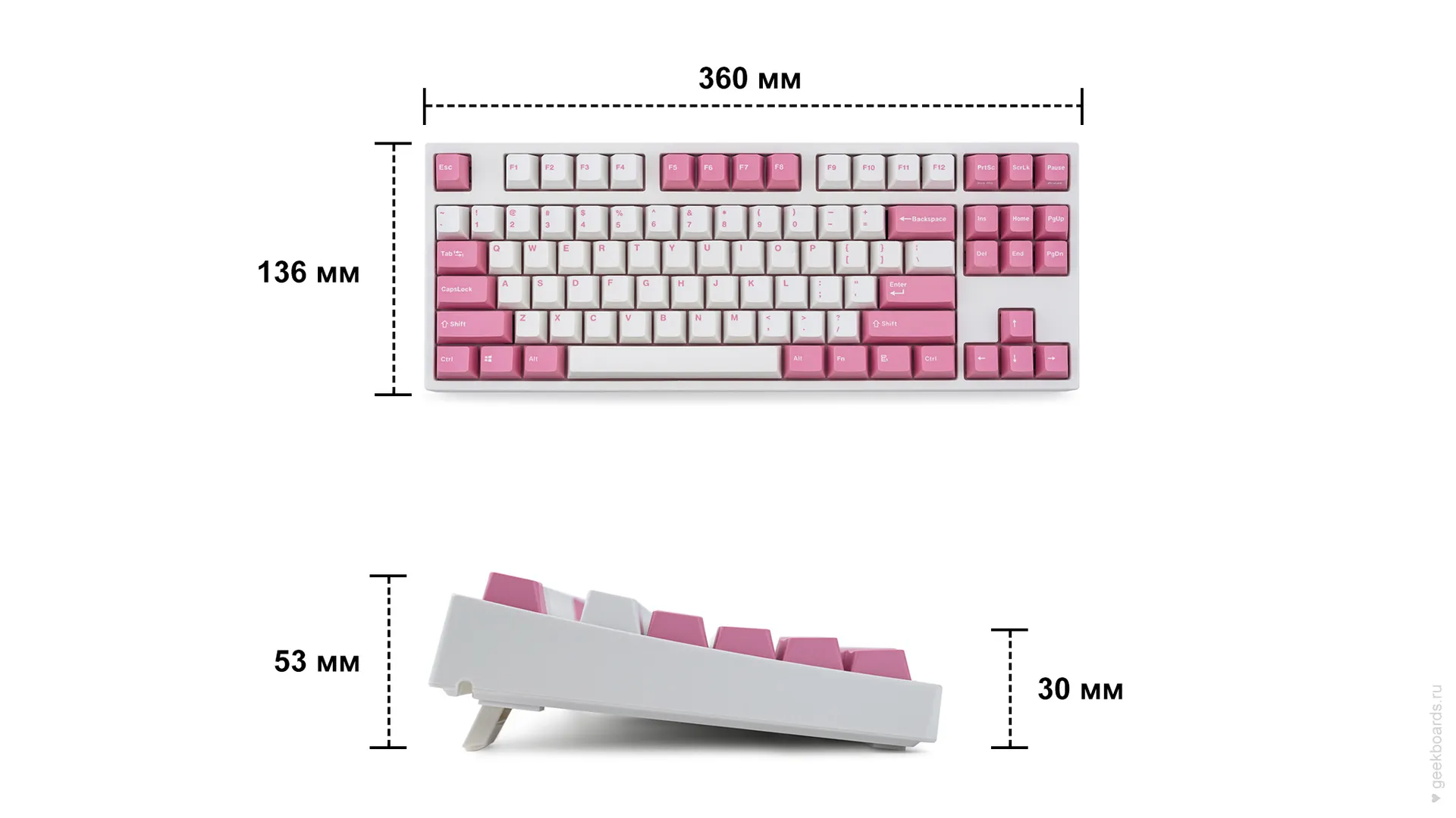 Данная модель имеет няшную бело-розовую расцветку, прямо как у Hello Kitty. Собрана клавиатура добротно и монолитно, а сочетание высококачественных double-shot PBT клавиш с переключателями Cherry MX и звукопоглощающей подложки позволяет сделать печать на клавиатуре максимально тихой (насколько это возможно для механики). Mini-USB порт спрятан в центре под корпусом, а на самой клавиатуре имеются центральная и две боковые канавки под кабель.