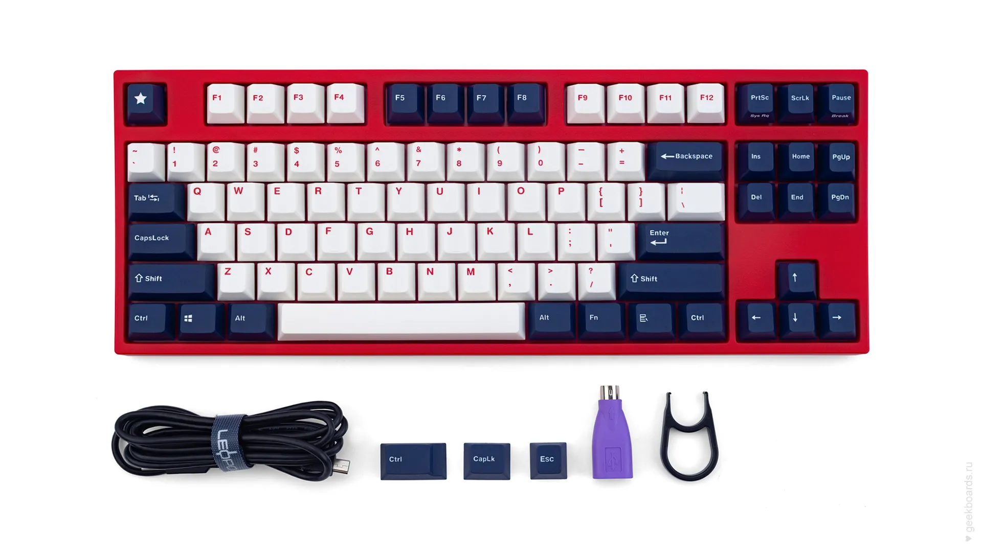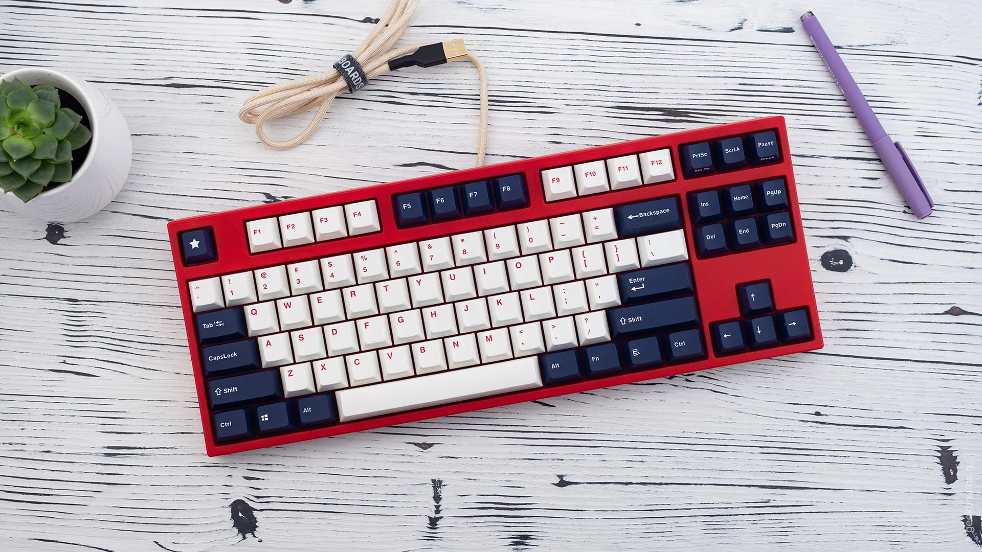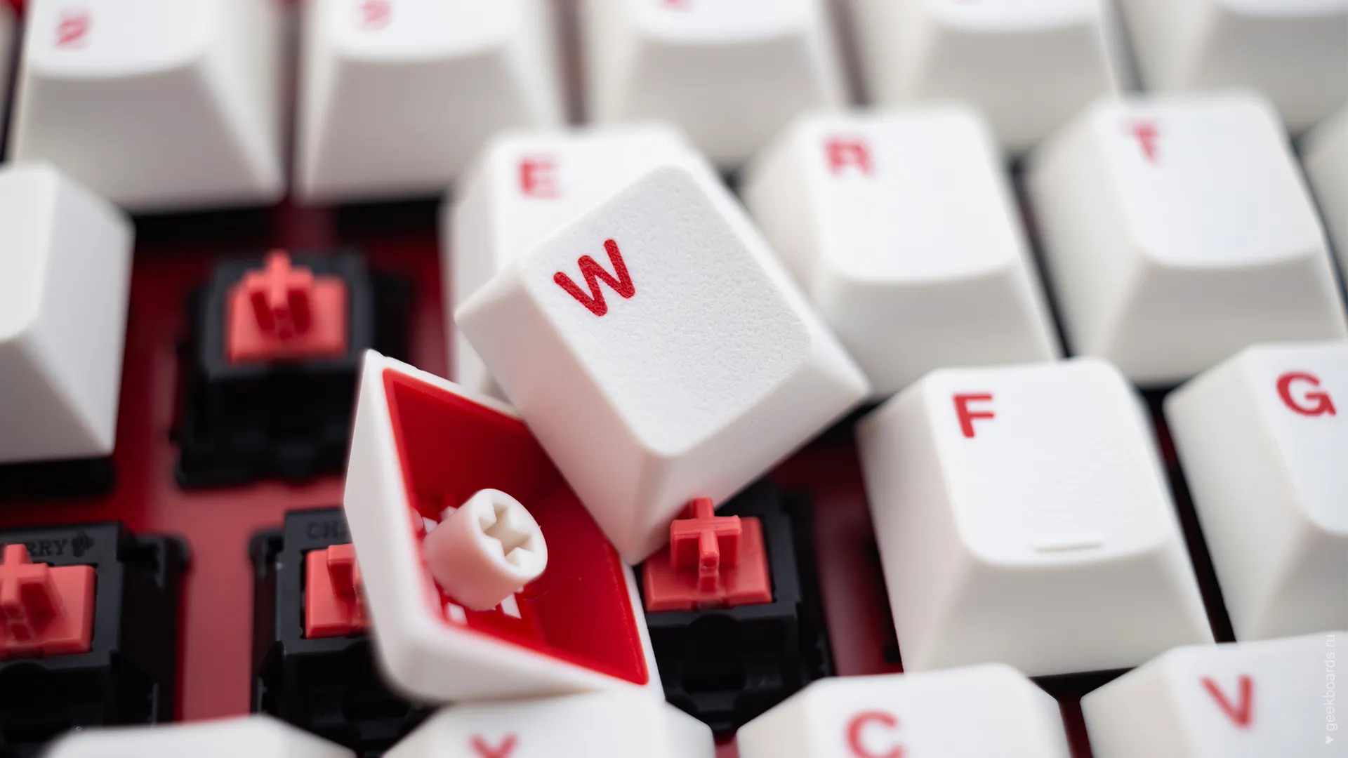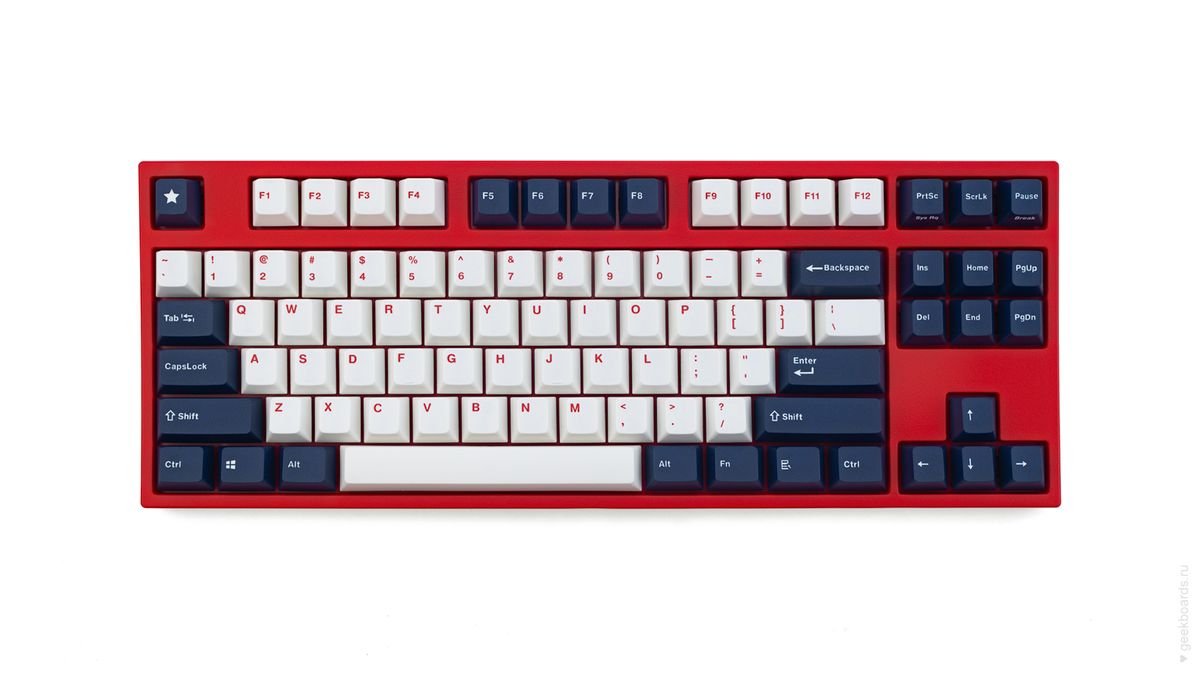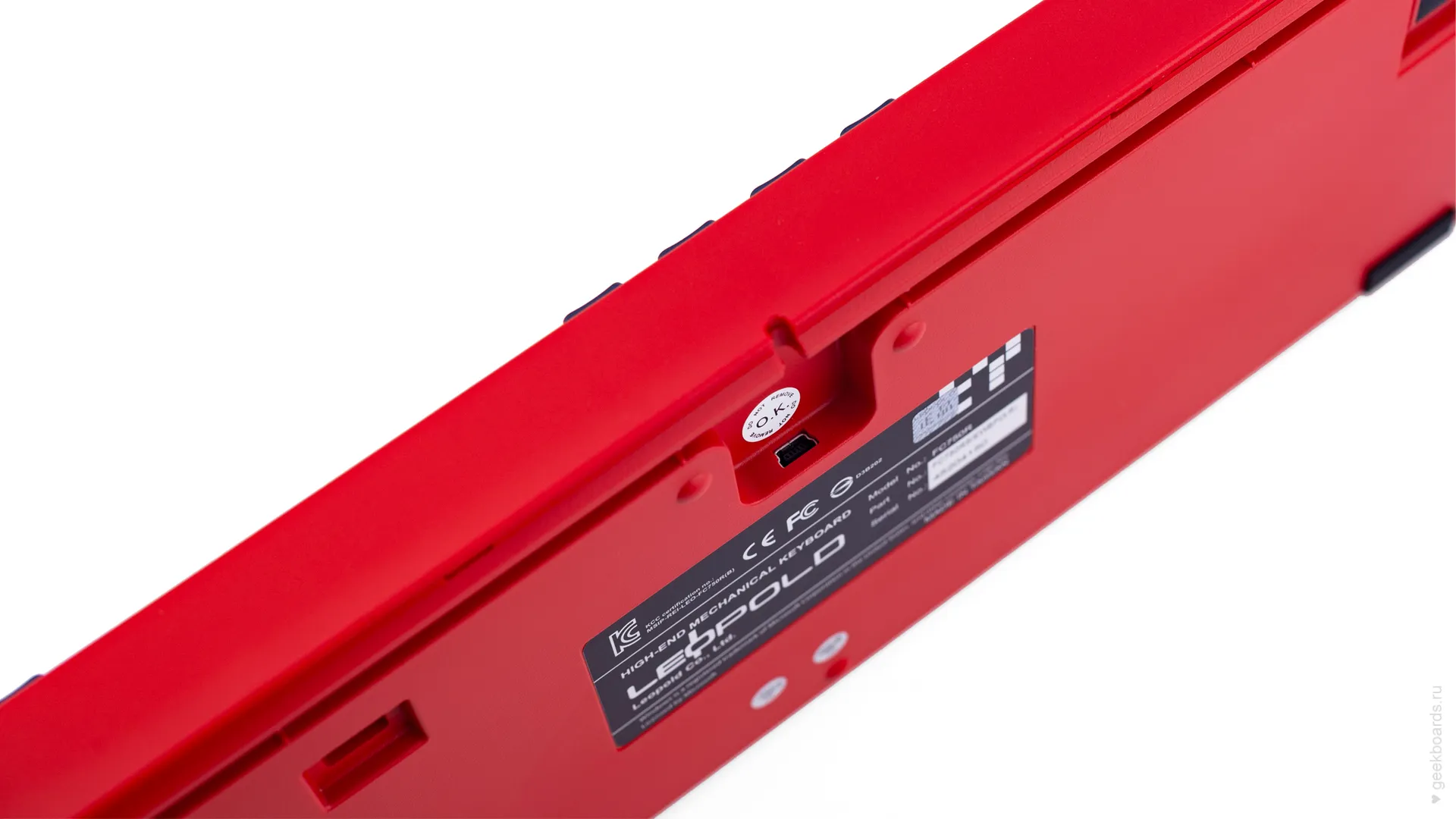 Данная модель имеет красно-белую расцветку с тёмно-синими клавишами-модификаторами — очень смелое и яркое цветовое решение. Клавиатура собрана добротно и монолитно, а сочетание высококачественных double-shot PBT клавиш с переключателями Cherry MX и звукопоглощающей подложки позволяет сделать печать на клавиатуре максимально тихой (насколько это возможно для механики). Mini-USB порт спрятан в центре под корпусом, а на самой клавиатуре имеются центральная и две боковые канавки под кабель.