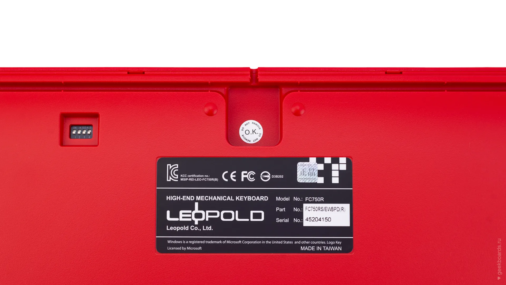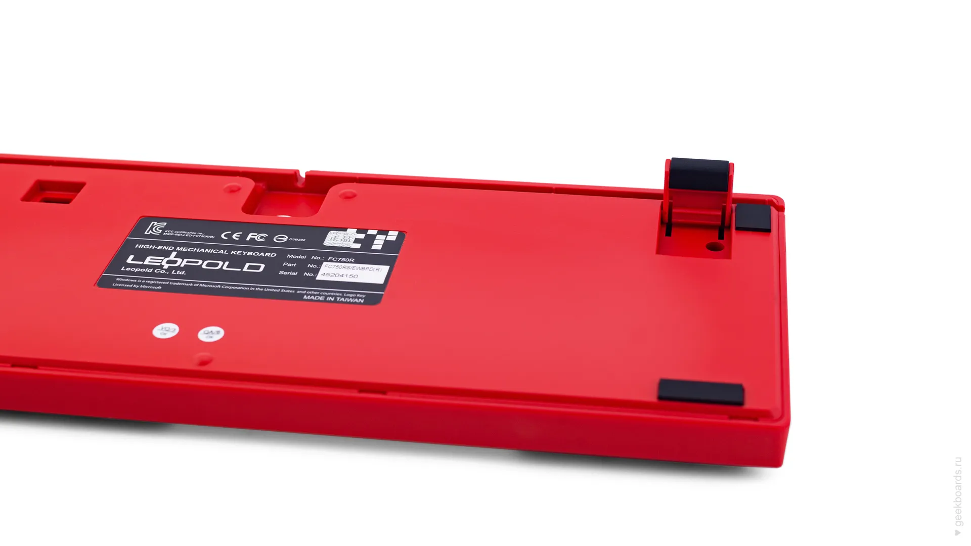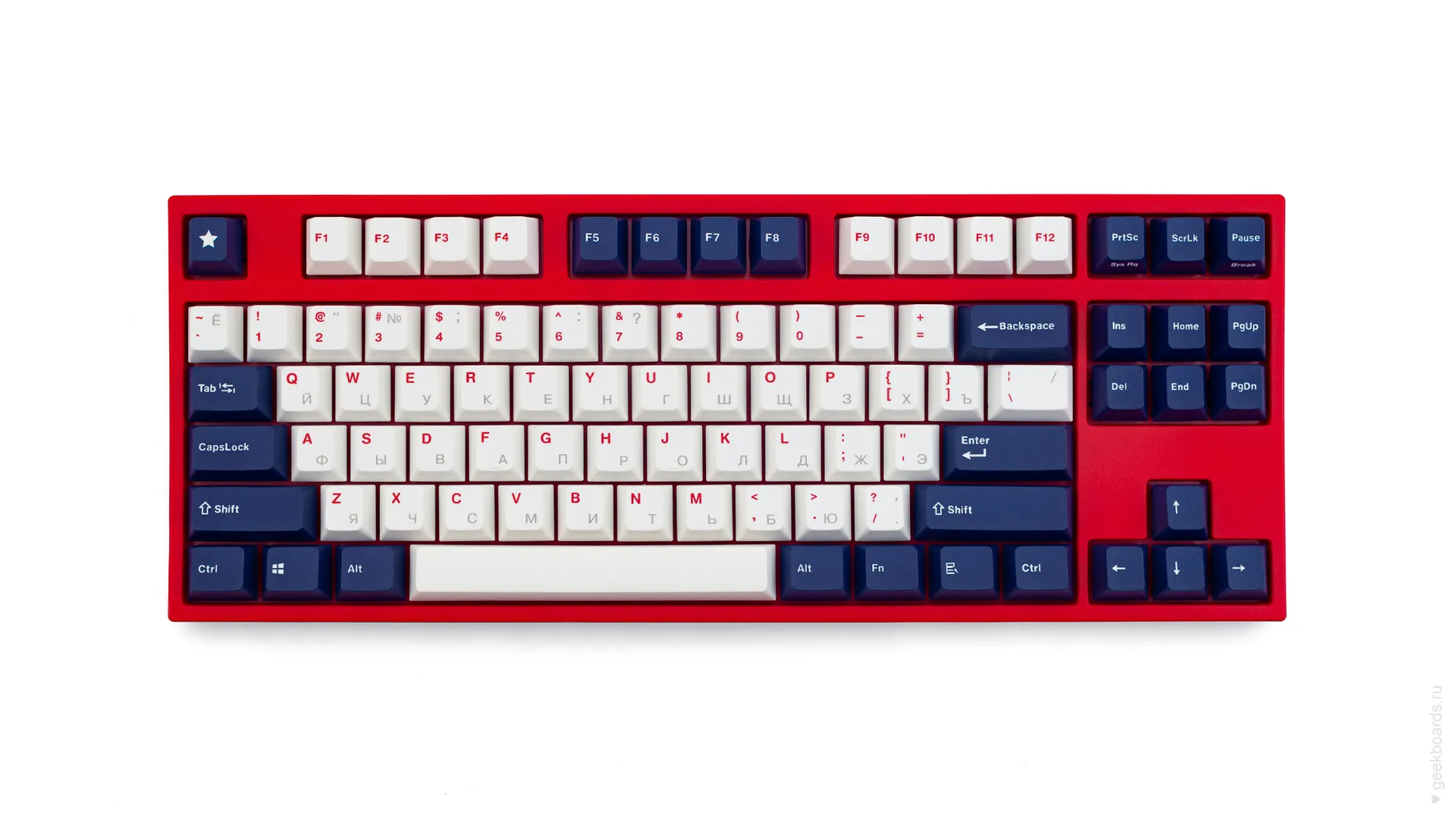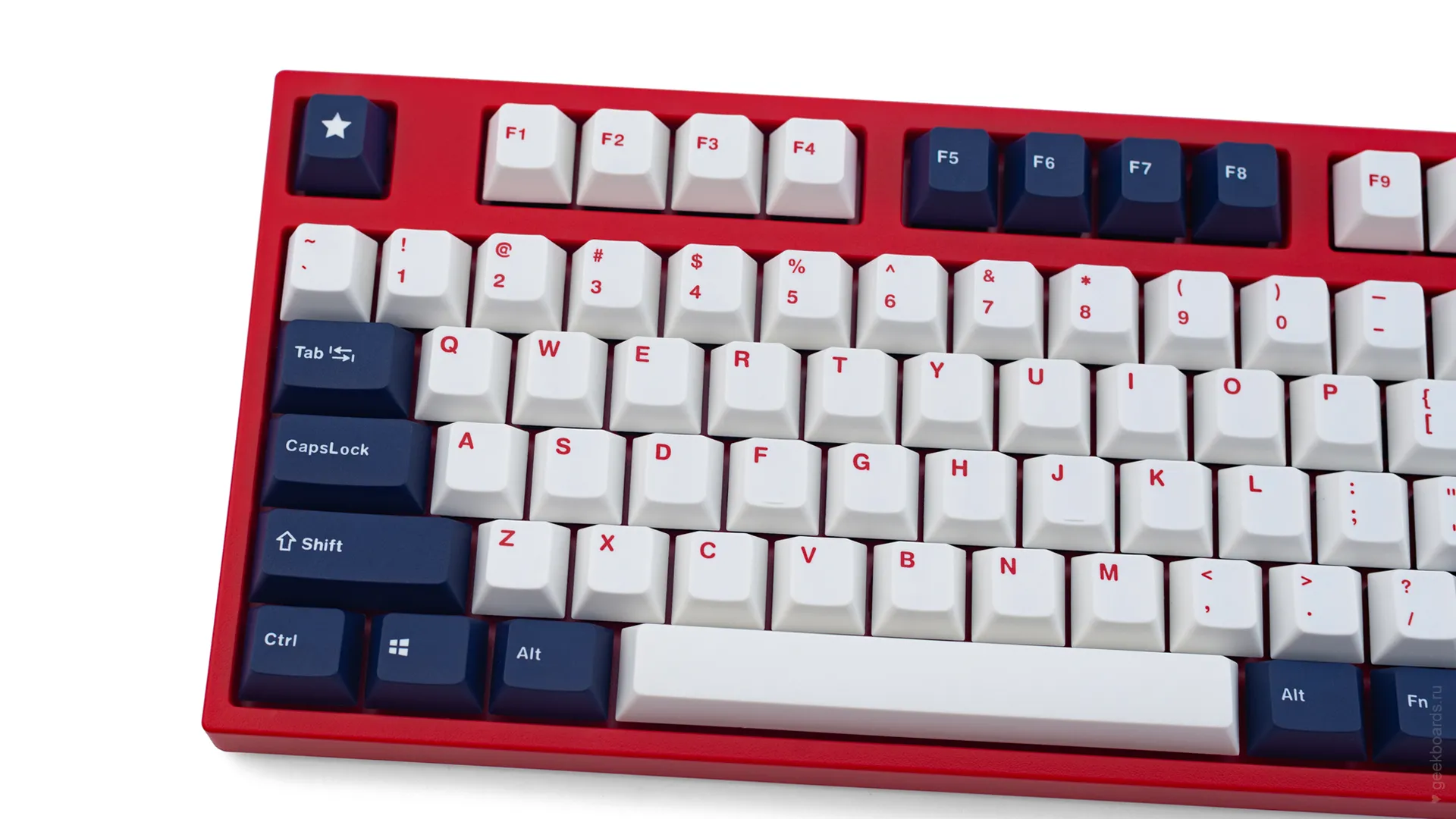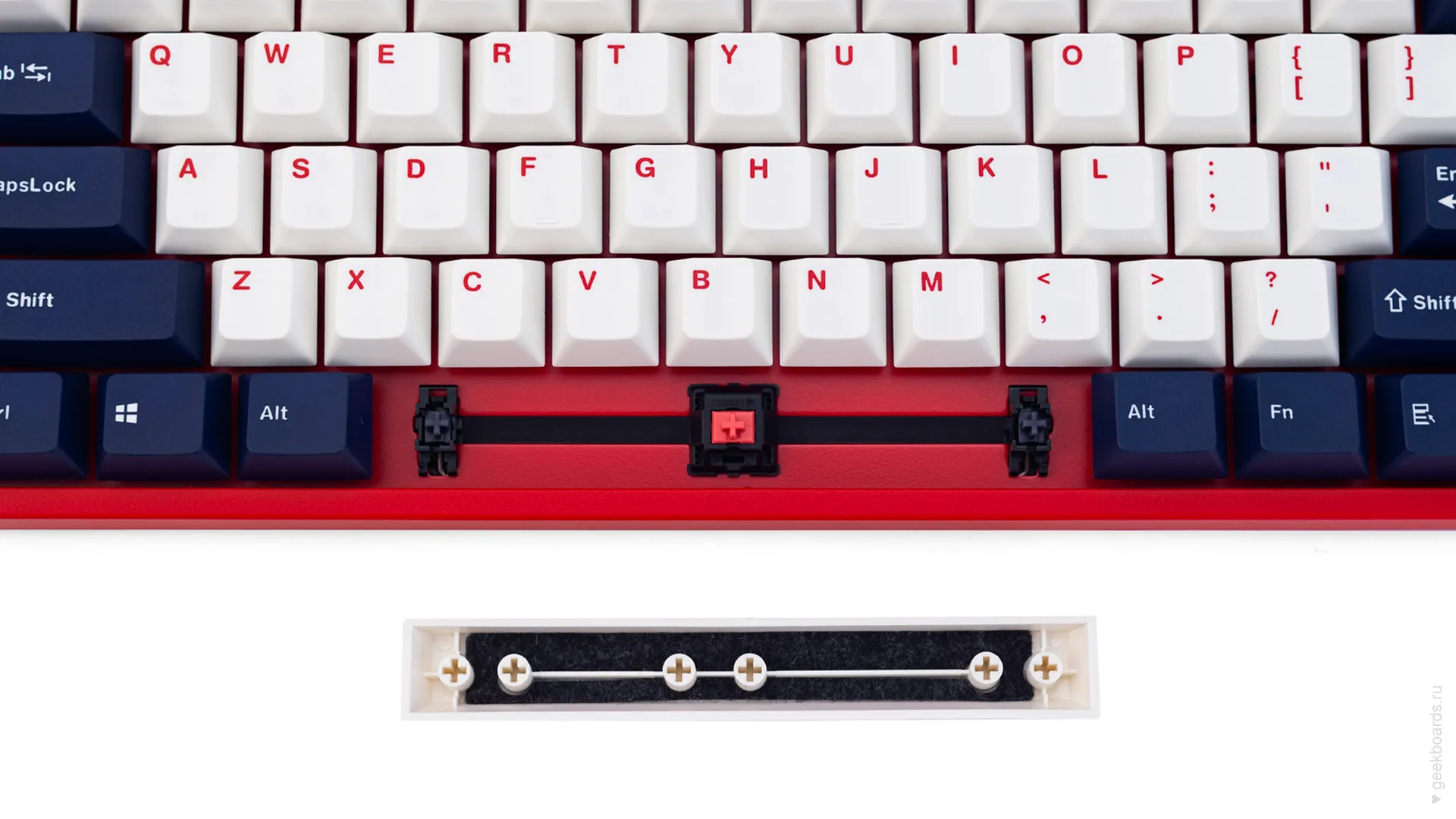 Данная модель имеет красно-белую расцветку с тёмно-синими клавишами-модификаторами — очень смелое и яркое цветовое решение. Клавиатура собрана добротно и монолитно, а сочетание высококачественных double-shot PBT клавиш с переключателями Cherry MX и звукопоглощающей подложки позволяет сделать печать на клавиатуре максимально тихой (насколько это возможно для механики). Mini-USB порт спрятан в центре под корпусом, а на самой клавиатуре имеются центральная и две боковые канавки под кабель.