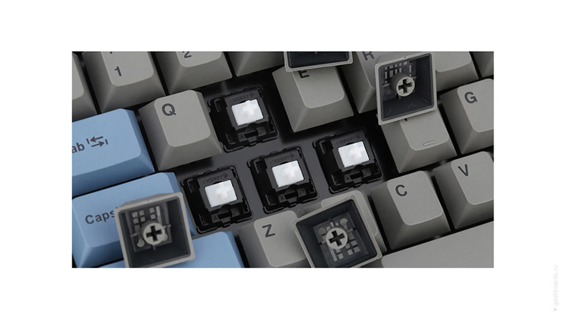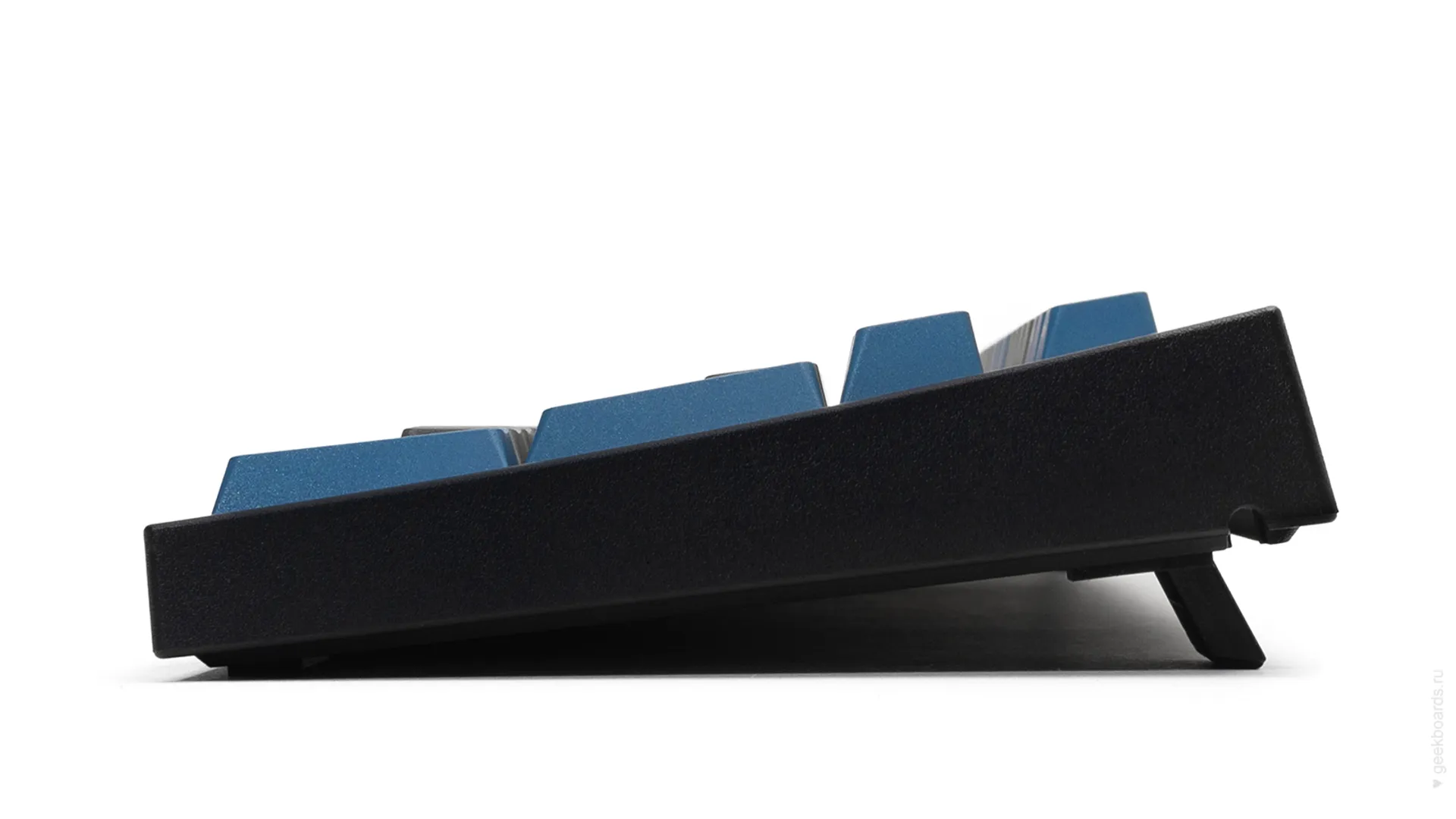 Данная модель представлена в сером окрасе с голубыми клавишами-модификаторами, расцветка выглядит очень сочно и является одной из самых популярных. Клавиатура собрана добротно и монолитно, а сочетание высококачественных double-shot PBT клавиш с переключателями Cherry MX и звукопоглощающей подложкой позволяет сделать печать на клавиатуре максимально тихой (насколько это возможно для механики). Mini-USB порт спрятан в центре под корпусом, а на самой клавиатуре имеются центральная и две боковые канавки под кабель.