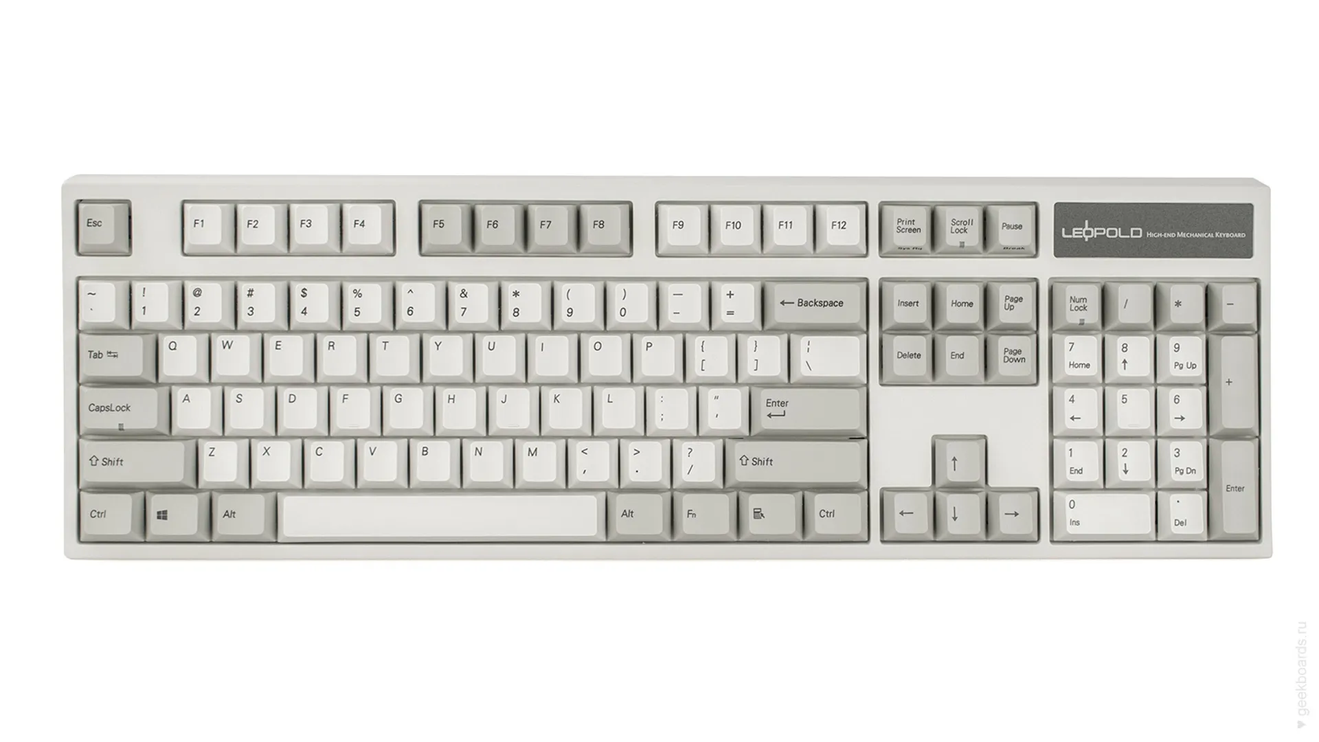 Данная модель имеет белую расцветку с серыми клавишами-модификаторам в духе классических клавиатур 90-х, собрана добротно и монолитно, а сочетание высококачественных dye-sub PBT клавиш с переключателями Cherry MX и звукопоглощающей подложкой позволяет сделать печать на клавиатуре максимально тихой (насколько это возможно для механики). Mini-USB порт спрятан в центре под корпусом, а на самой клавиатуре имеются центральная и две боковые канавки под кабель.