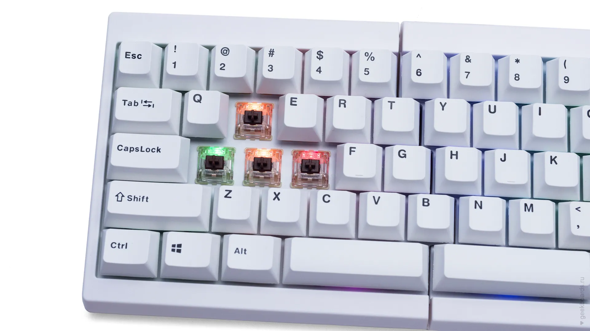 Клавиатура имеет RGB подсветку, клавиши выполнены из долговечного Double Shot PBT пластика, а в качестве переключателей используются Cherry MX.