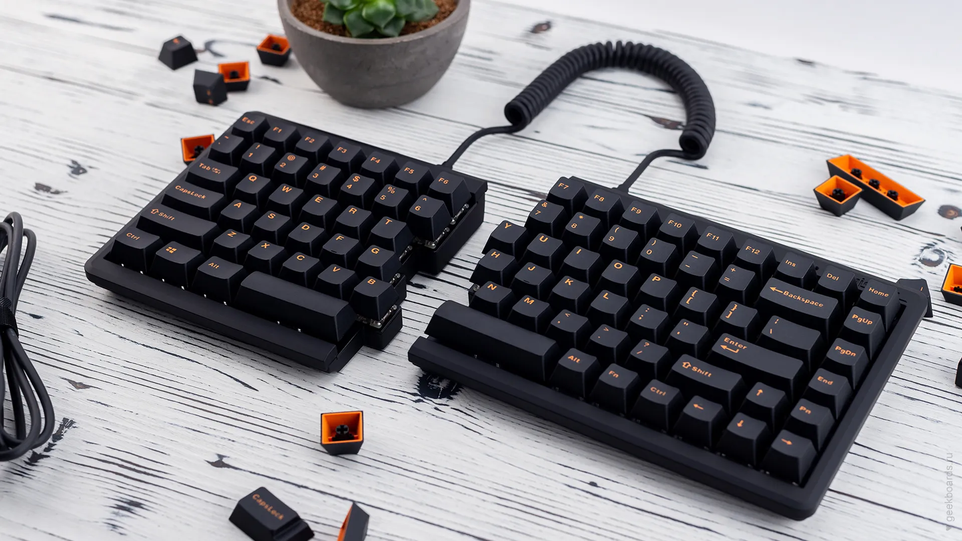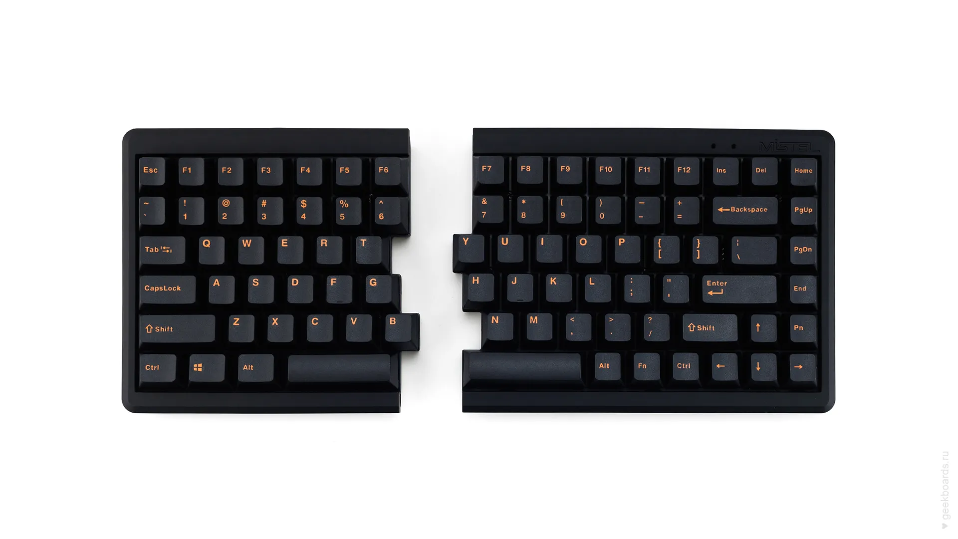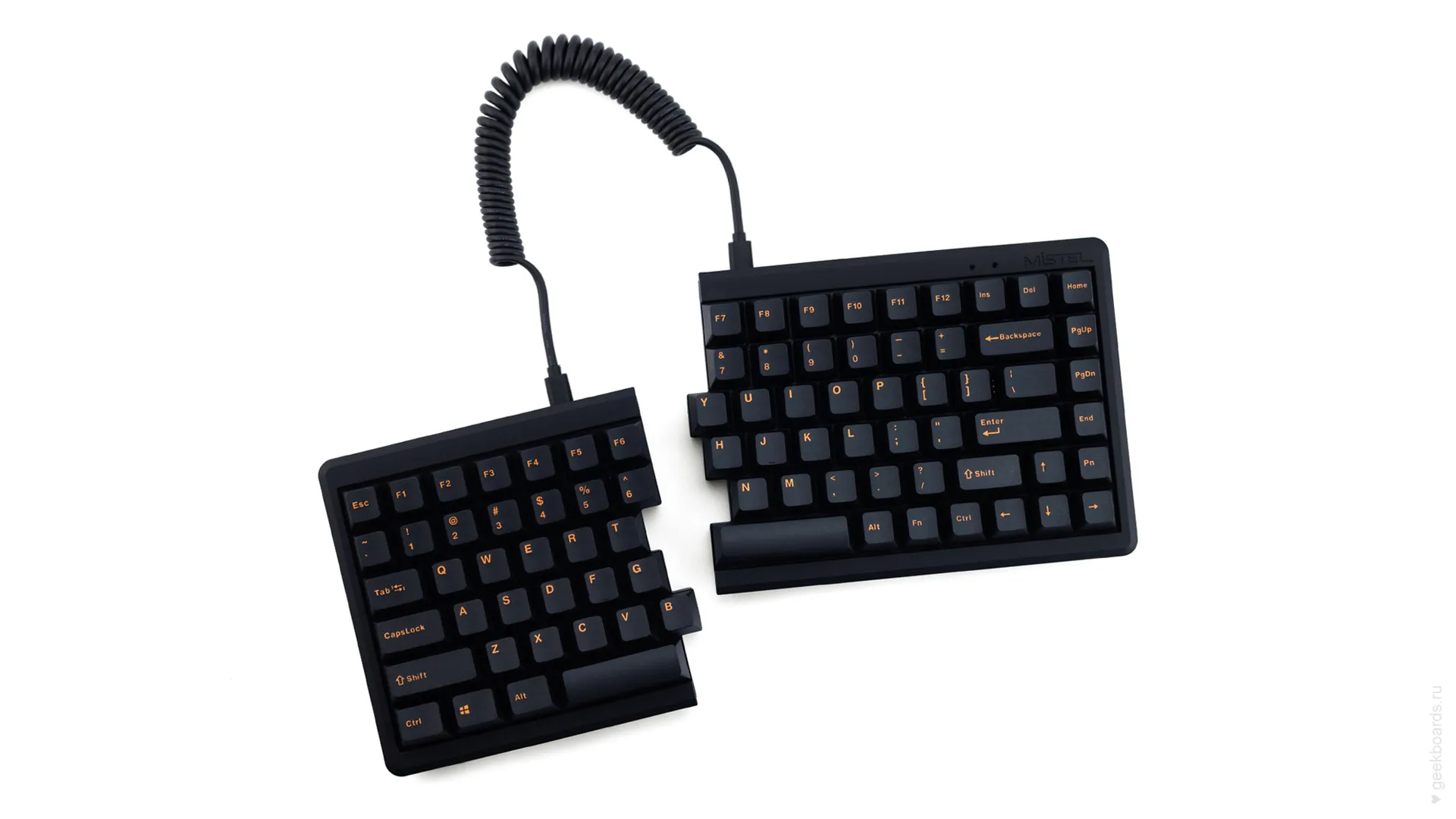 Mistel — тайваньская компания, которая славится своими сплитами. Сплит — это эргономический форм-фактор, фишка которого в разделении клавиатуры на две отдельные части. Такой подход позволяет расположить запястья анатомически ровно, благодаря чему руки меньше устают при работе.
