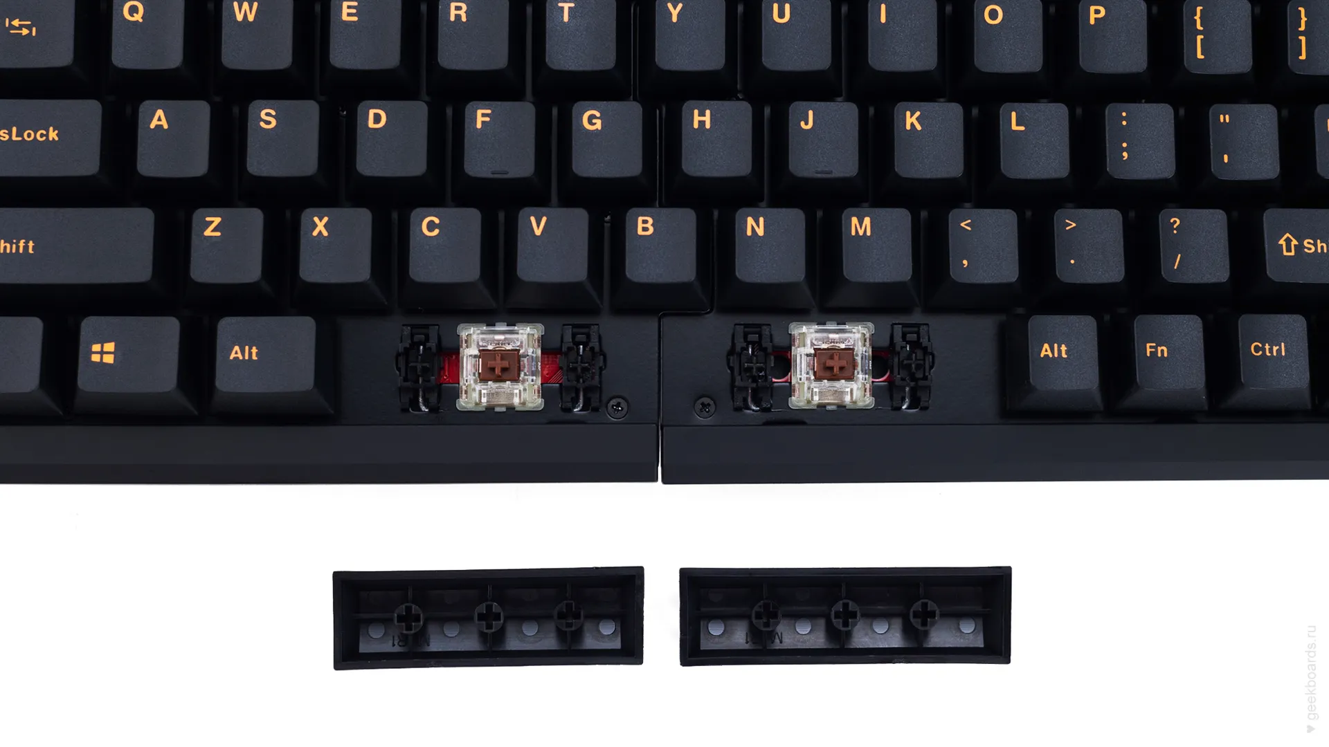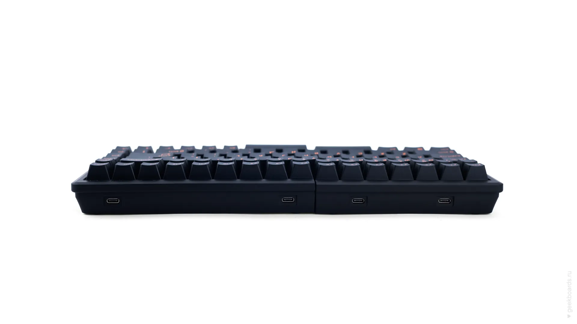 Вся клавиатура программируется, включая разделённую клавишу пробела, каждую из частей которого можно настроить отдельно. Поддерживаются 3 слоя макросов.