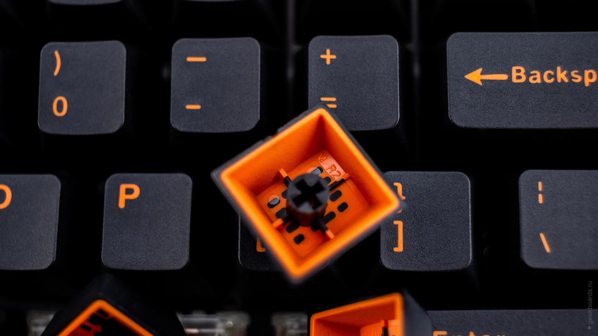 Клавиатура имеет RGB подсветку, клавиши выполнены из долговечного Double Shot PBT пластика, а в качестве переключателей используются Cherry MX.