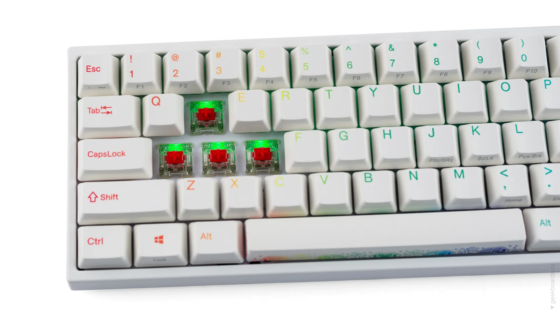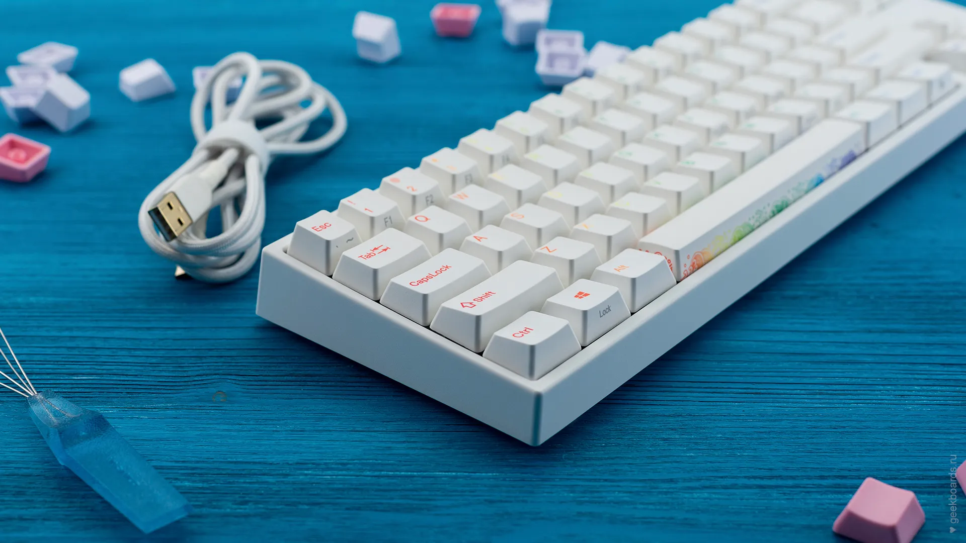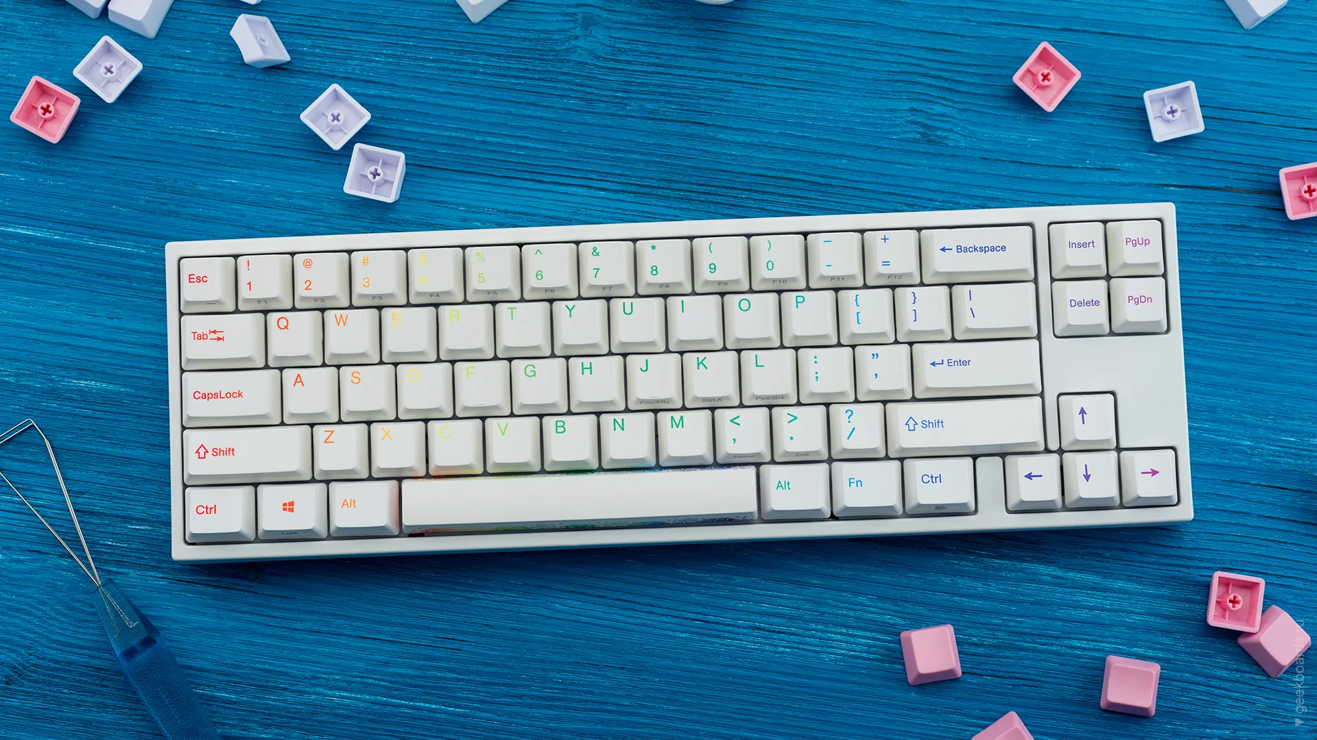 Сочетание стабилизаторов и смазки позволяет добиться максимально равномерного и плавного хода клавиш enter/space/shift/backspace, а сами клавиши легко снять с клавиатуры.