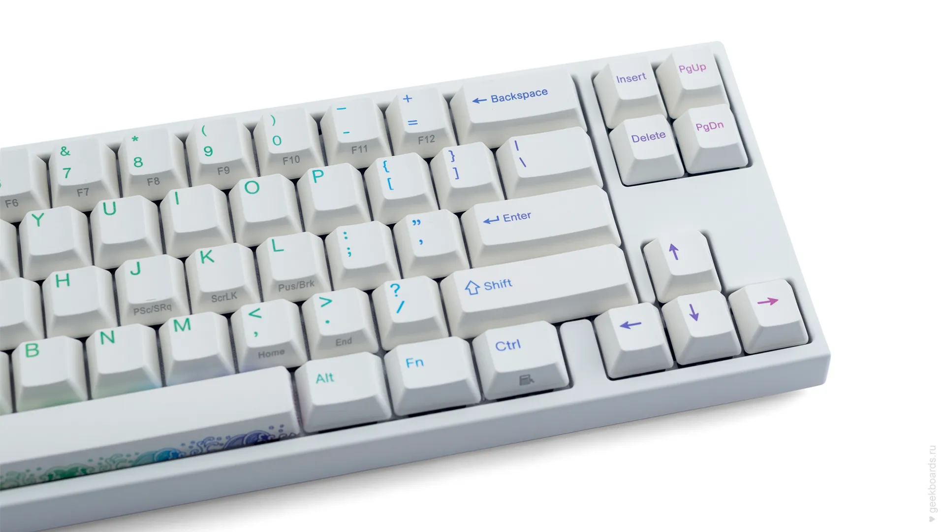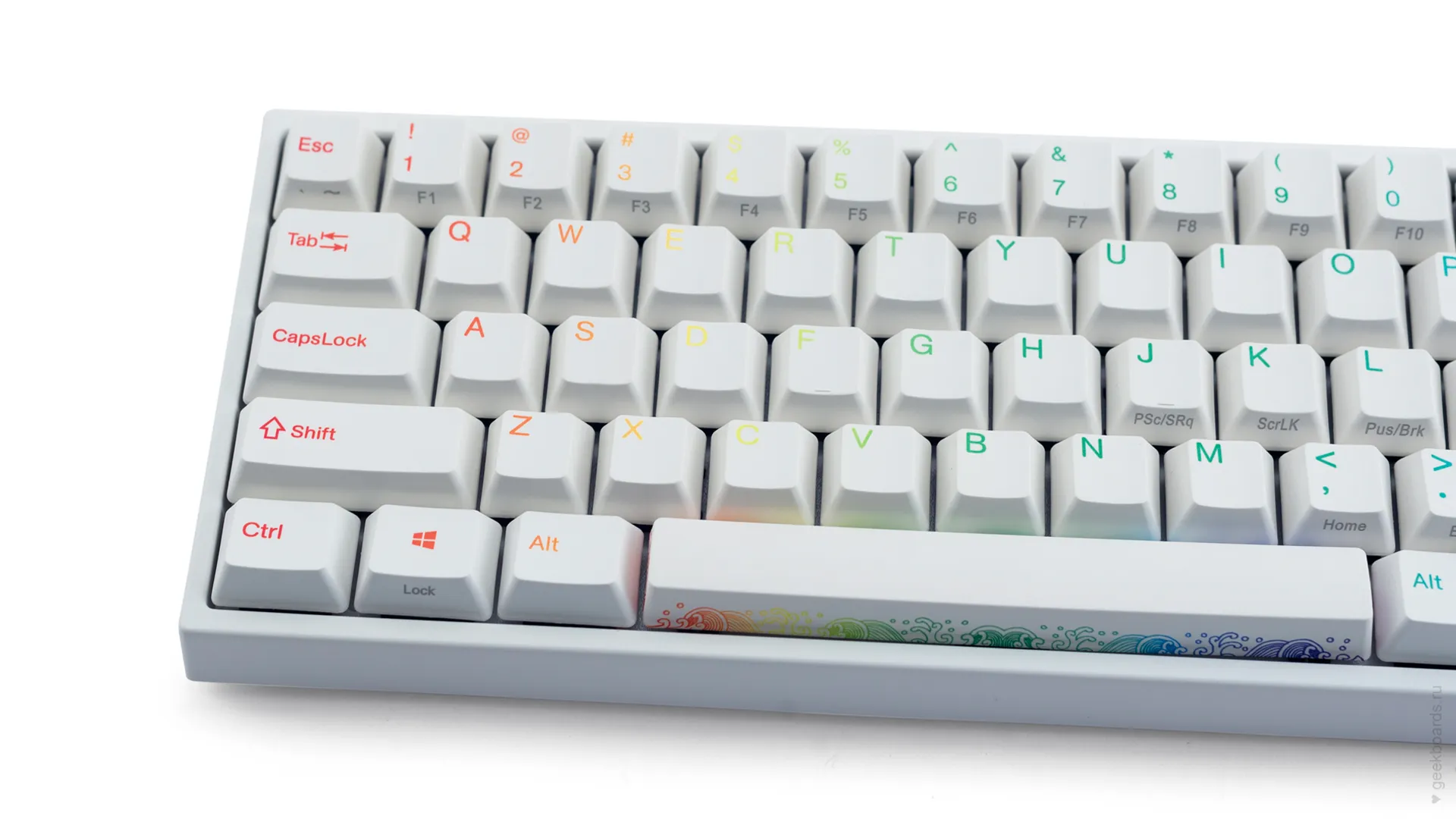 Клавиши изготовлены из высокопрочного пластика PBT с применением dye-sublimation технологии, с выгравированными символами на боках. Использование dye-sub позволяет символам никогда не стираться и никак не чувствоваться при печати, а качественный PBT пластик гарантирует надежность и долговечность.