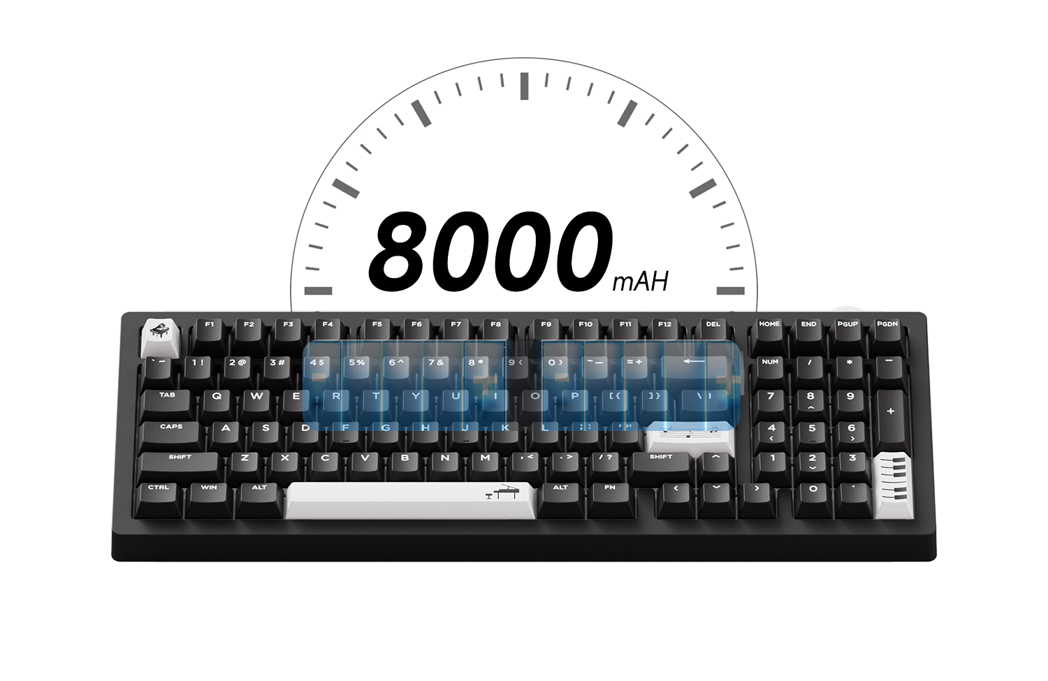 Встроенный аккумулятор на 8000 мАч обеспечивает длительное время автономной работы. Клавиатура подходит как для стационарного использования, так и для беспроводных сетапов, позволяя долго работать или играть без необходимости частой подзарядки.