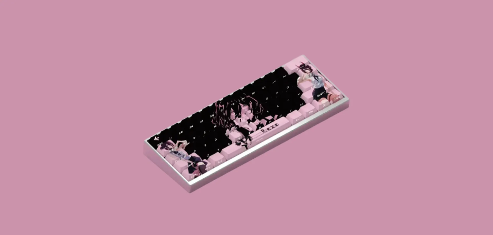Аниме-набор клавиш, посвящённый персонажу Резе из «Chainsaw Man». Комбинация розового, чёрного и кремового цветов создаёт яркий акцент, а рисунки на кейкапах складываются в полноценное изображение героини прямо на клавиатуре. Набор разработан для тех, кто хочет совместить комфорт печати и выразительный дизайн.