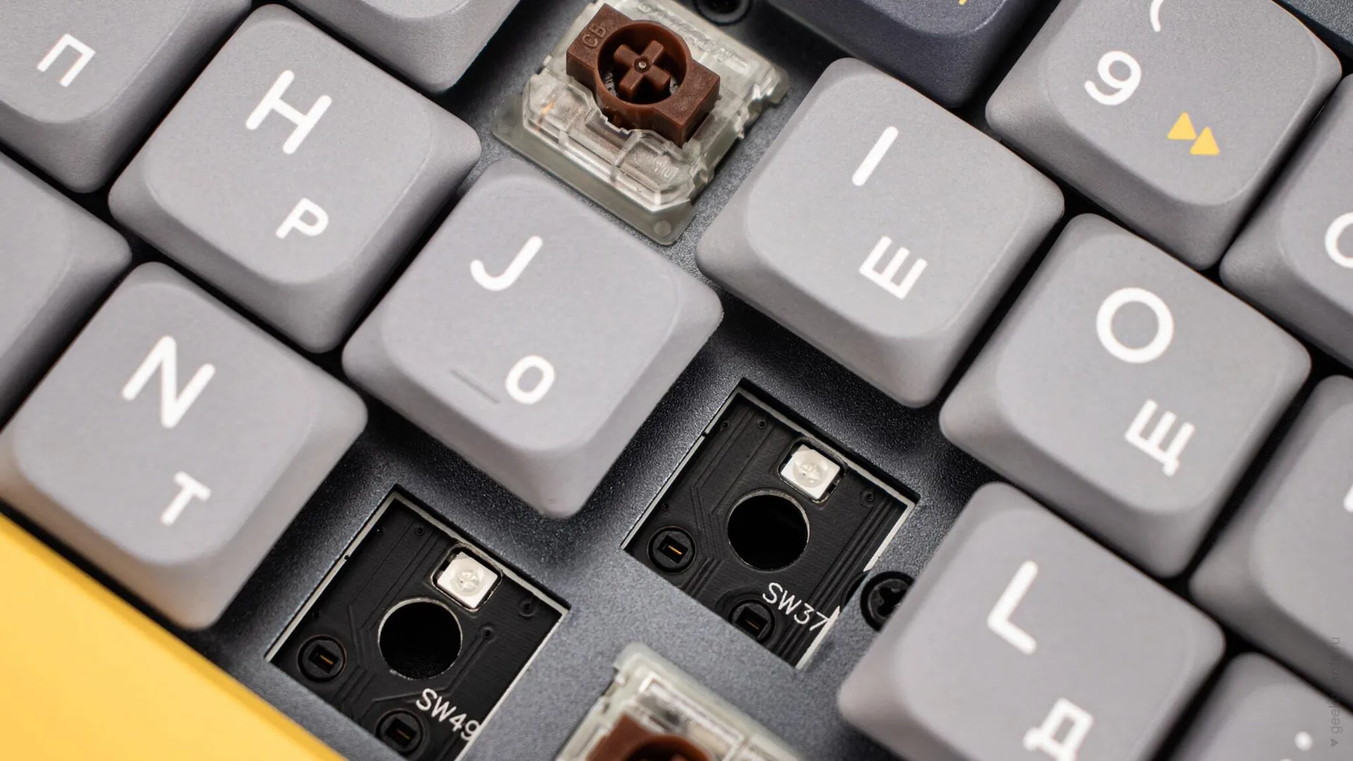 Специальные сокеты позволяют заменить переключатели на другие совместимые без паяльника. Для этой клавиатуры подойдут только механические Gateron Low Profile.