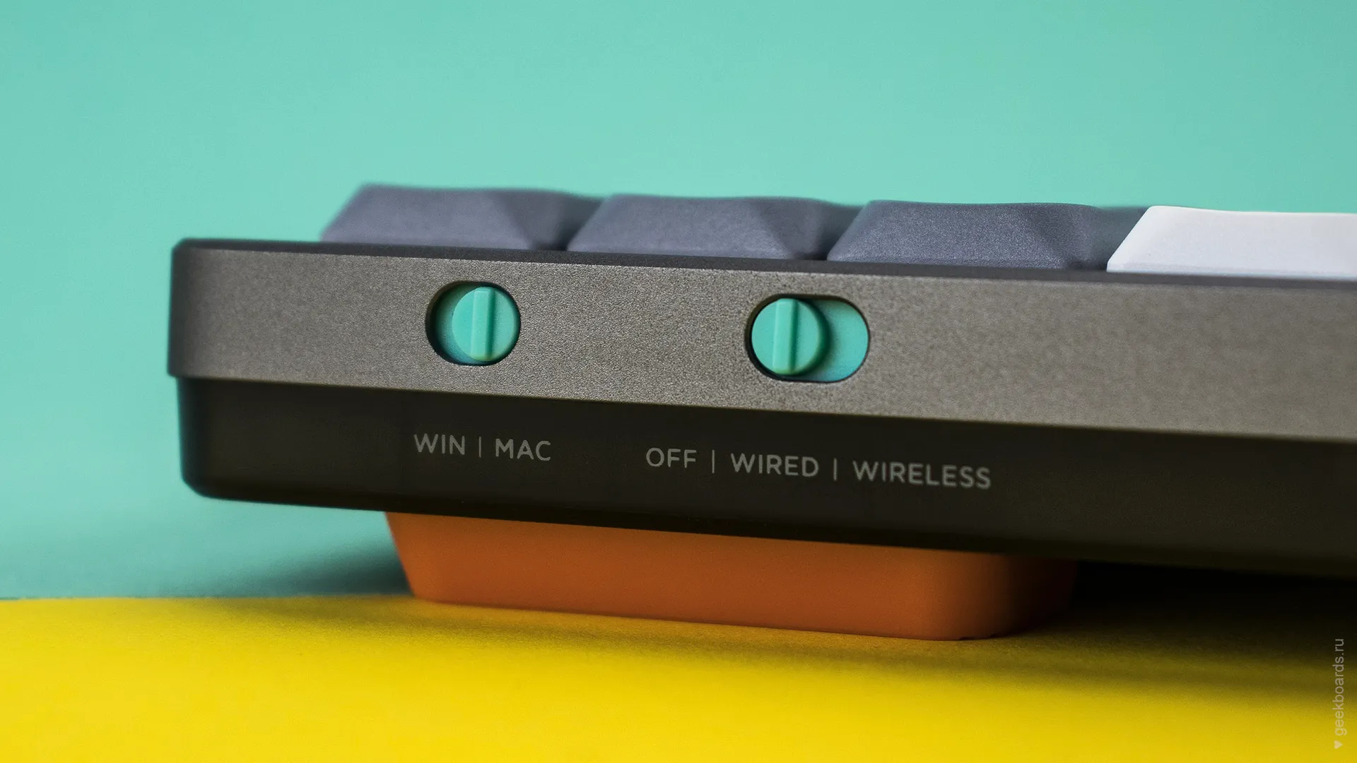 Клавиатуру можно подключить через Bluetooth, адаптер 2.4g или кабель USB Type-C. Переключатель на задней панели позволяет задать нужный режим. Bluetooth режим поддерживает подключение четырех устройств одновременно. В беспроводном режиме клавиатура работает до 48 часов без подзарядки в режиме RGB с минимальной яркостью.