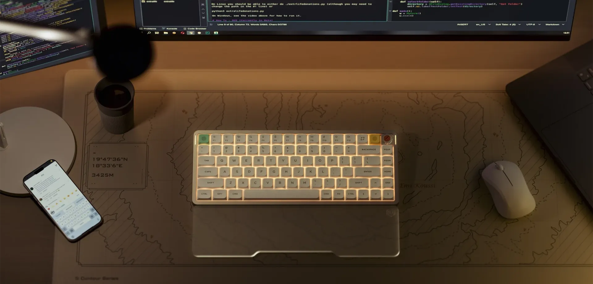 Три типа низкопрофильных свитчей — бесшумные Blush, классические Red и тактильные Brown Nano — с плавным ходом и глубоким звуком.