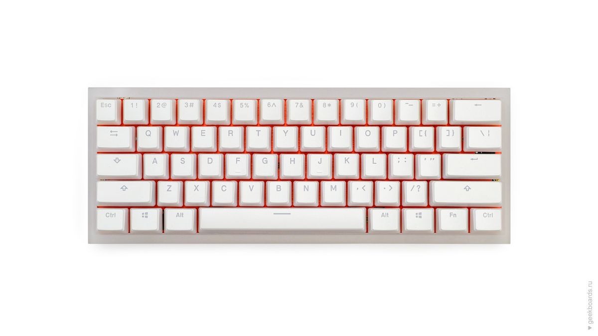 Клавиши OEM профиля с полупрозрачными боками, пропускающими подсветку. Материалом изготовления послужил высокопрочный пластик PBT с применением doubleshot технологии, что гарантирует клавишам долговечность и надёжность в эксплуатации.