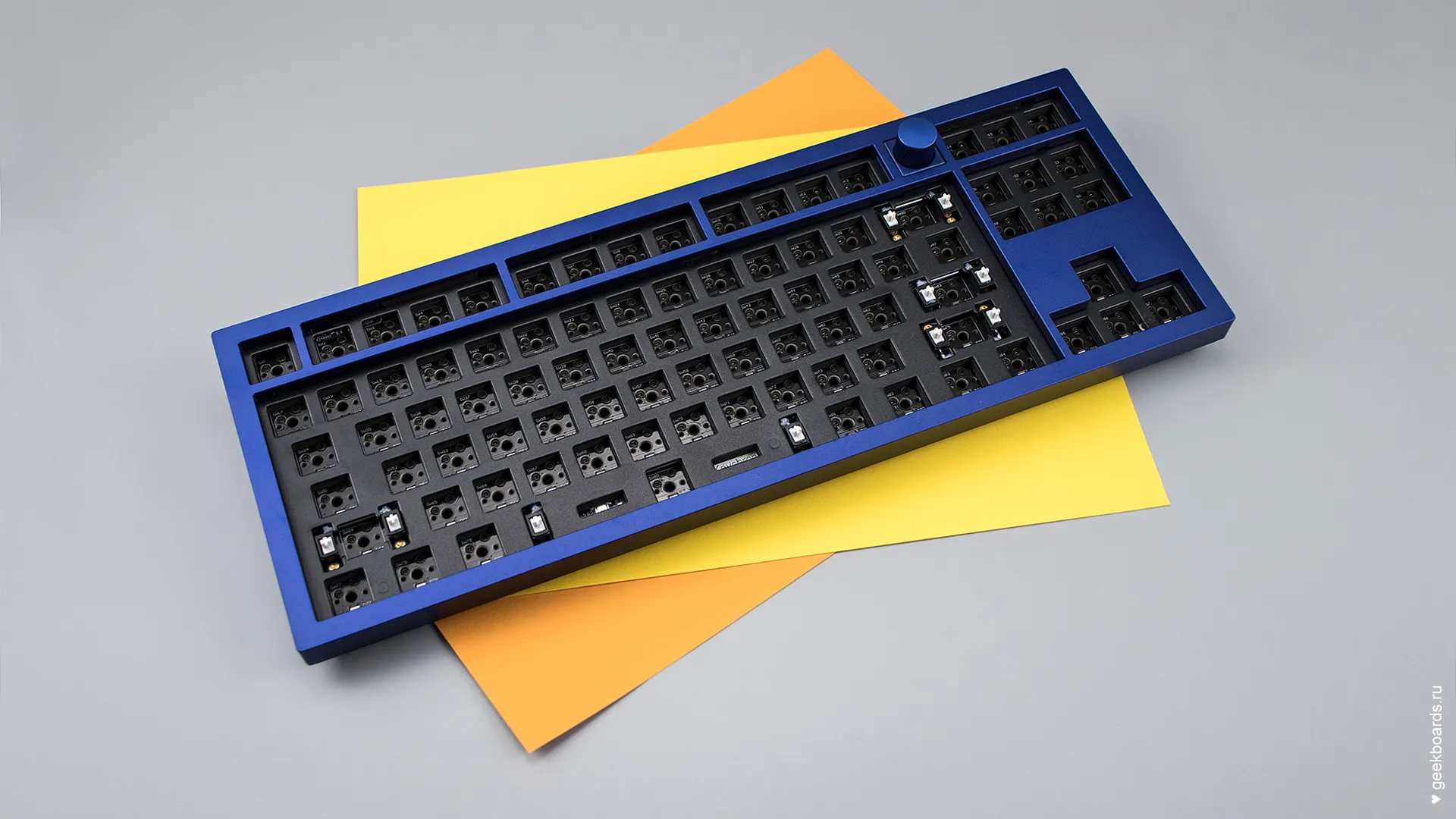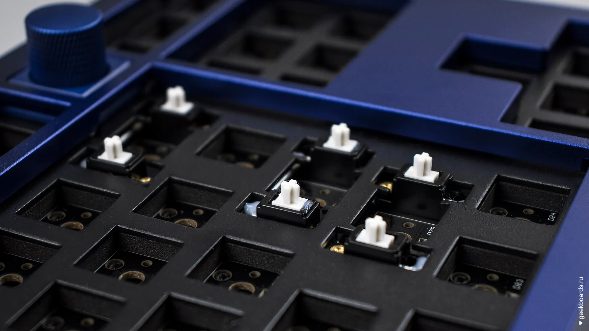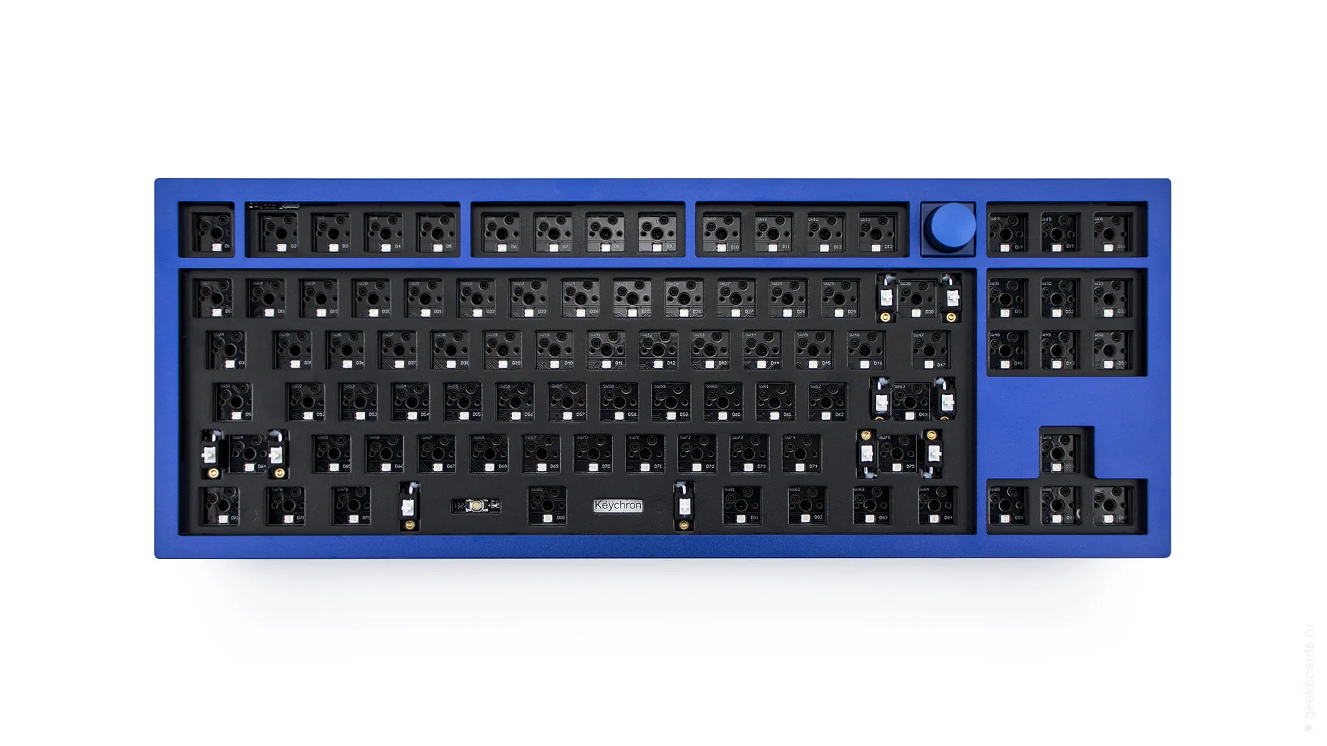 Специальные сокеты позволяют менять переключатели без паяльника. Для этой клавиатуры подходят стандартные Cherry-подобные переключатели.