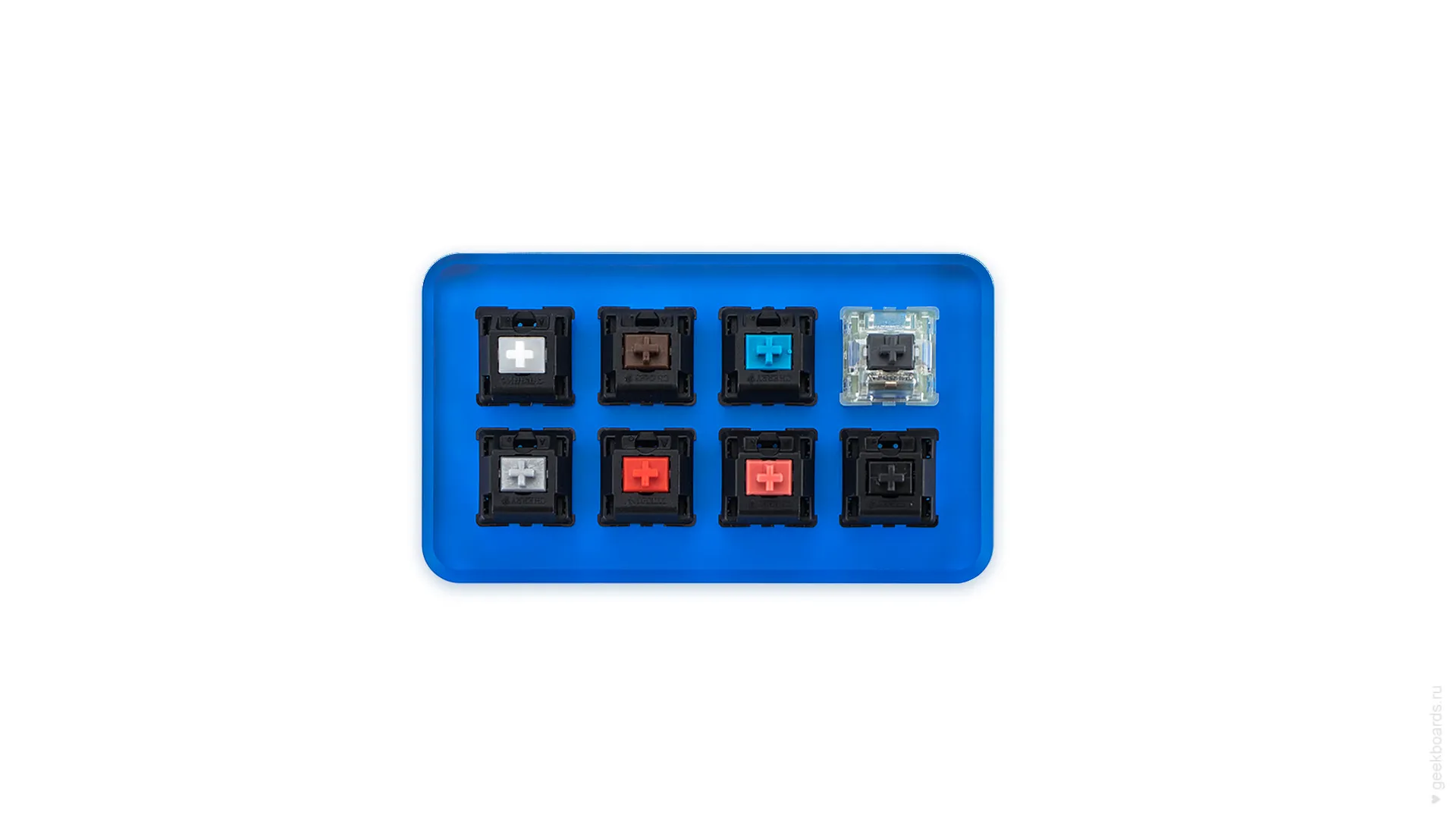 Новая инкарнация тестера переключателей – акриловый корпус синего цвета с 8 разными переключателями Cherry MX (Black, Brown, Blue, Red, Silent Red, Speed Silver, Clear и Silent Black)