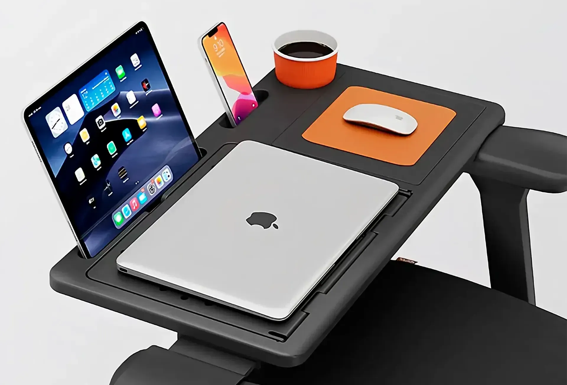 - Многофункциональная поверхность — место для ноутбука и мыши; отдельные слоты для планшета и смартфона; подстаканник.