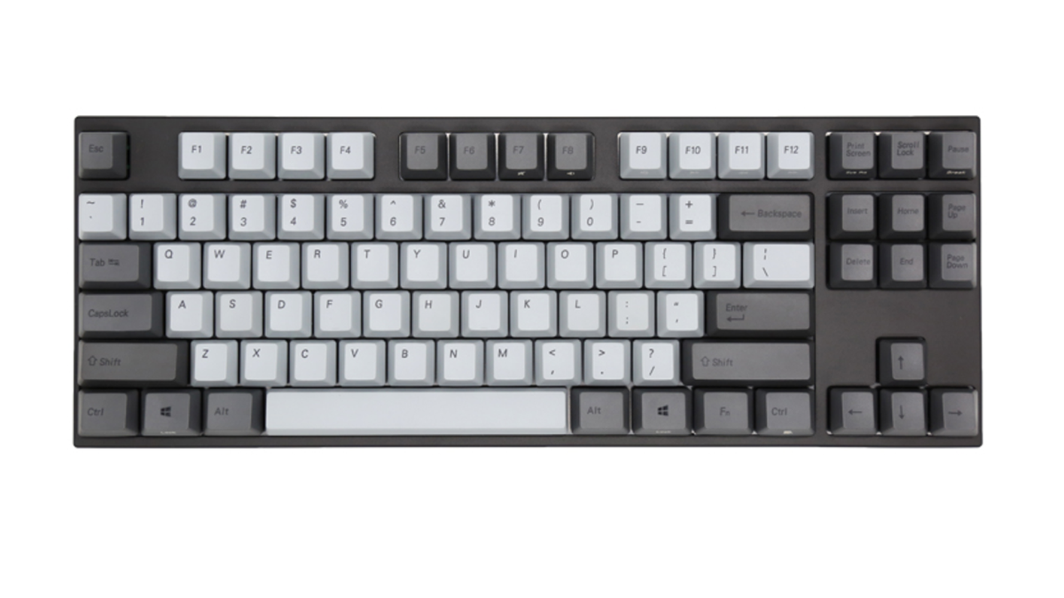 В данной модели основным цветом является холодный белый, почти все клавиши модификаторы представлены в сером цвете, тогда как клавиши shift/ctrl/windows/alt/fn имеют желтый/розово-красный/фиолетовый/голубой/оранжевый цвета соответственно (в комплекте есть дополнительные вышеперечисленные клавиши в сером цвете, а также Caps Lock и Scroll Lock с прорезями под светодиоды). Mini-USB порт спрятан в центре под корпусом, а на самой клавиатуре имеются центральная и две боковые канавки под кабель.