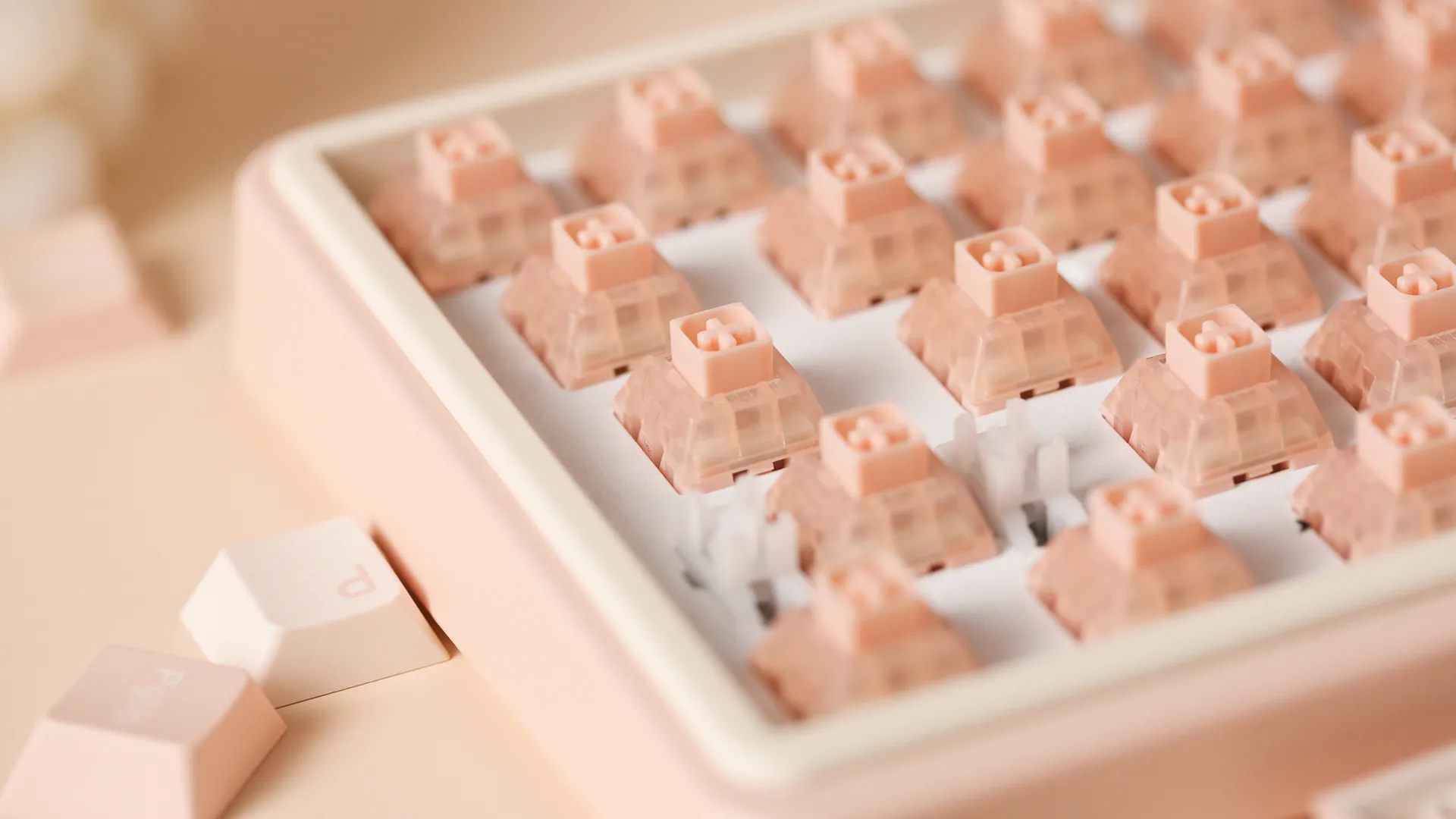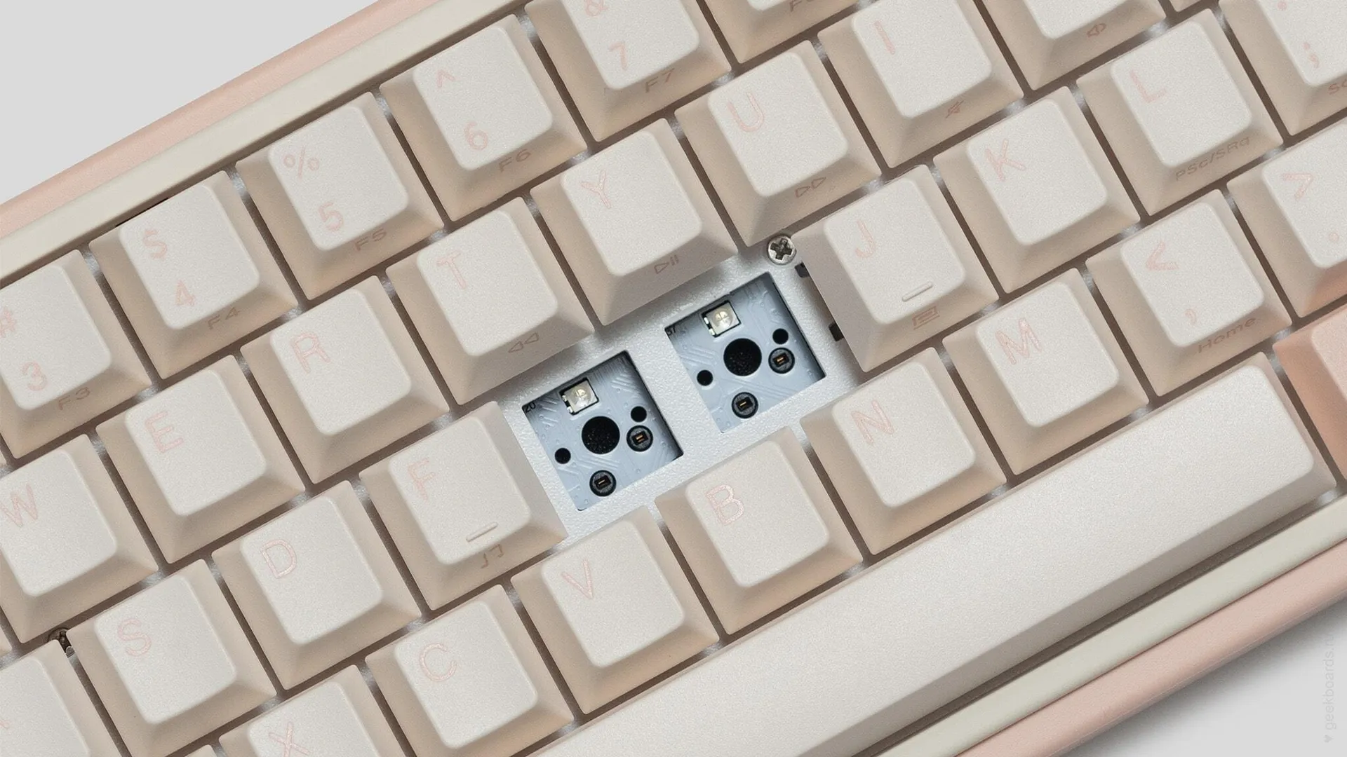 Специальные сокеты позволяют менять переключатели без паяльника. Для этой клавиатуры подходят стандартные Cherry-подобные переключатели.
