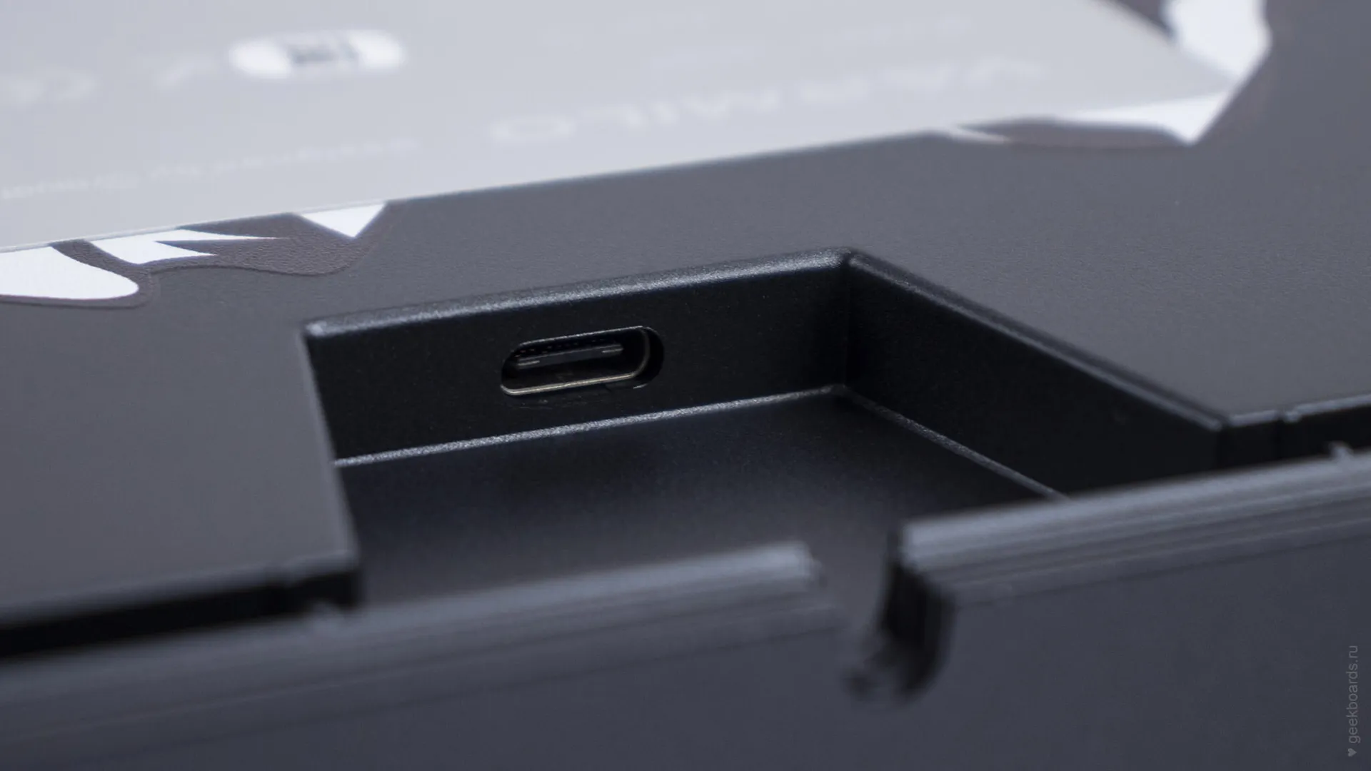 В обновлённой версии клавиатура получила USB Type-C порт вместо Mini-USB. Он спрятан в центре под корпусом, а на самой клавиатуре имеются центральная и две боковые канавки под кабель.