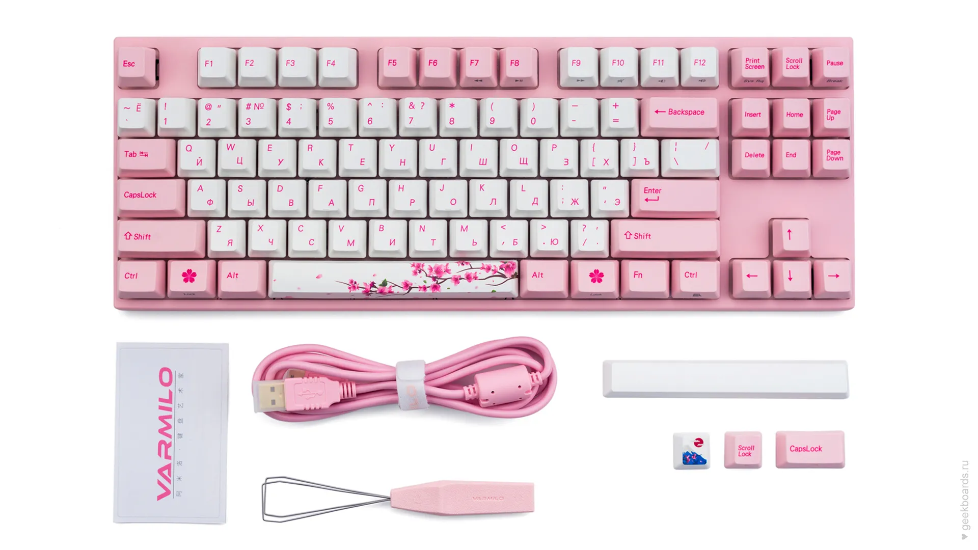 - Varmilo wire keycap puller – позволит легко снять клавиши с клавиатуры;