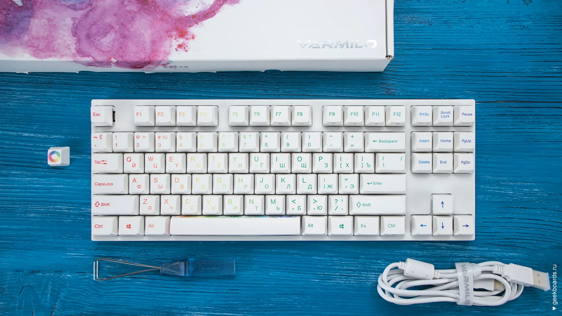 - Varmilo wire keycap puller – позволит легко снять клавиши с клавиатуры;