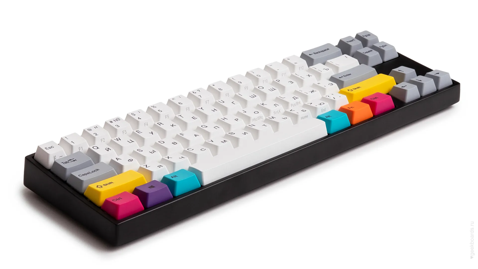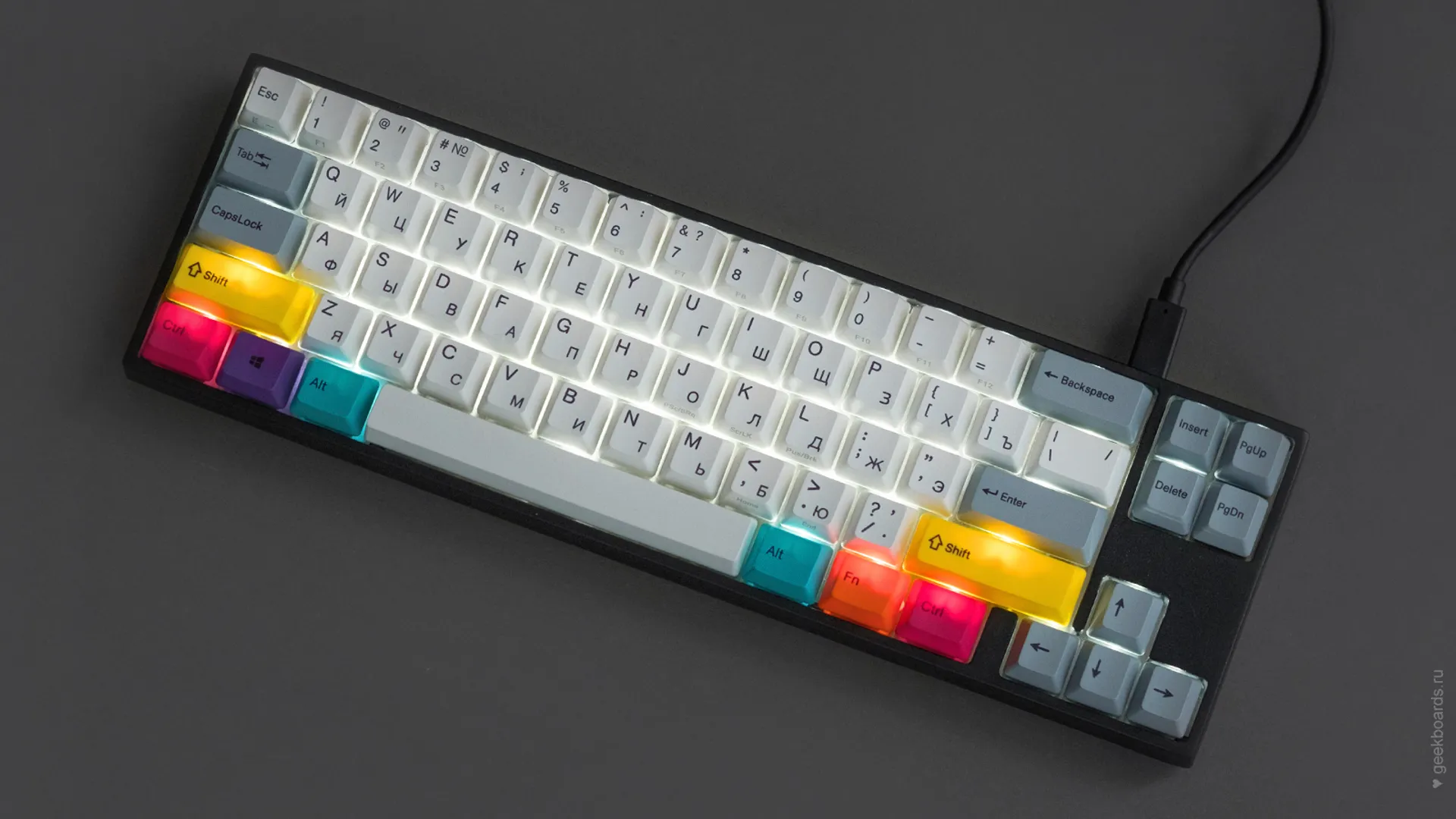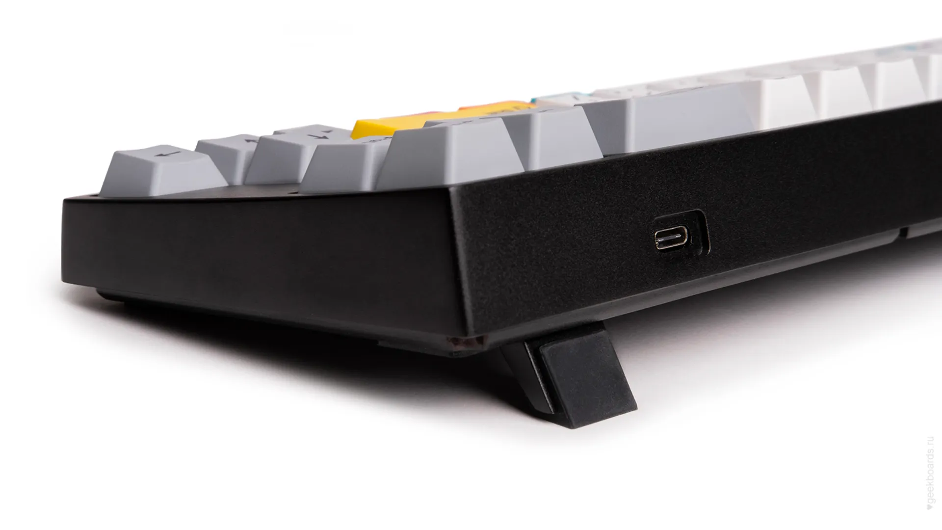 В данной модели основным цветом является холодный белый, почти все клавиши модификаторы представлены в сером цвете, тогда как клавиши shift/ctrl/windows/alt/fn имеют желтый/розово-красный/фиолетовый/голубой/оранжевый цвета соответственно. Корпус выполнен из качественного алюминия, за счет чего он довольно увесистый и лежит на столе как влитой. USB Type-C порт вынесен на верхний правый торец клавиатуры, поэтому если вы часто носите клавиатуру с собой, подключение и отключение клавиатуры будет мгновенным и без лишней возни.