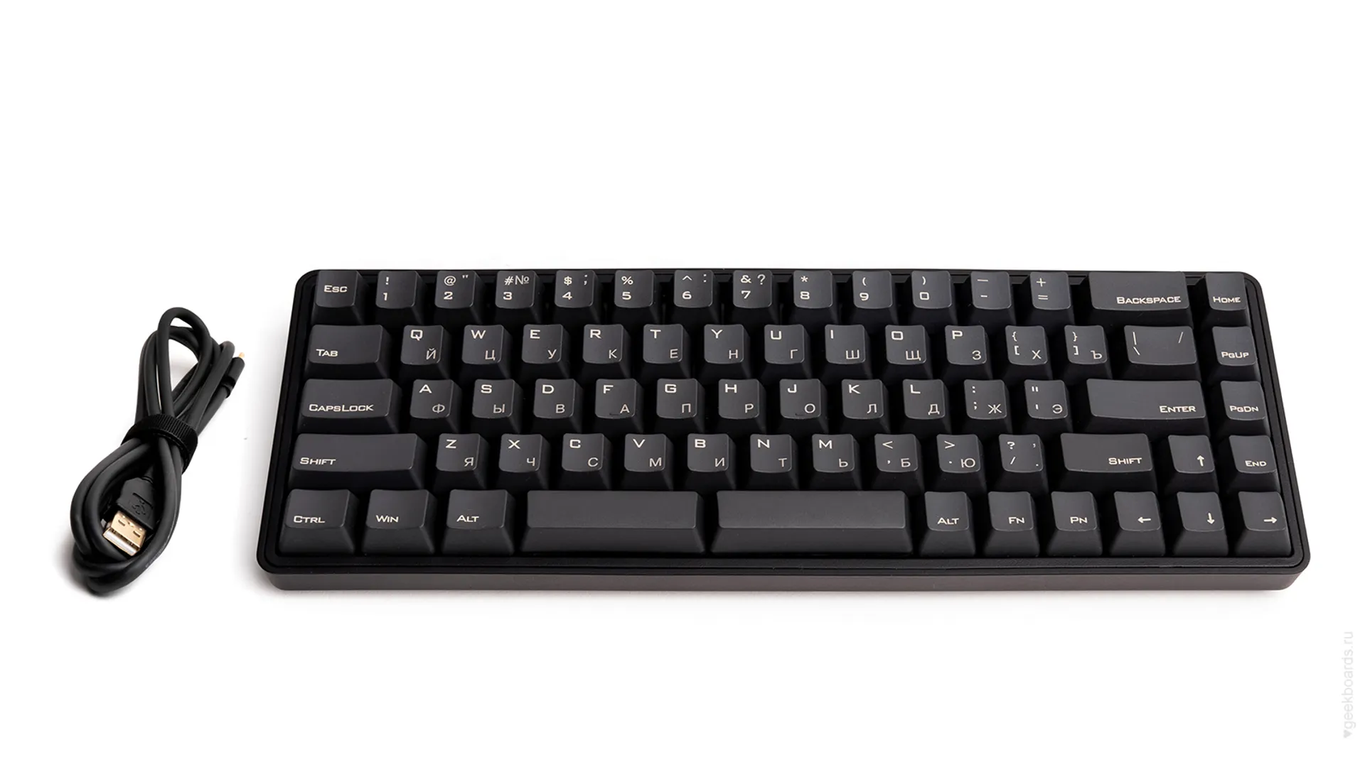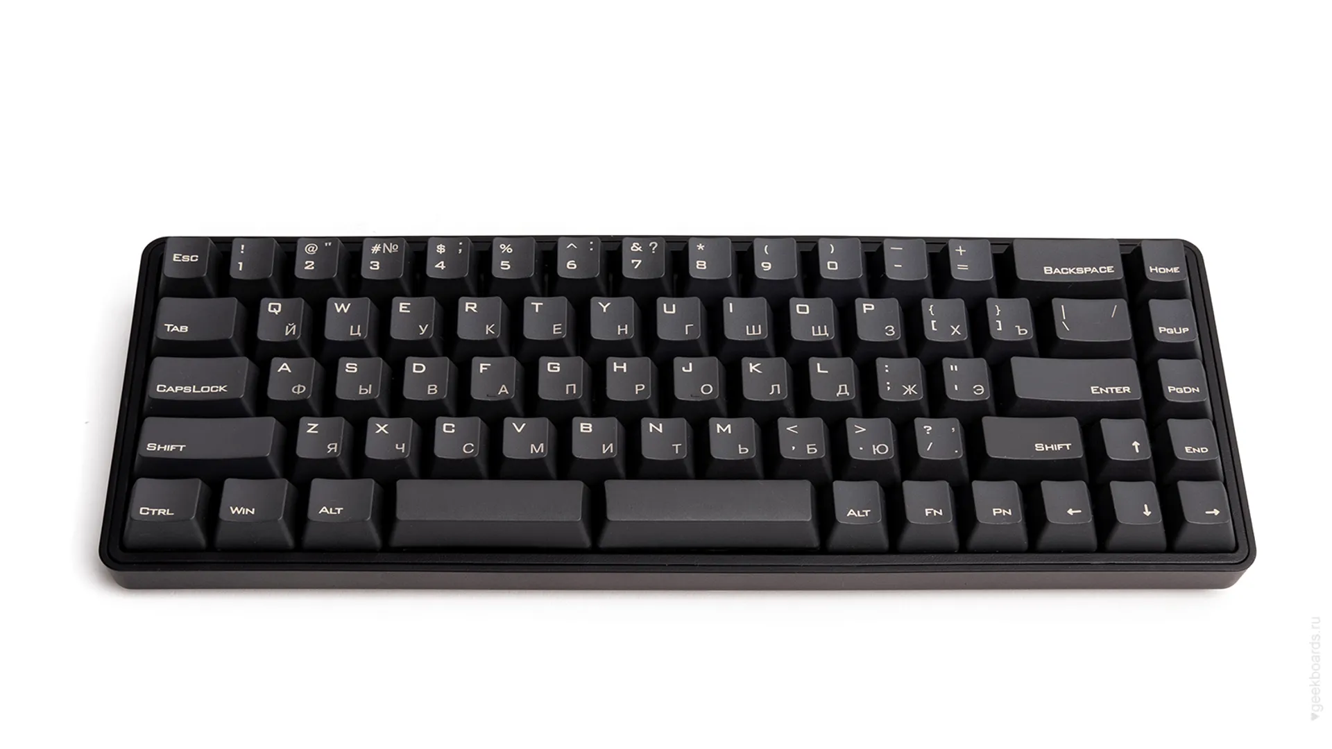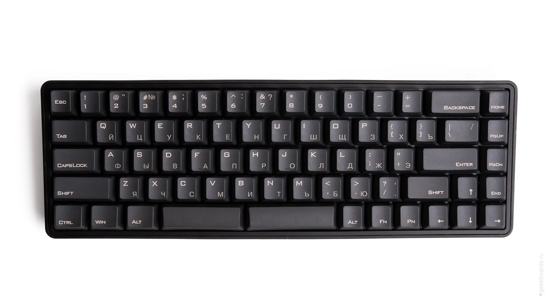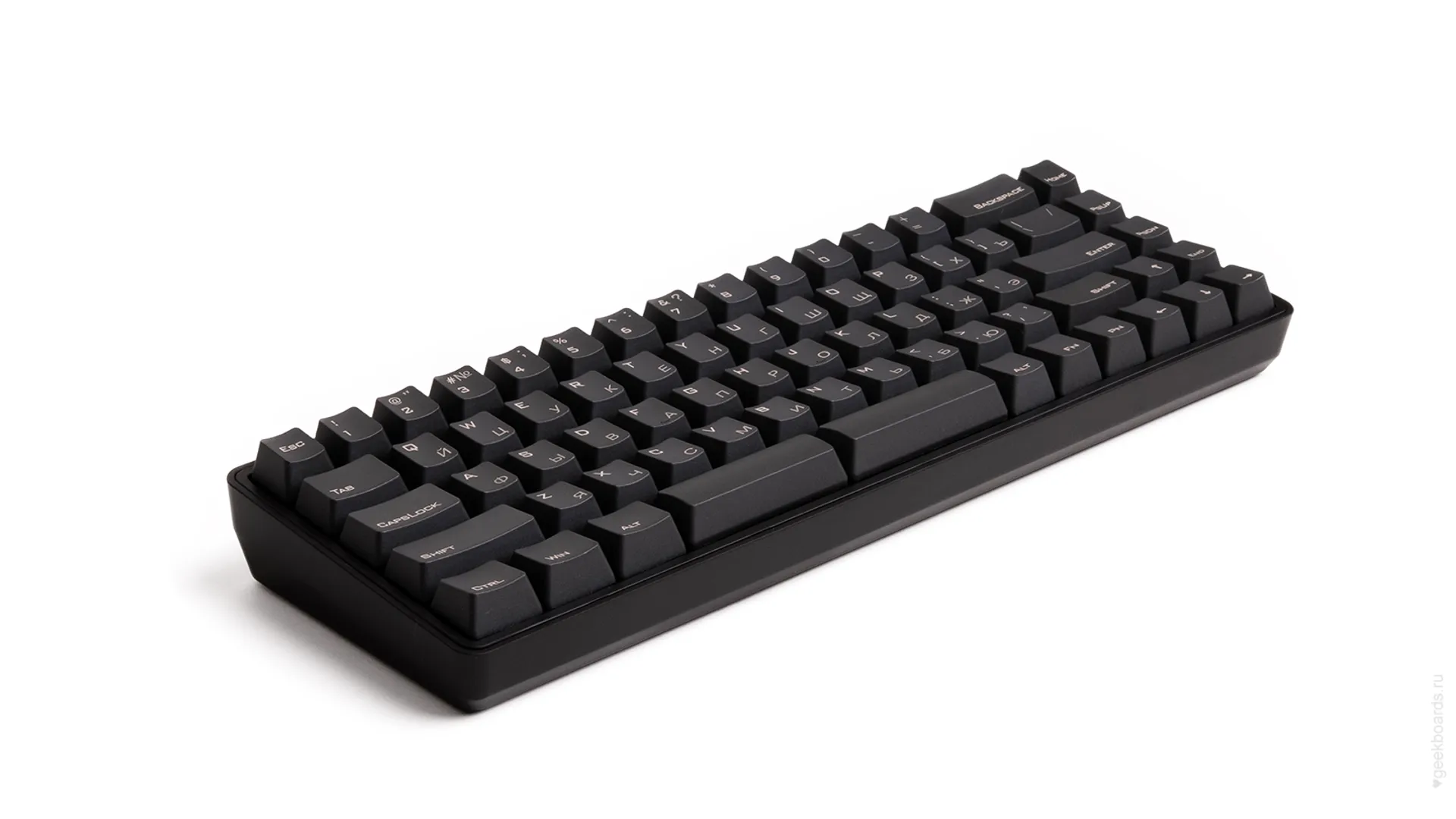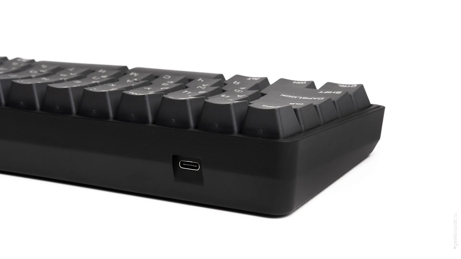 Данная модель является представителем 65% семейства, черная расцветка с белыми символами впишется в любое окружение, а программируемость клавиатуры в сочетании с двойным пробелом и удобным расположением навигационных клавиш (стрелки, pgup и т.д.) идеально подойдет как тем, кому часто нужно работать с текстом, так и геймерам, которые хотят по максимуму использовать возможности своей клавиатуры. USB Type-C порт вынесенный на левый верхний торец клавиатуры в сочетании с компактным размером и небольшим весом будет огромным плюсом для людей, которые часто носят клавиатуру с собой.